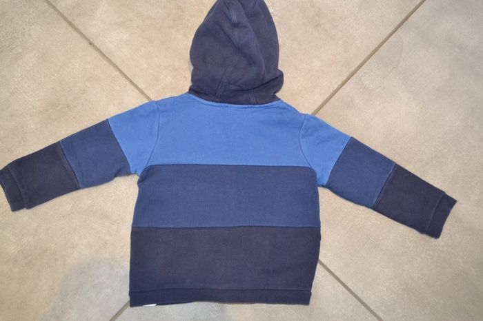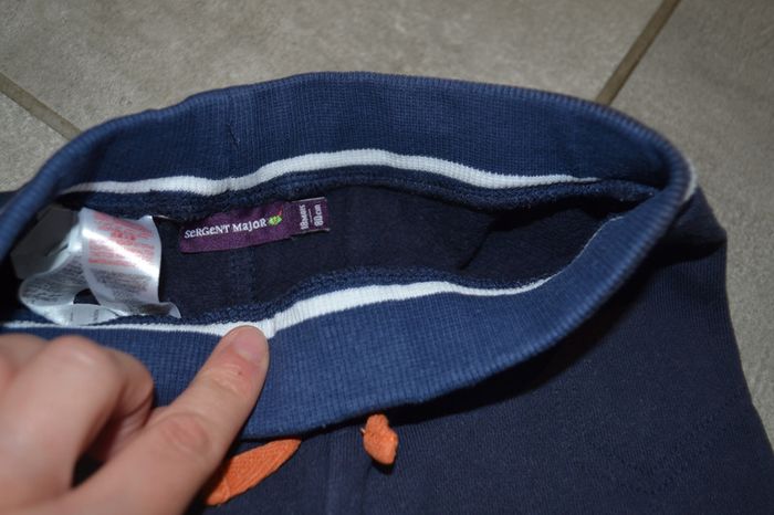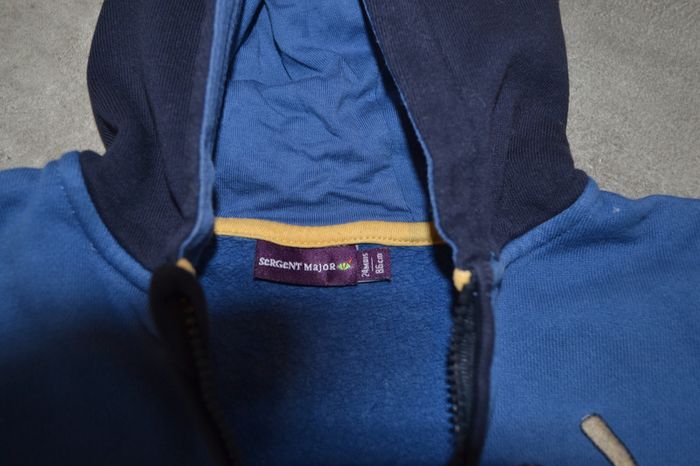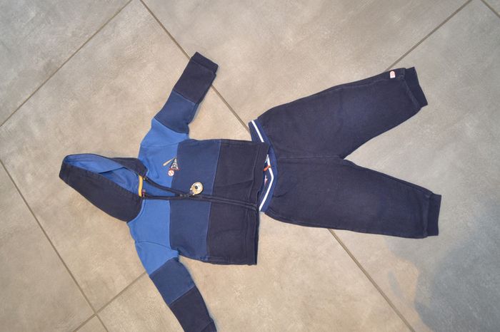 Gilet zippé camaïeux de bleus Sergent major 2 ans Gilet zippé 3 bandes de bleu, broderie poitrine, badge tête de tigre sur le zip, capuche Légèrement bouloché. A coordonner avec le pantalon jogging (attention taille 18 mois) 62%CO 38%PES Pantalon jogging Sergent major 18 mois Taille élastiquée, séré à la taille par un cordon. Tissu bouloché. A coordonner avec le gilet zippé (attention taille 24 mois) 100%CO
