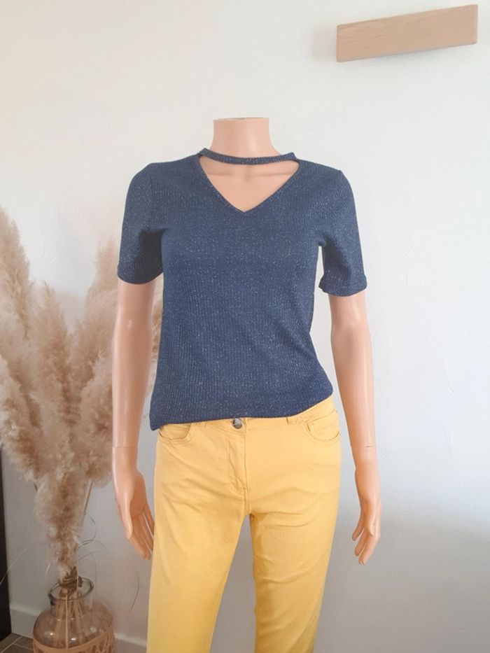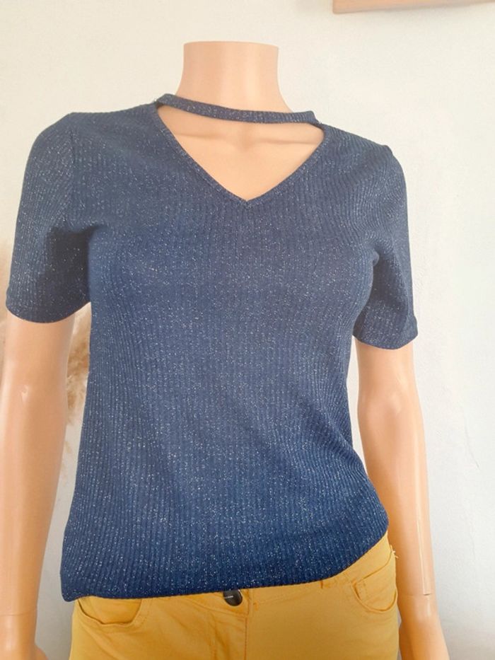Petit top fluide de couleur bleu pailleté. Taille M.
