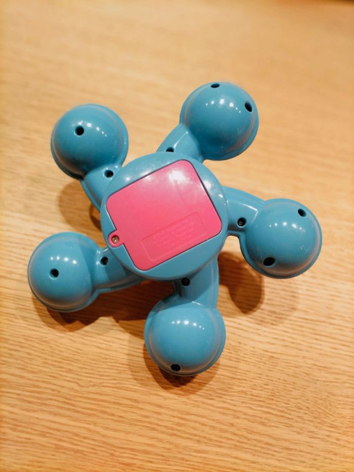 Jouet, adressé au premier âge, en forme d'étoile à 5 branches, avec un système de mini ventilateur qui fait se déplacer chacun des éléments dans les 5 branches de l'étoile... Il faut orienter la bouche du ventilateur en face du bon élément m, pour le faire tourner : principe d'action réaction. De plus l'étoile tourne sur elle-même comme une grosse toupie... Très solide, fonctionne avec deux piles type LR14 fournies. Jouet en bon état, voire très bon état, quelques marques de frottements d'usage.