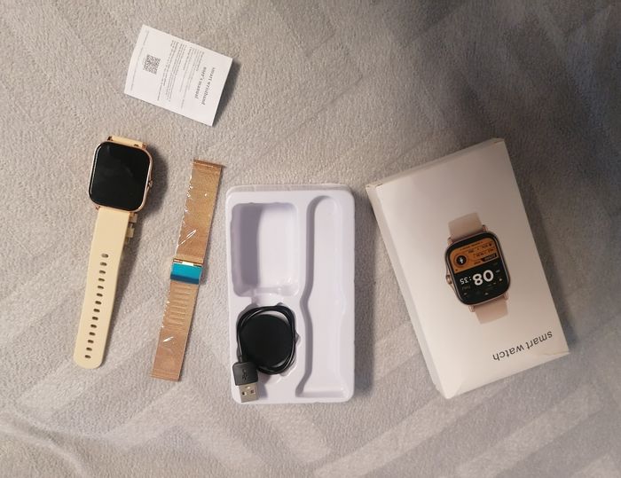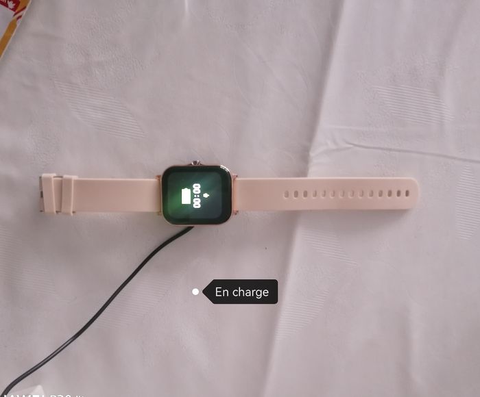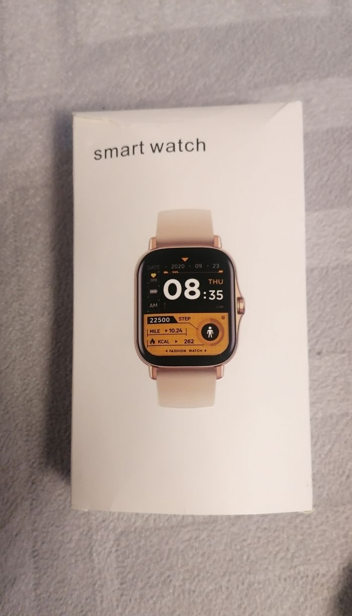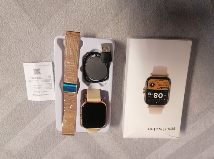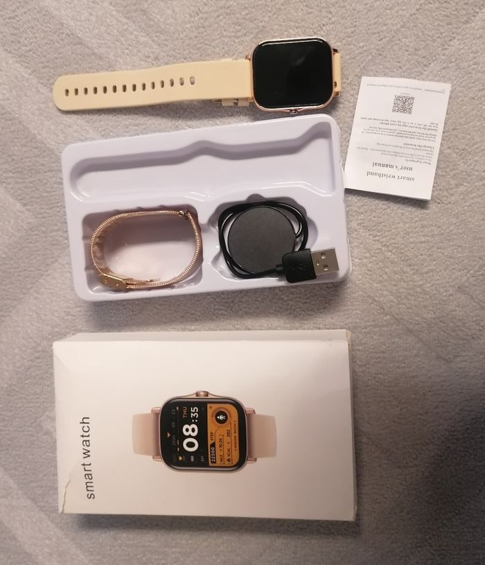 montre connectée pour femme Connectée avec le téléphone portable, avec différents modes: appels, météo, notifications, photos... 2 bracelets avec : Un doré, un beige en silicone. Accessoires : chargeur et notice. Dans sa boîte d'origine, ouvert pour prendre des photos. 40€ Envois uniquement en colissimo via beebs