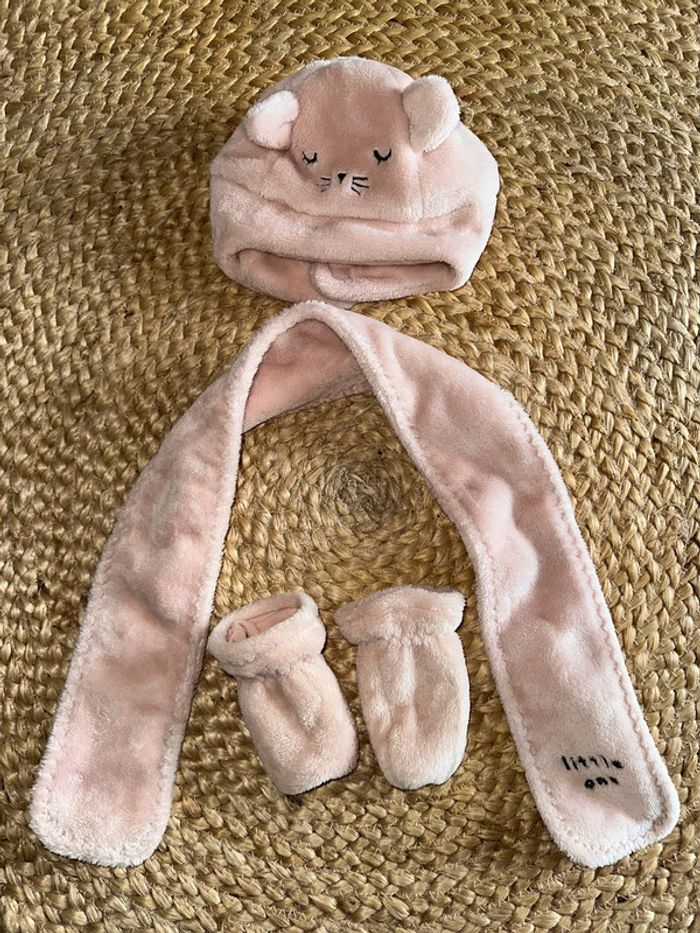 Bonnet moufles écharpe rose Tour de tête 47