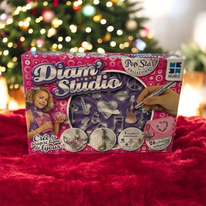 Diam Studio Pop star de Megableu te permet de créer ta propre collection de bijoux sur le thème de la musique, pour être la plus belle et la plus branchée ! Avec les feutres «effet diamant » (saphir, diamant rose, émeraude, rubis, topaze), décore les modèles selon ta créativité. En choisissant parmi les accessoires fournis, les modèles se transforment en collier, bracelet, bague et broche. Contient également des supports adhésifs pour personnaliser sacs, agendas, ceintures….