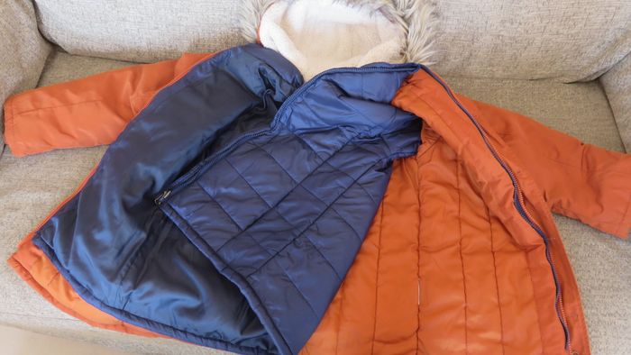 Parka déferlante avec petite doudoune matelassée amovible, capuche doublée sherpa, 2 grandes poches qui ferment.