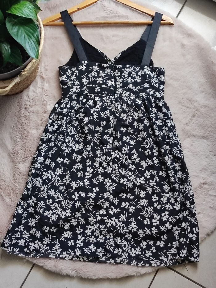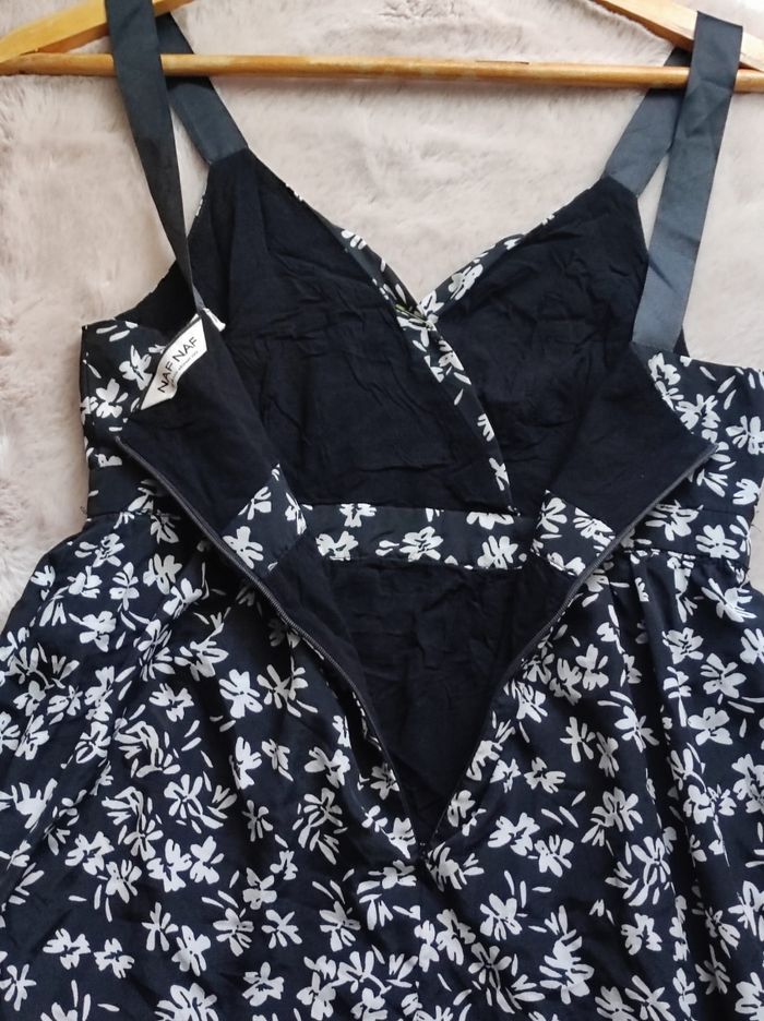 petite robe imprimée à fleurs blanches sur fond noire de la marque nafnaf en taille 34 ( XXS). À bretelles et décolleté croisés ouvert, fermeture éclair à l'arrière, intérieur doublé. Ceintré sous poitrine. Peu porter.