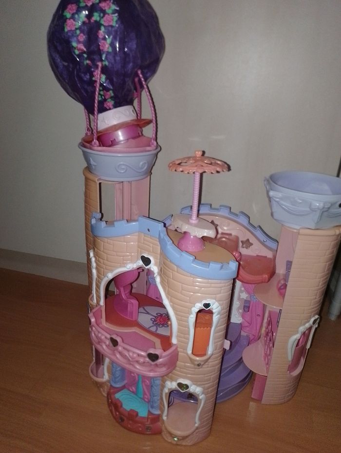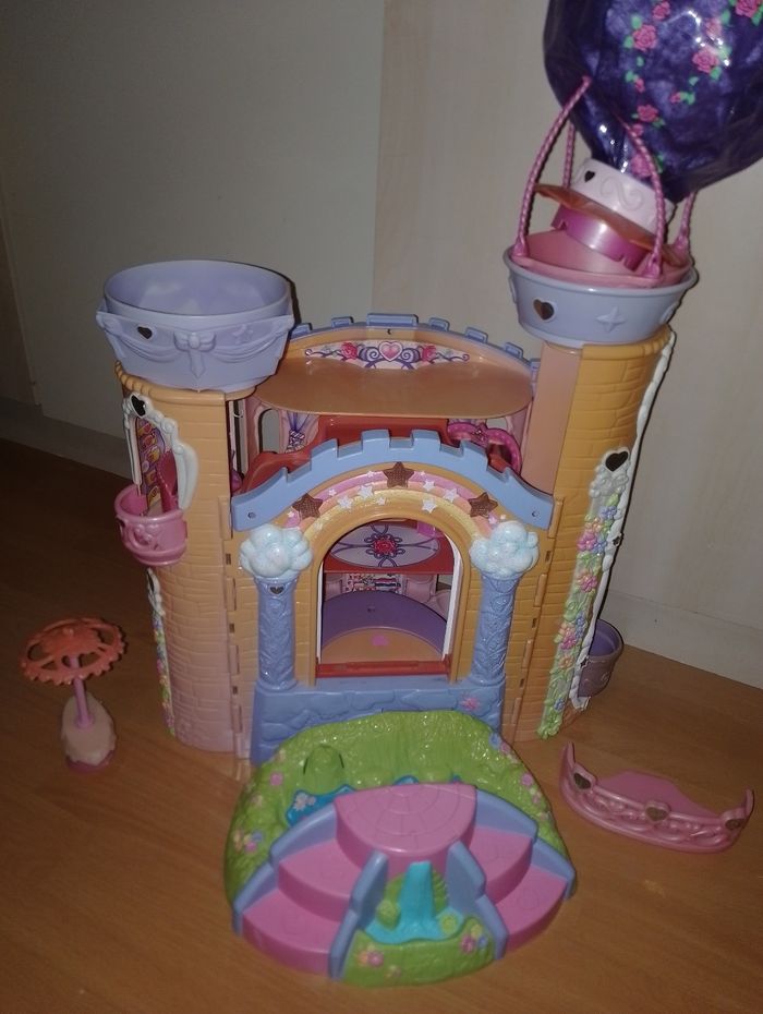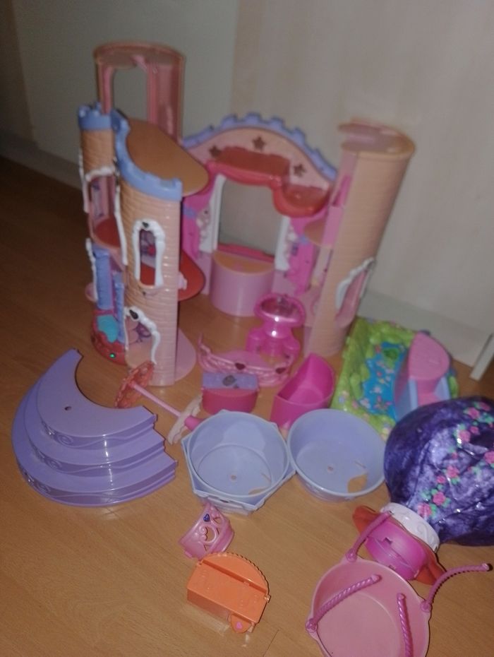 Château " My little Pony " avec quelques accessoires Mon petit poney (S'illumine et fait de la musique mais ne fonctionne plus à réparer) mais on peut tout de même jouet avec. les branches de la montgolfière sont cassée se referme pour gagné de la place