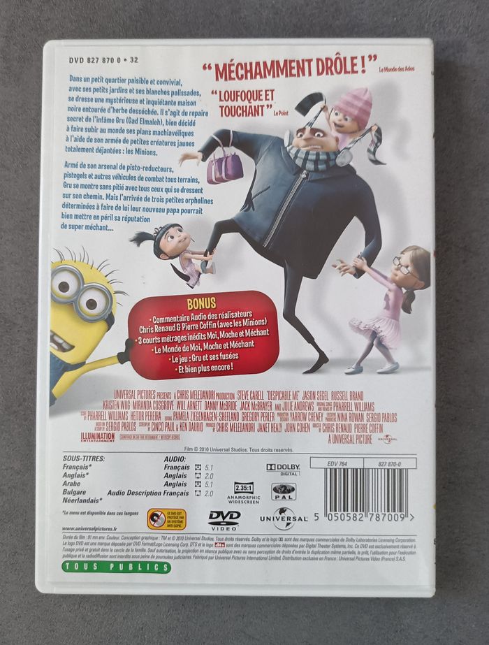 ETAT IMPECCABLE. DVD. MOI, MOCHE ET MECHANT. SUPER MECHANT, SUPER MARRANT. DANS UN PETIT QUARTIER PAISIBLE ET CONVIVIAL, AVEC SES PETITS JARDINS ET SES BLANCHES PALISSADES, SE DRESSE UNE MYSTERIEUSE ET INQUIETANTE MAISON NOIRE ENTOUREE D'HERBE DESECHEE. IL S'AGIT DU REPAIRE SECRET DE L'INFAME GRU (GAD ELMALEH), BIEN DECIDE A FAIRE SUBIR AU MONDE SES PLANS MACHIAVELIQUES A L'AIDE DE SON ARMEE DE PETITES CREATURES JAUNES TOTALEMENT DEJANTEES : LES MINIONS. ARME DE SON ARSENAL DE PISTO-REDUCTEURS, PISTOLETS ET AUTRES VEHICULES DE COMBAT TOUS TERRAINS, GRU SE MONTRE SANS PITIE AVEC TOUS CEUX QUI SE DRESSENT SUR SON CHEMIN. MAIS L'ARRIVEE DE TROIS PETITES ORPHELINES DETERMINEES A FAIRE DE LUI LEUR NOUVEAU PAPA POURRAIT BIEN METTRE EN PERIL SA REPUTATION DE SUPER MECHANT... BONUS : * COMMENTAIRE AUDIO DES REALISATEURS CHRIS RENAUD & PIERRE COFFIN (AVEC LES MINIONS) * 3 COURTS METRAGES INEDITS MOI, MOCHE ET MECHANT * LE MONDE DE MOI, MOCHE ET MECHANT * LE JEU : GRU ET SES FUSEES * ET BIEN PLUS ENCORE ! ENVOI SOUS 24 / 48 HEURES. REMISE EN MAIN PROPRE. gil