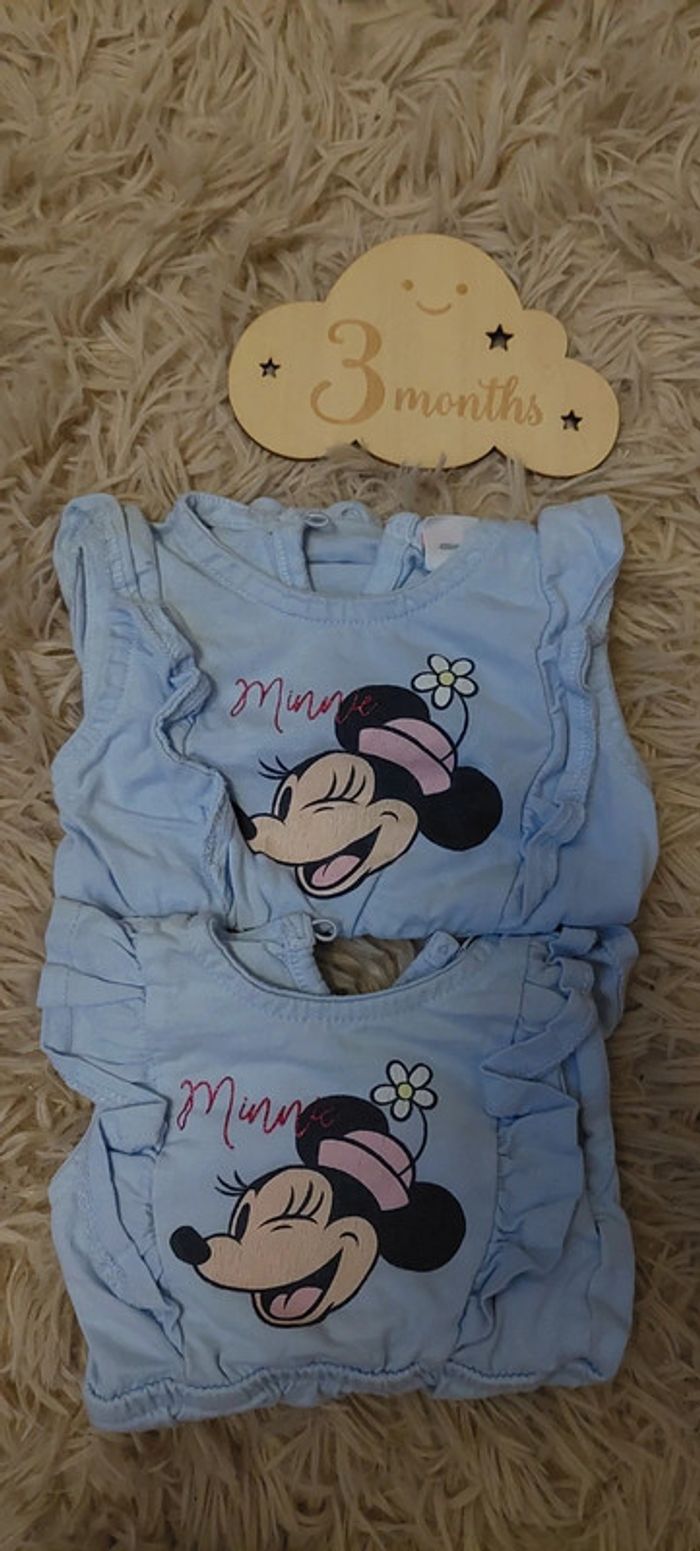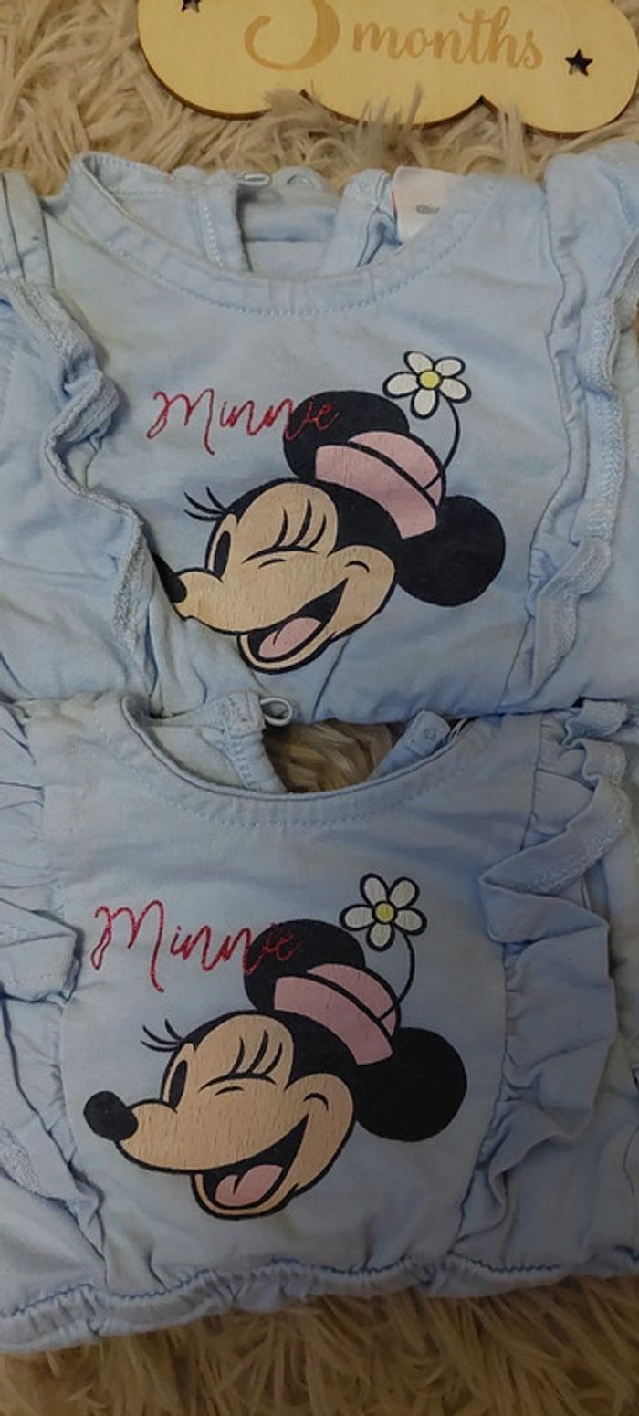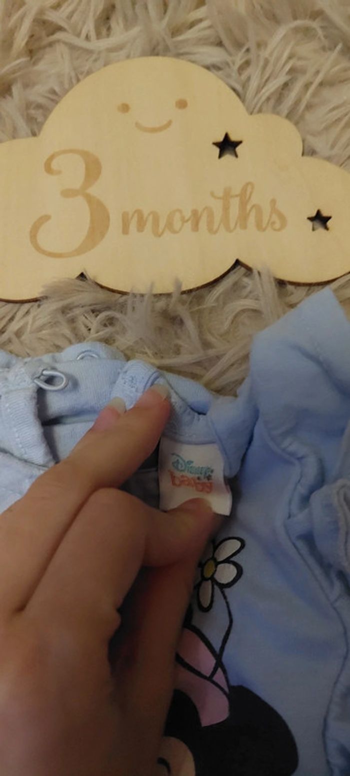 Très bon état. Flocage légèrement craqué. Un en taille 3 mois et un en taille 1 mois. Il y a très peu de différence de taille. Marque Disney baby.