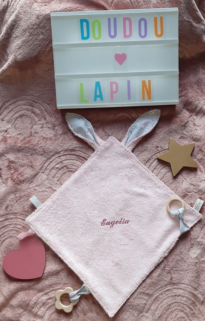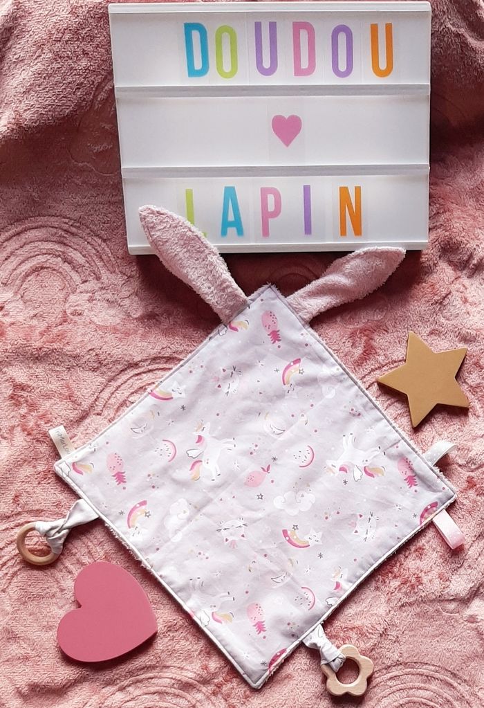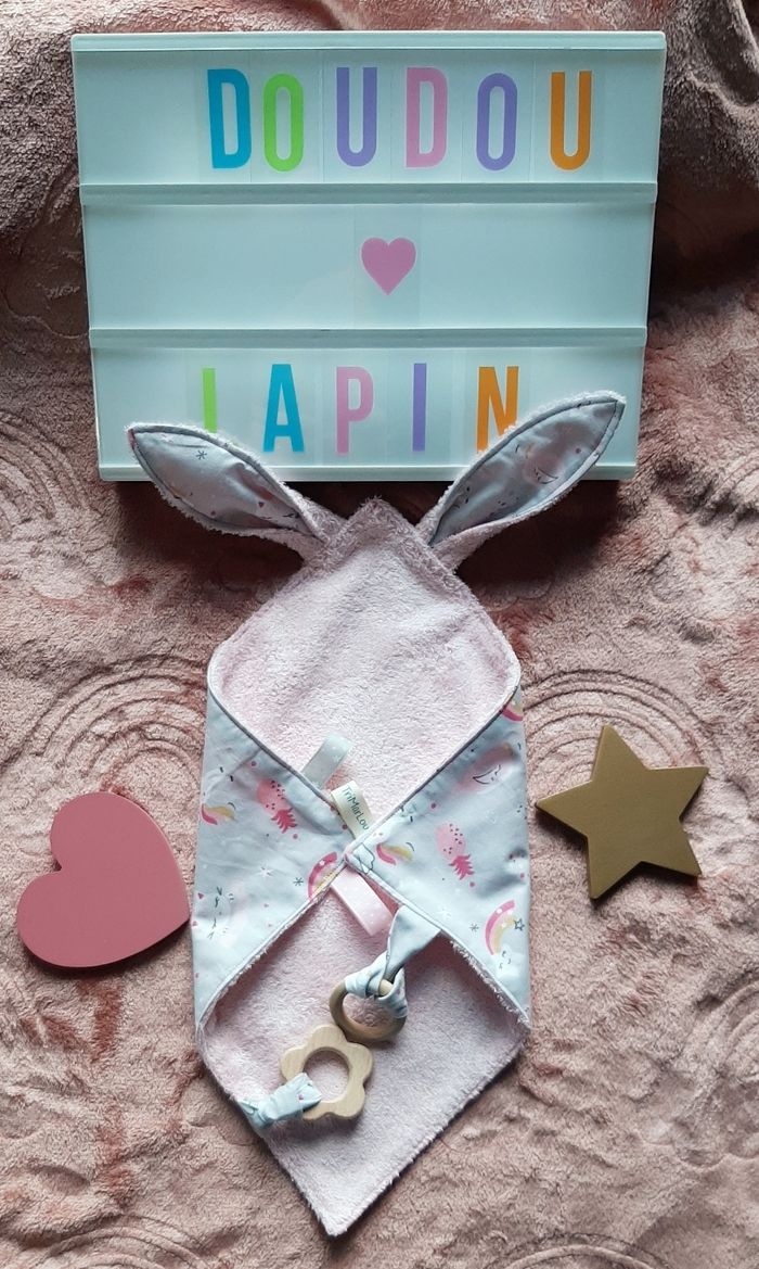 Cap sur TriMarLou vous présente son doudou Lapinou avec attache tétine, anneau de dentition et pouet pouet dans l'oreille. Bébé l'adore !!! Pièce unique faite main avec du tissu bio et certifié oeko tex. Tissu à motif: coton Tissu doublure: éponge bambou Dimension : carré d'environ 30 cm Lavage en machine 30 ° Pas de sèche linge. Artisan déclaré, pas de retour, pas de négociation. Différents tissus sont disponibles, n'hésitez pas à demander plus de renseignements