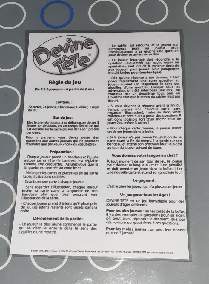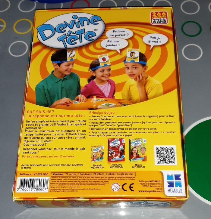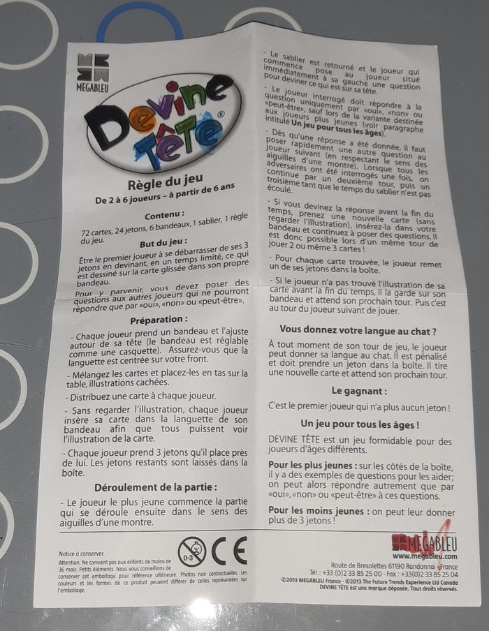 Jeu devine tête Mega bleu Des 6 ans Quasi neuf Complet La règle du jeu a été colorié à 2 endroits (voir photo) J'ai remis une règle du jeu imprimé que j'ai plastifié (voir photo) Très bon état