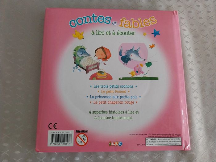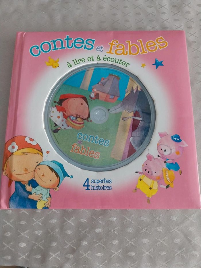 Livre 4 contes et fables avec cd ( cd testé) Seul "défaut" sur le cd l'ordre des histoires est différent, c'est d'abord le petit poucet puis la princesse au petit pois et non l'inverse comme écrit dans le sommaire Autrement tout est OK Possible de masquer le petit mot par un bel autocollant