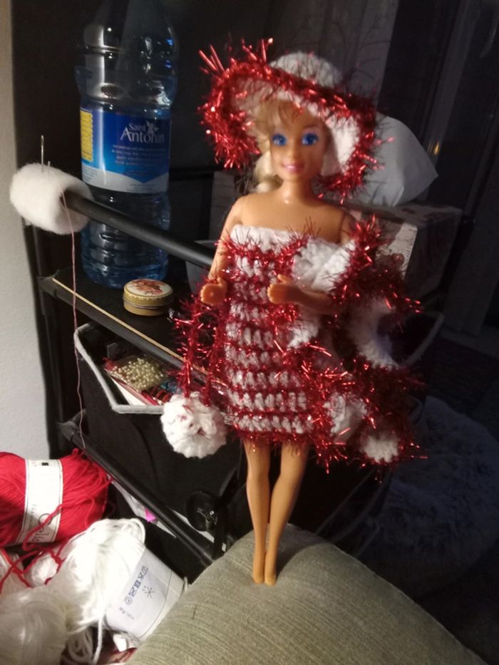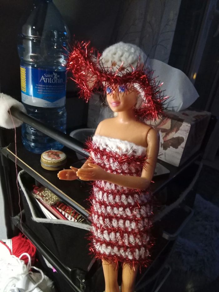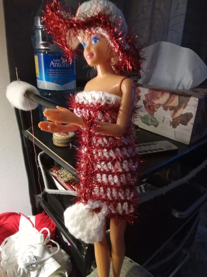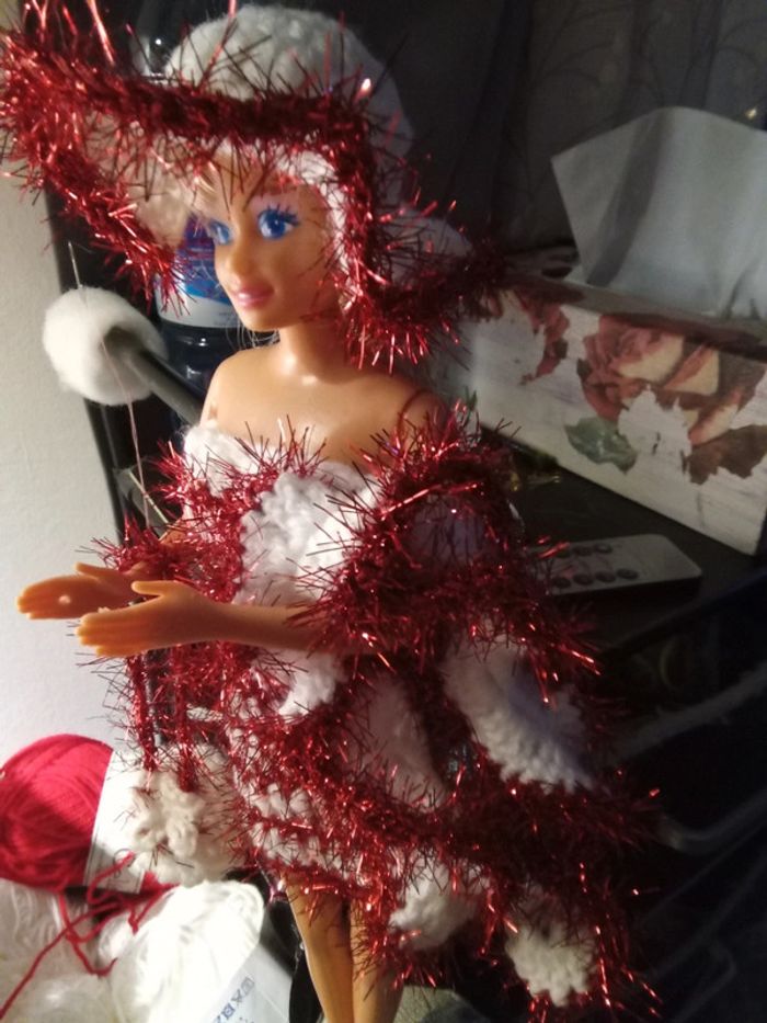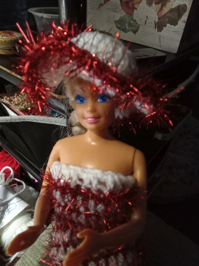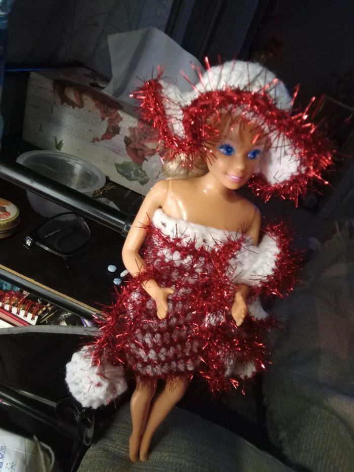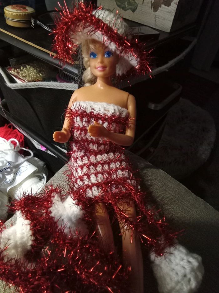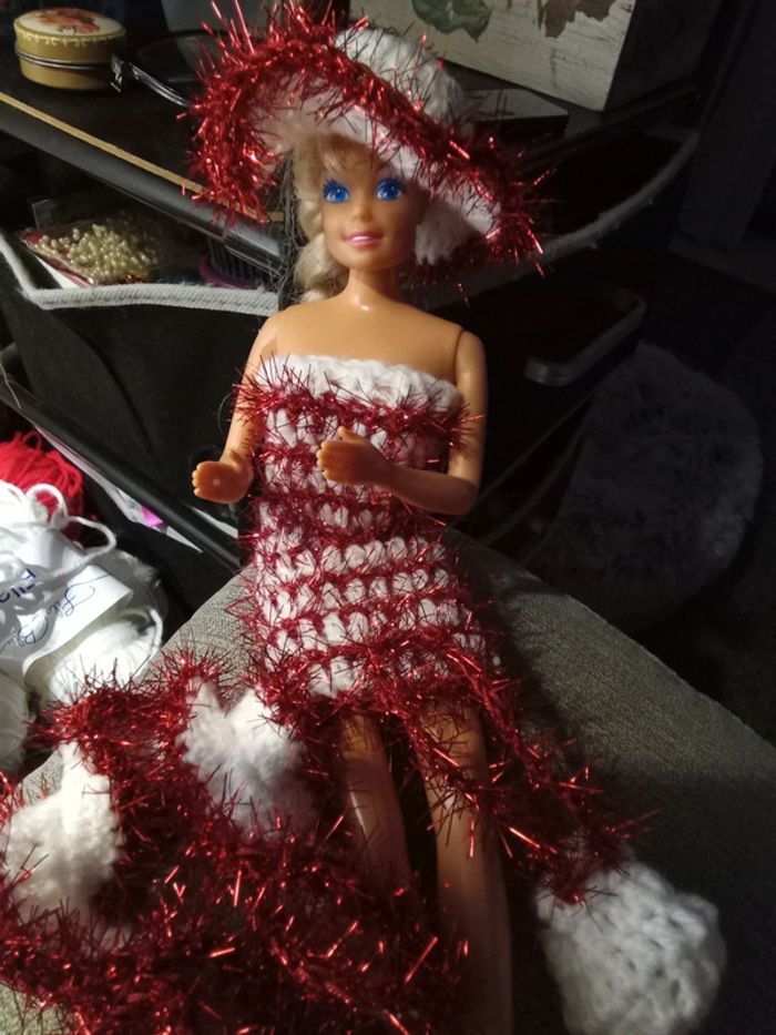 Barbie habillée :robe Noël, châle, chapeau, sac à main. Fait main par moi.cette barbie n'est pas à vendre.