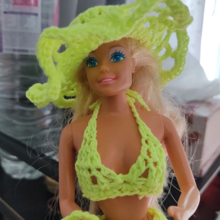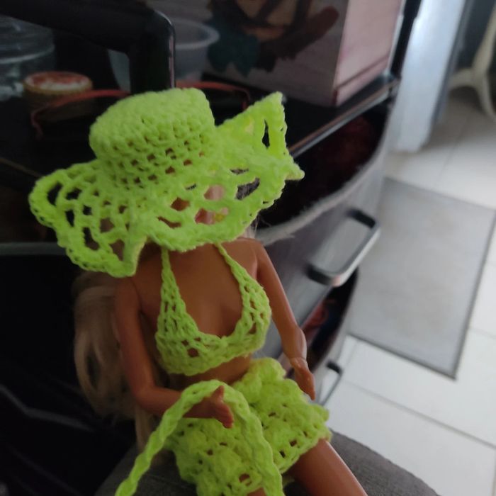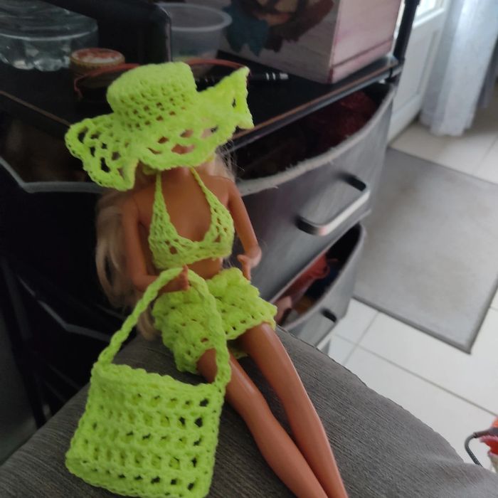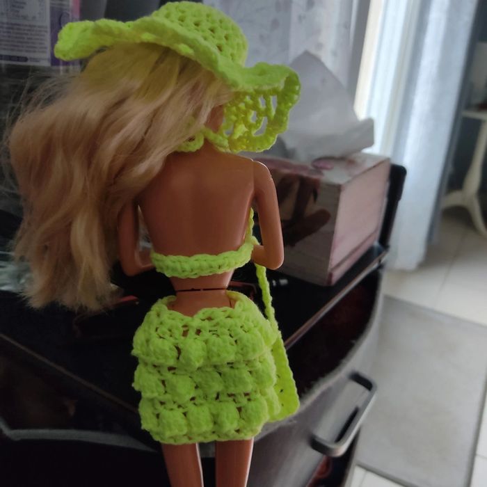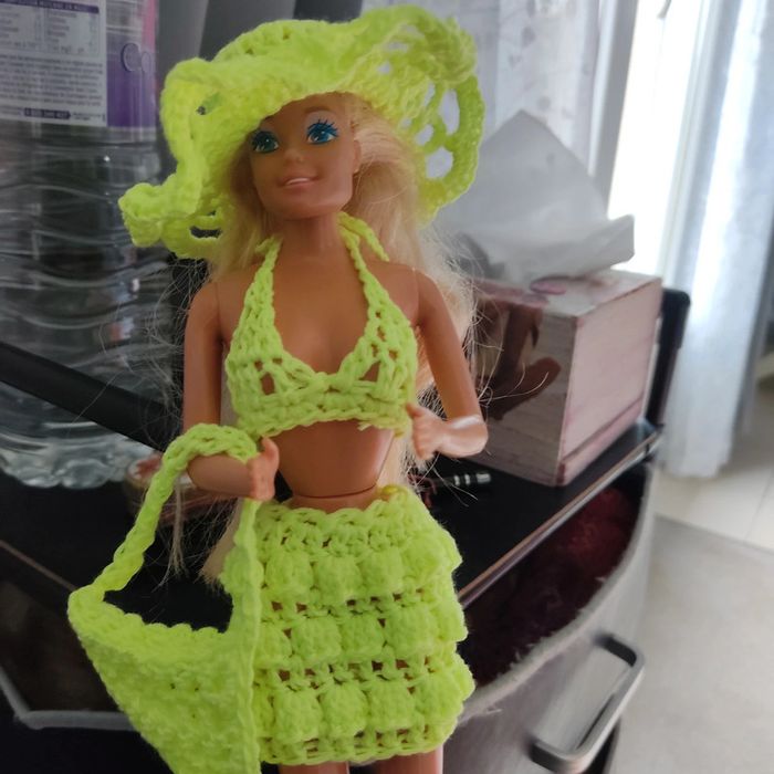 Barbie habillé :jupe, haut, chapeau, sac à main. Fait main par moi cette Barbie n'est pas à vendre.le dressing derrière Barbie est en vente dans mon dressing.