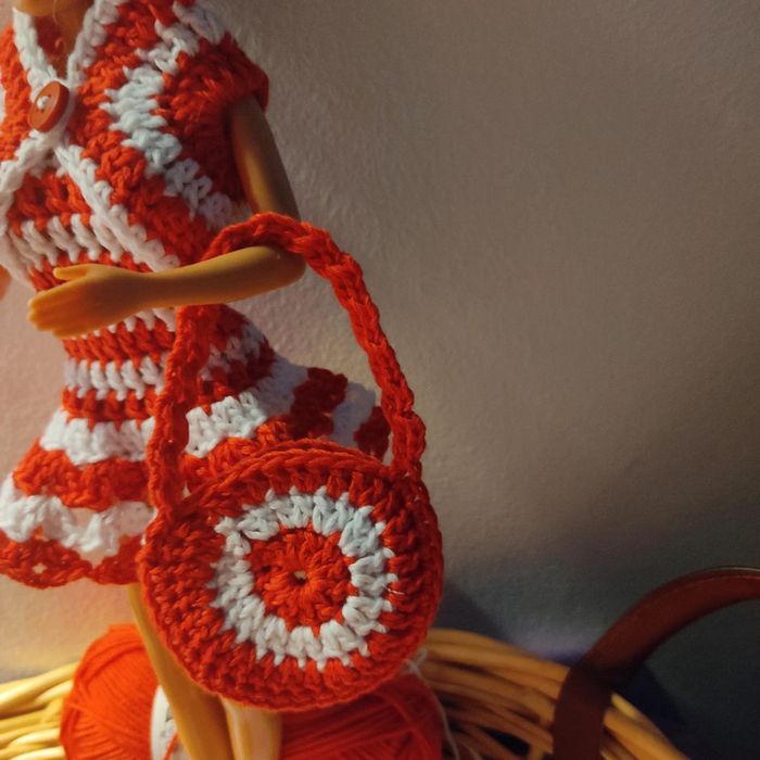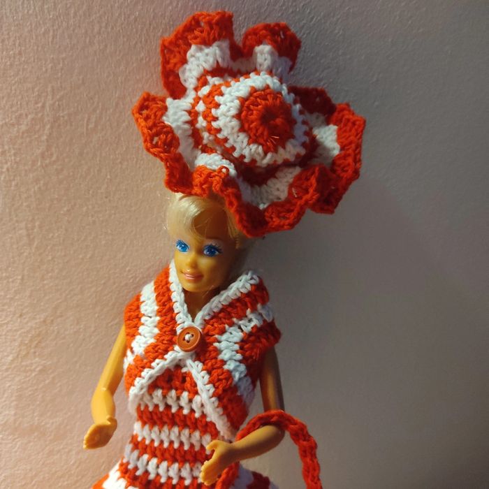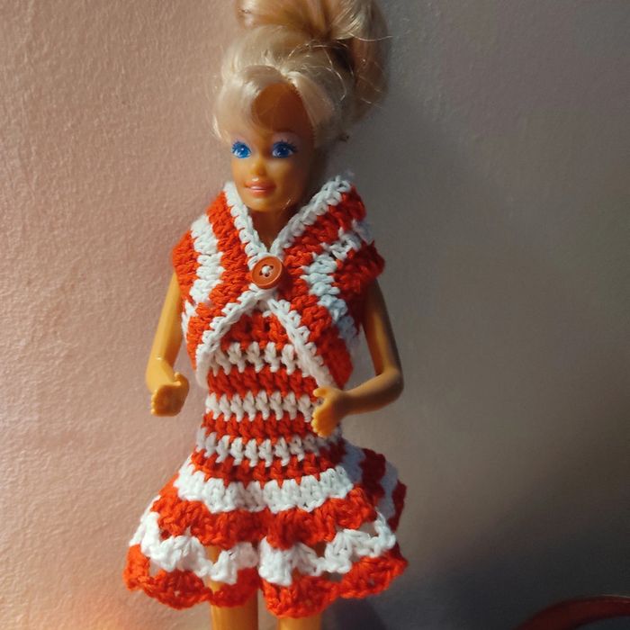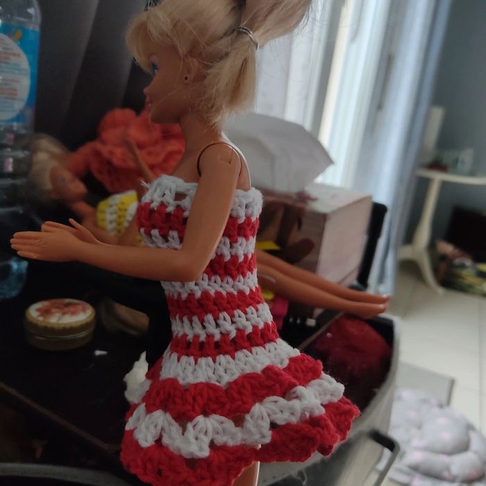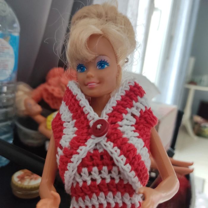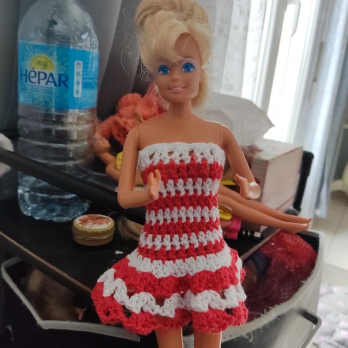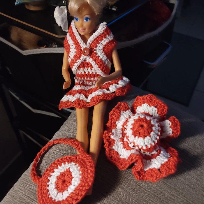 Barbie habillé : robe ou jupe, boléro, chapeau, sac à main fait main par moi cette Barbie n'est pas à vendre.rouge et blanc.