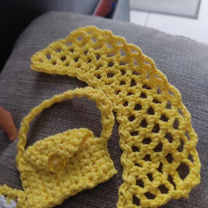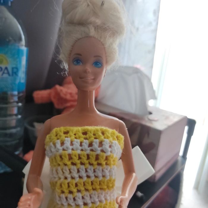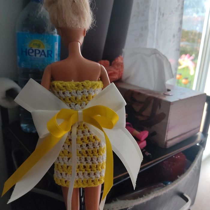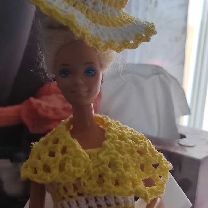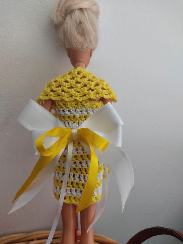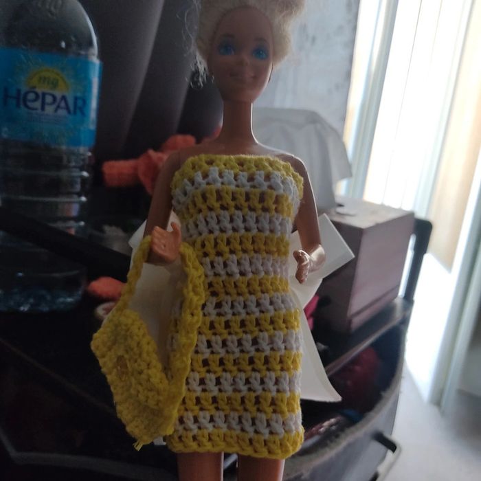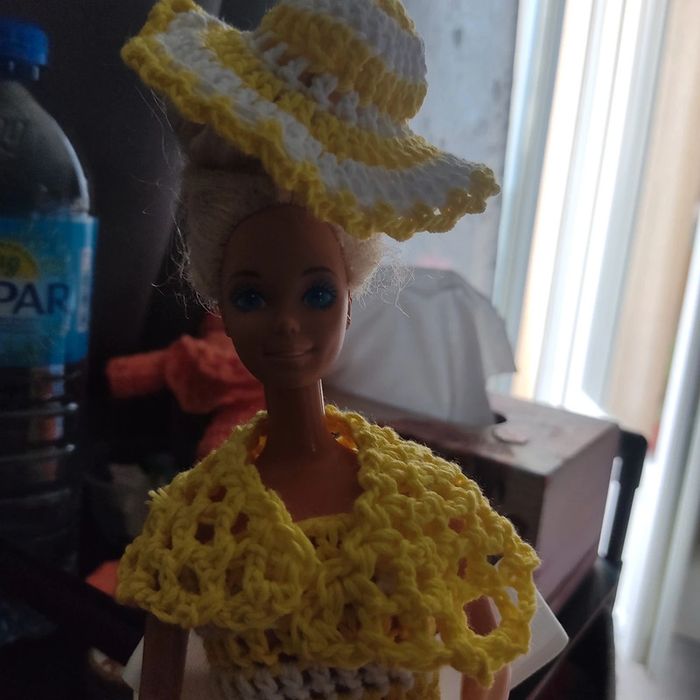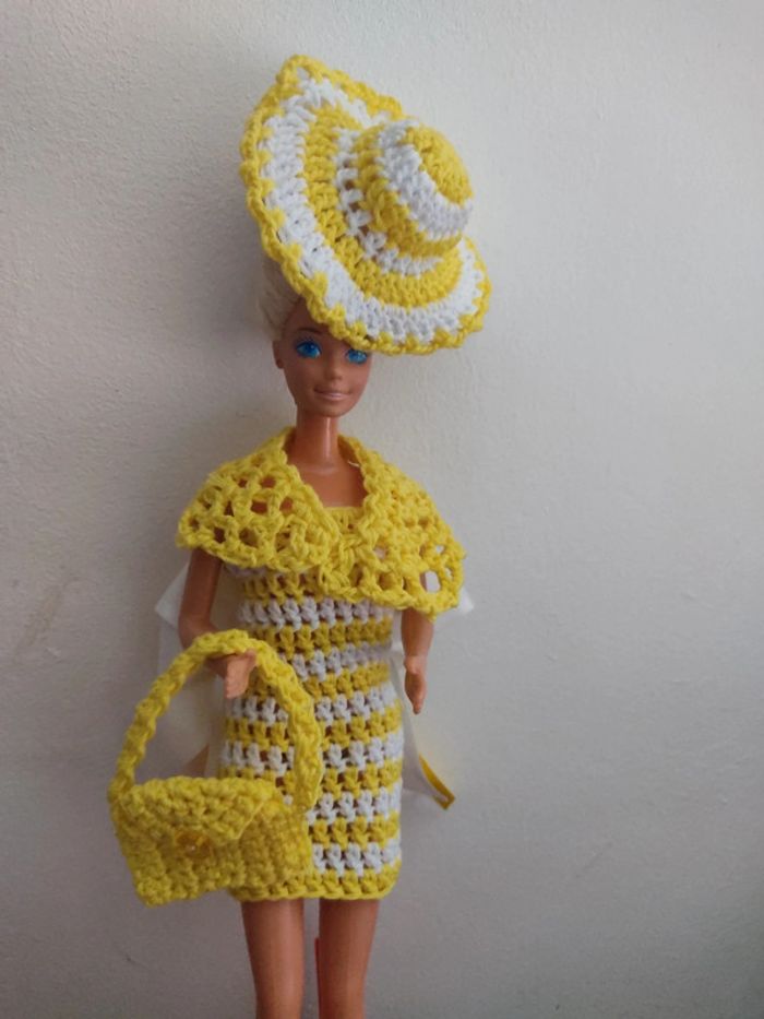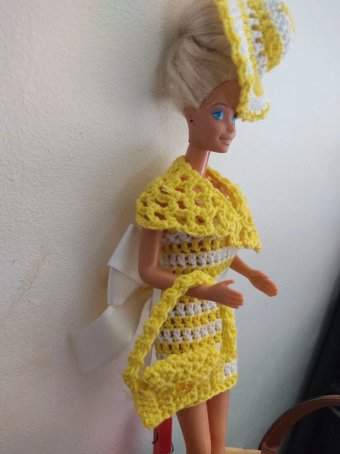 Barbie habillé : robe, châle, chapeau, sac à main. Fait main par moi cette Barbie n'est pas à vendre.jaune et blanc.