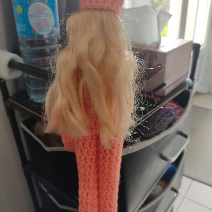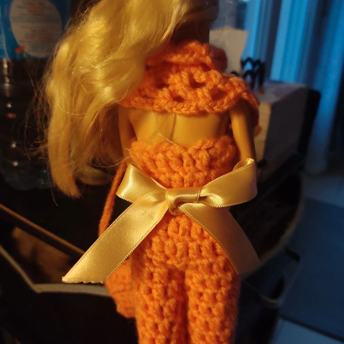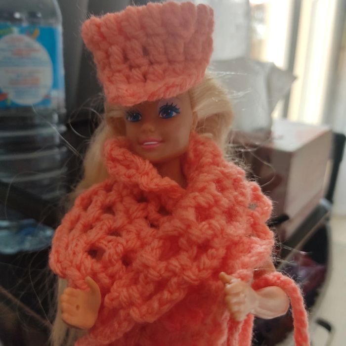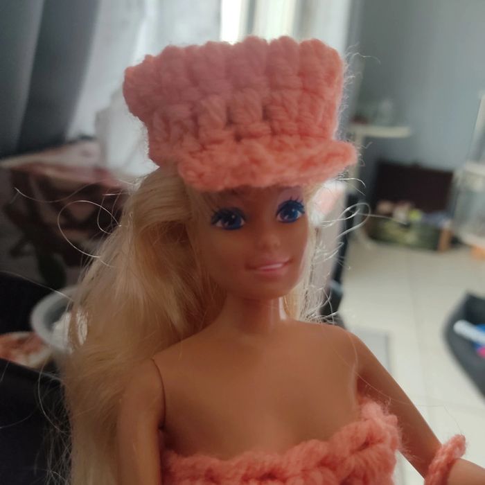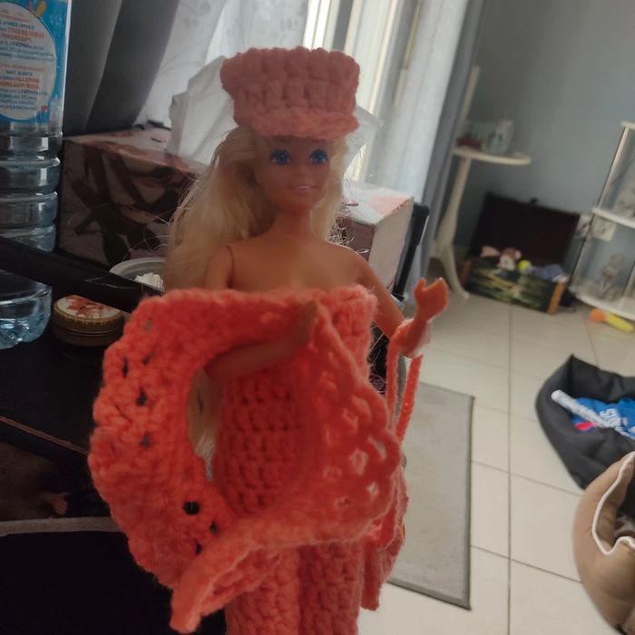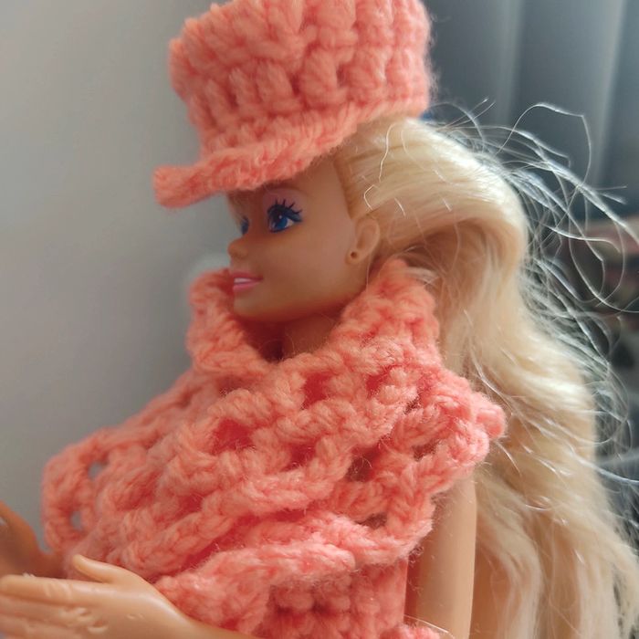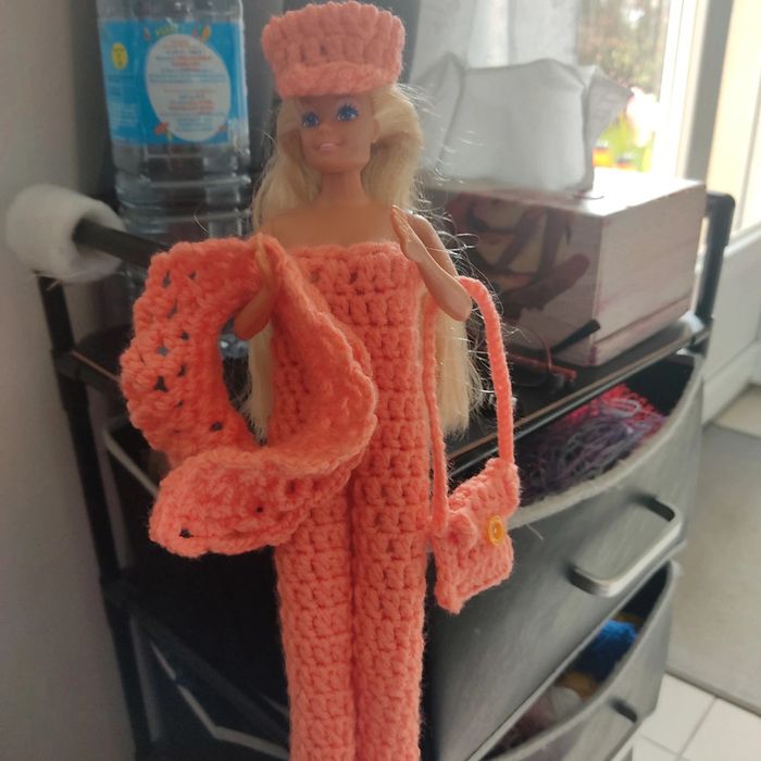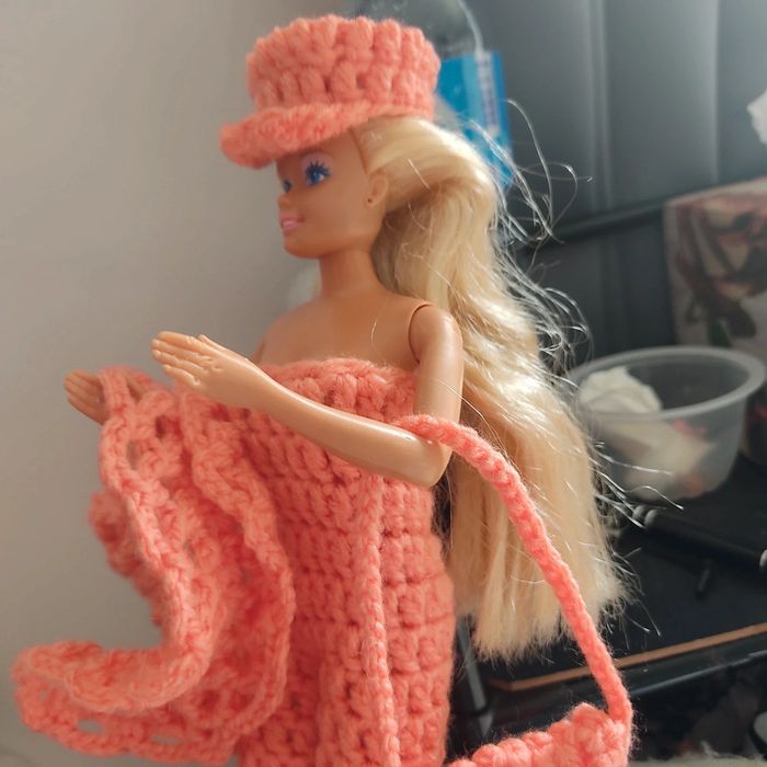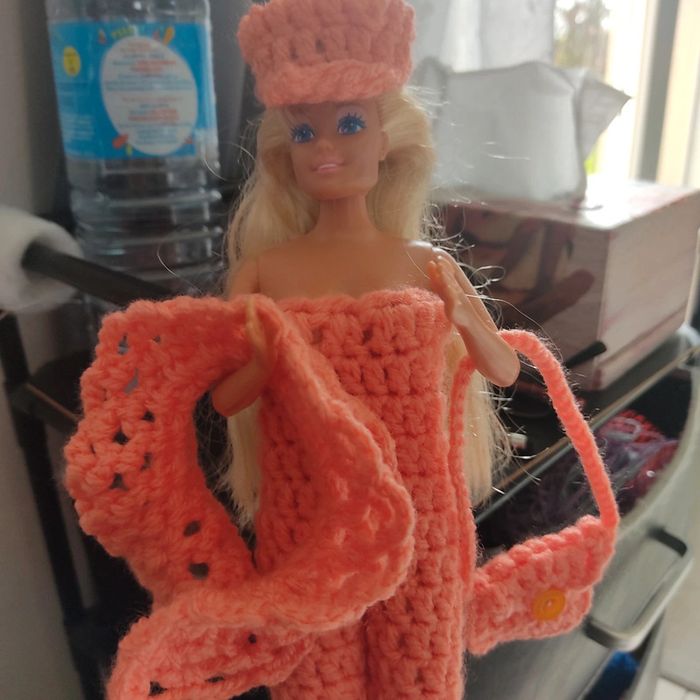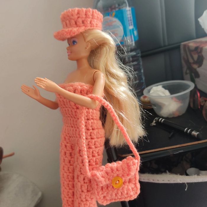 Barbie habillé : combinaison avec un ruban 🎀.châle, casquette, sac à main. Fait main par moi. Cette Barbie n'est pas à vendre.