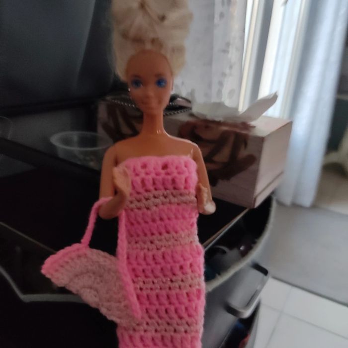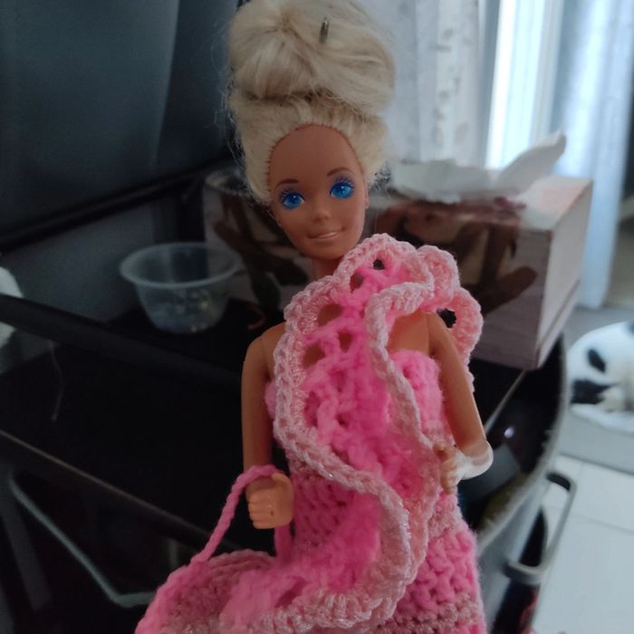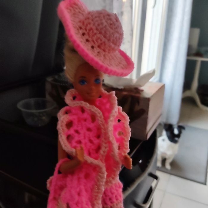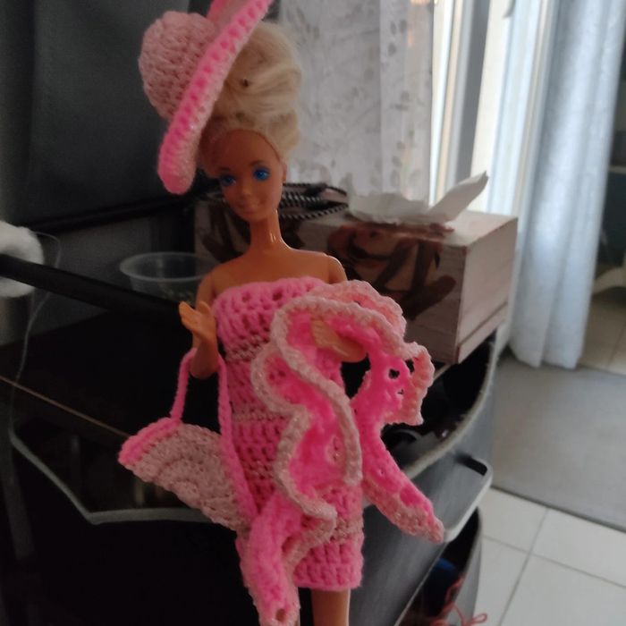 Barbie habillé : robe 👗, châle, chapeau, sac à main. Fait main par moi cette Barbie n'est pas à vendre.