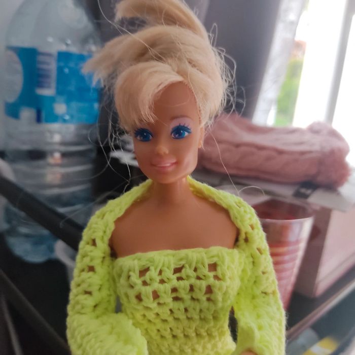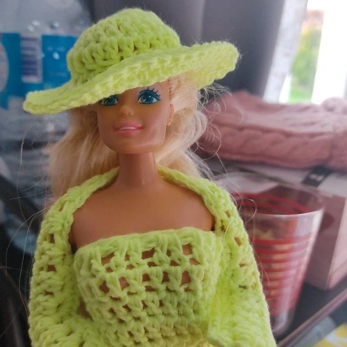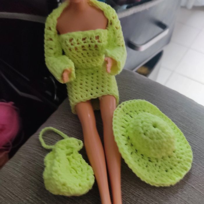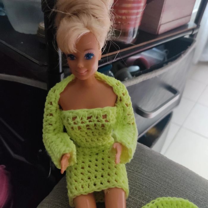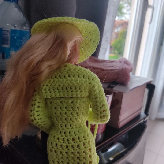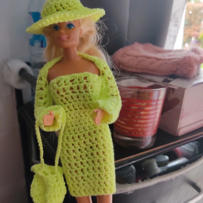 Barbie habillé : robe, boléro, chapeau, sac à main . fait main par moi cette Barbie n'est pas à vendre . couleur jaune fluo.