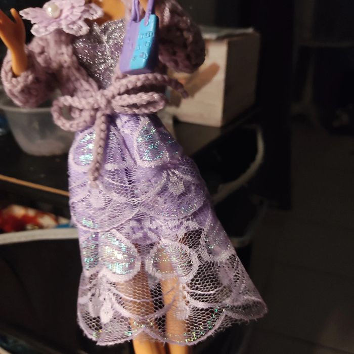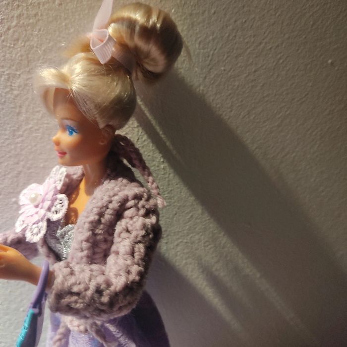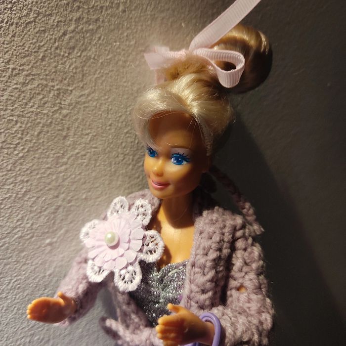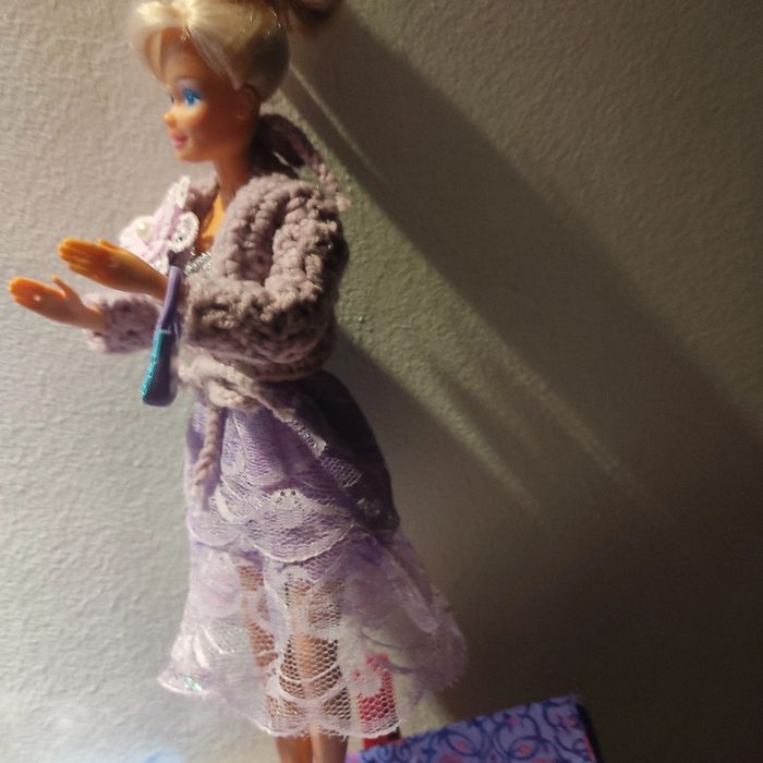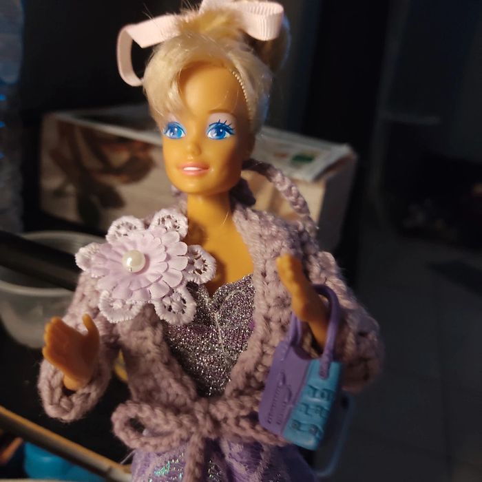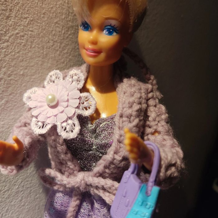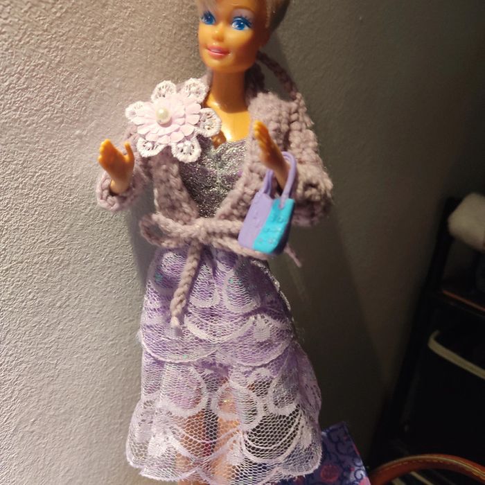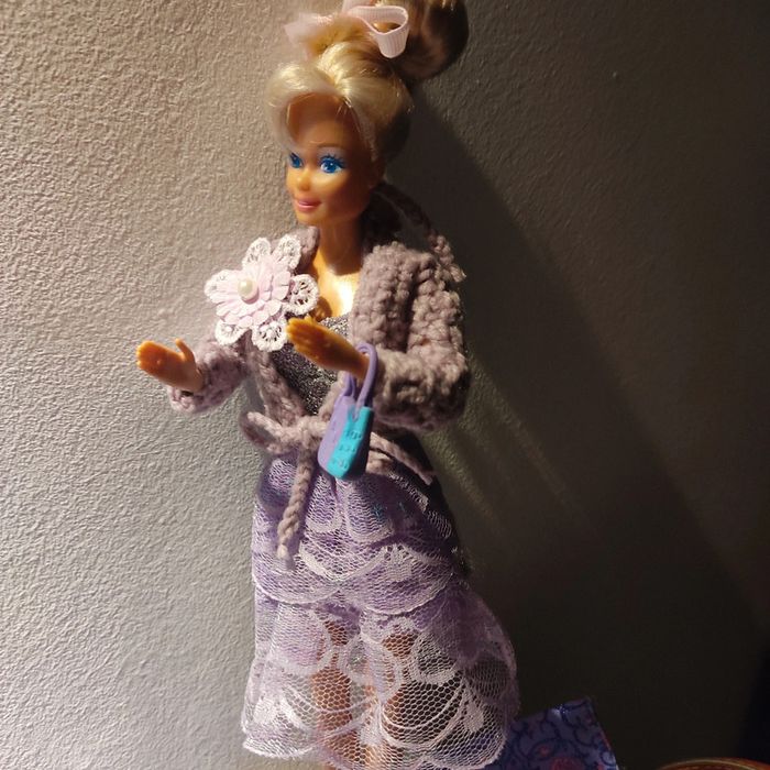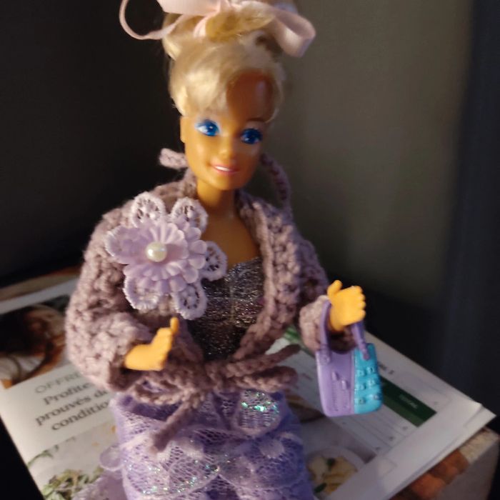Barbie habillé :robe dentelle,veste avec une fleur, chapeau, petit sac à main.fait main par moi cette Barbie n'est pas à vendre.