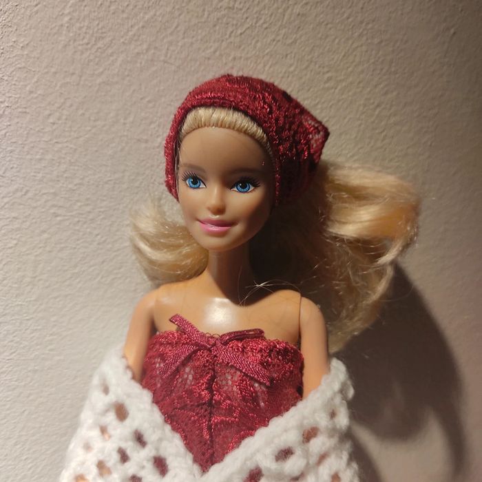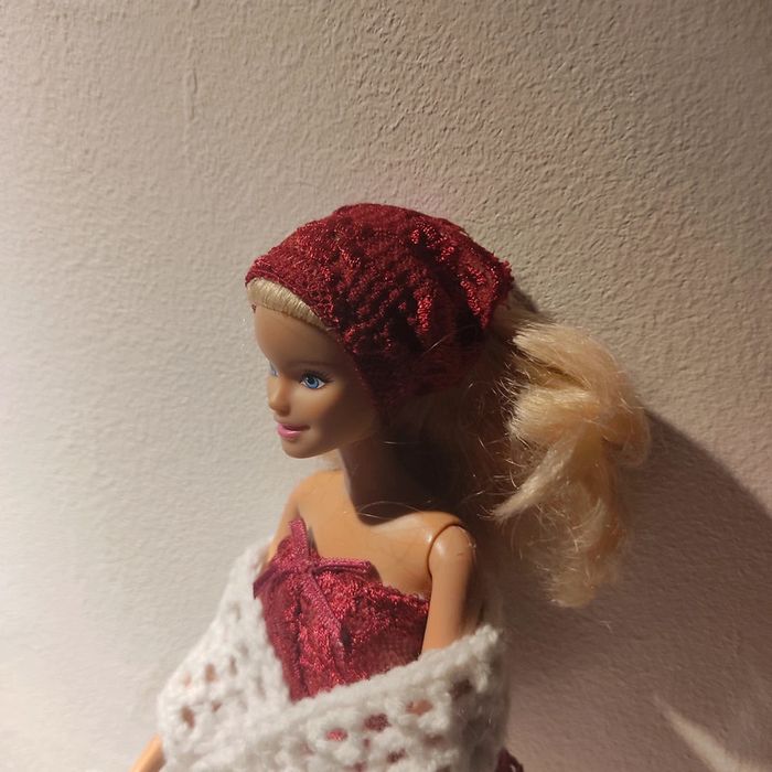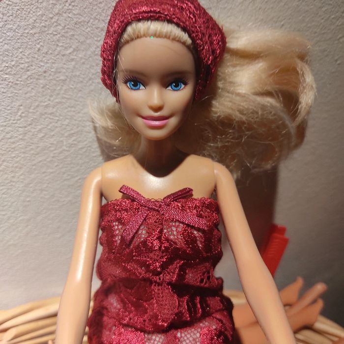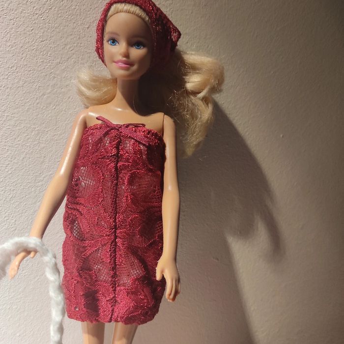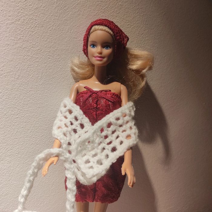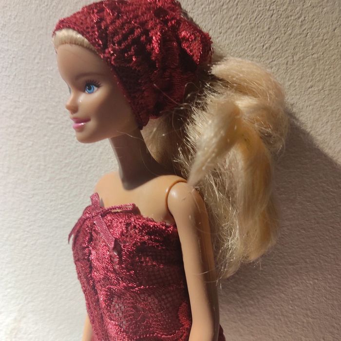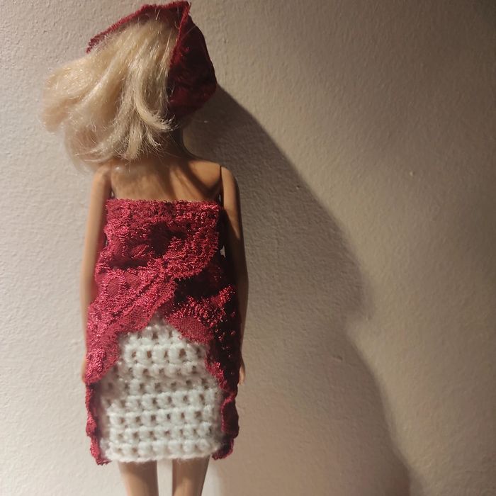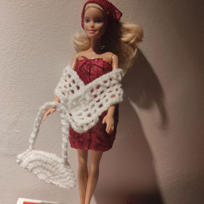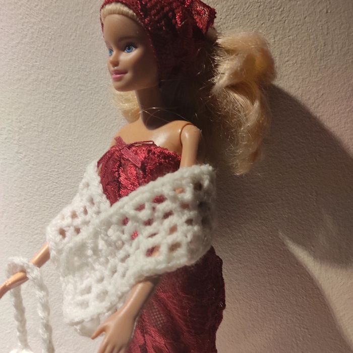 Barbie habillé :robe blanche avec dentelle bordeau, foulard bordeau, châle blanc, sac à main. Fait main par moi cette Barbie pour 1€ de plus.