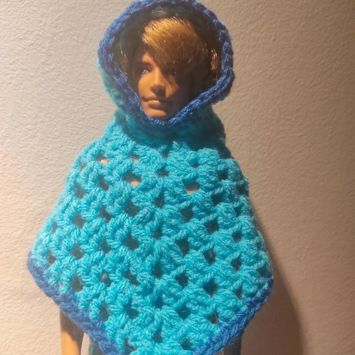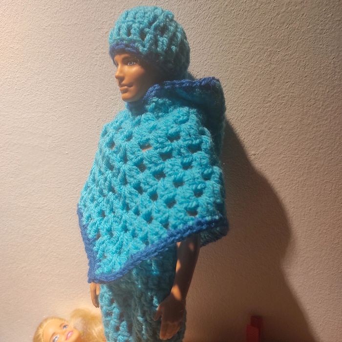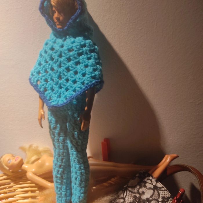 Ken habillé : pantalon, poncho à capuche et un bonnet.fait main par moi ce ken n'est pas à vendre.