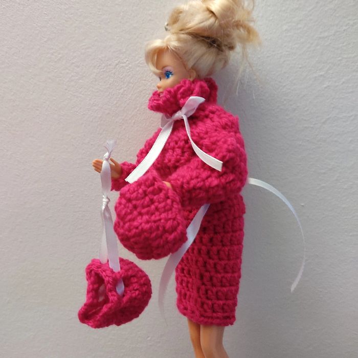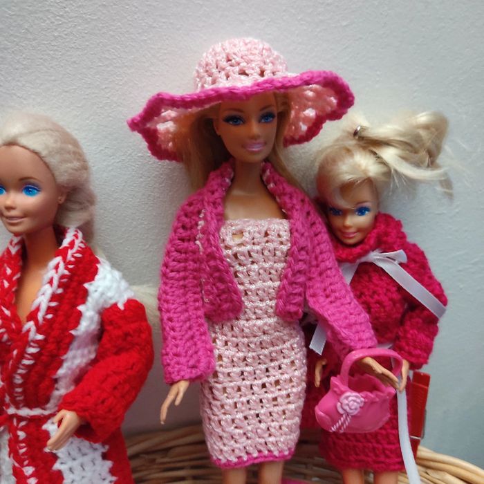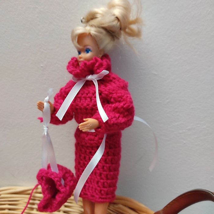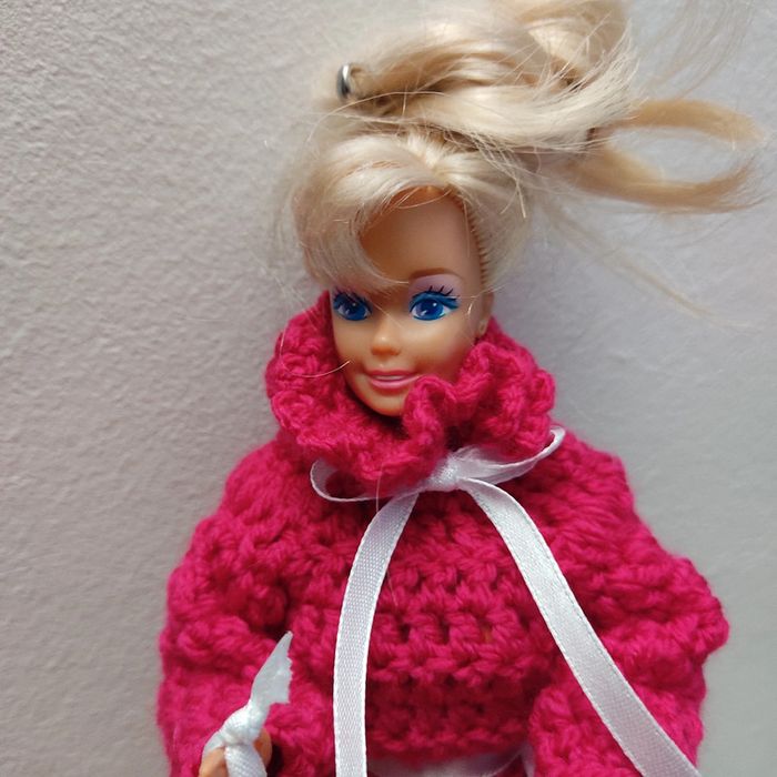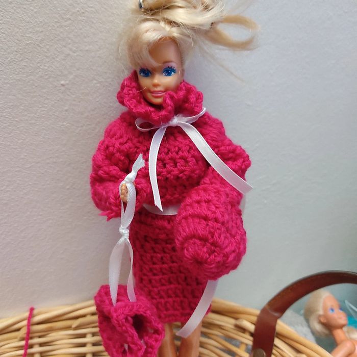 Barbie habillé :pull peu de transformé en veste, jupe, chapeau, sac à main. Fait main par moi cette Barbie n'est pas à vendre.couleur fushia.