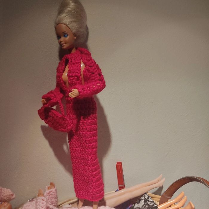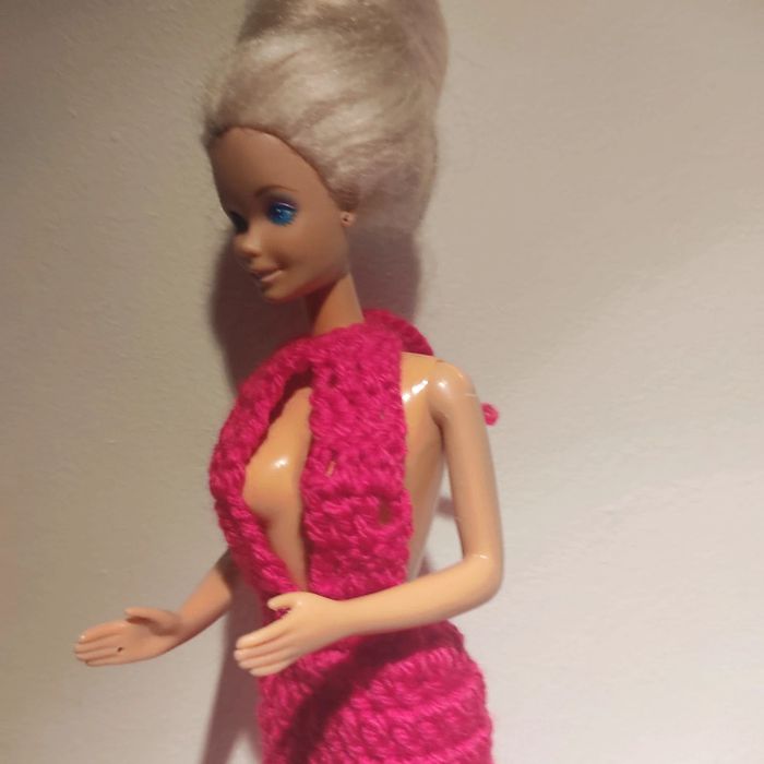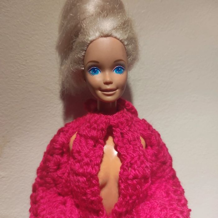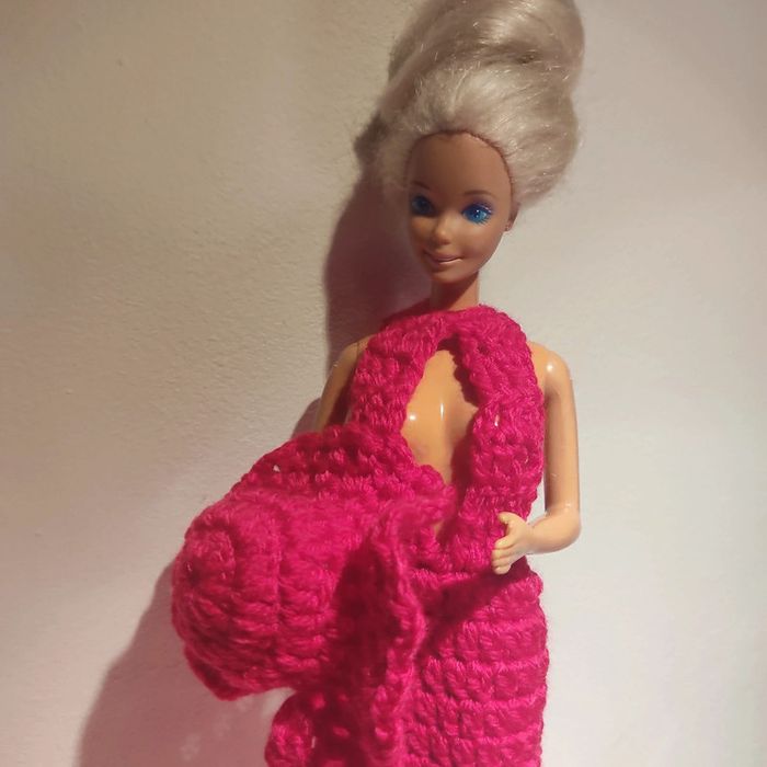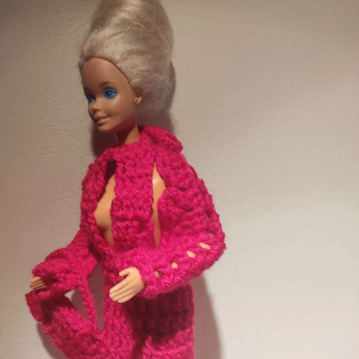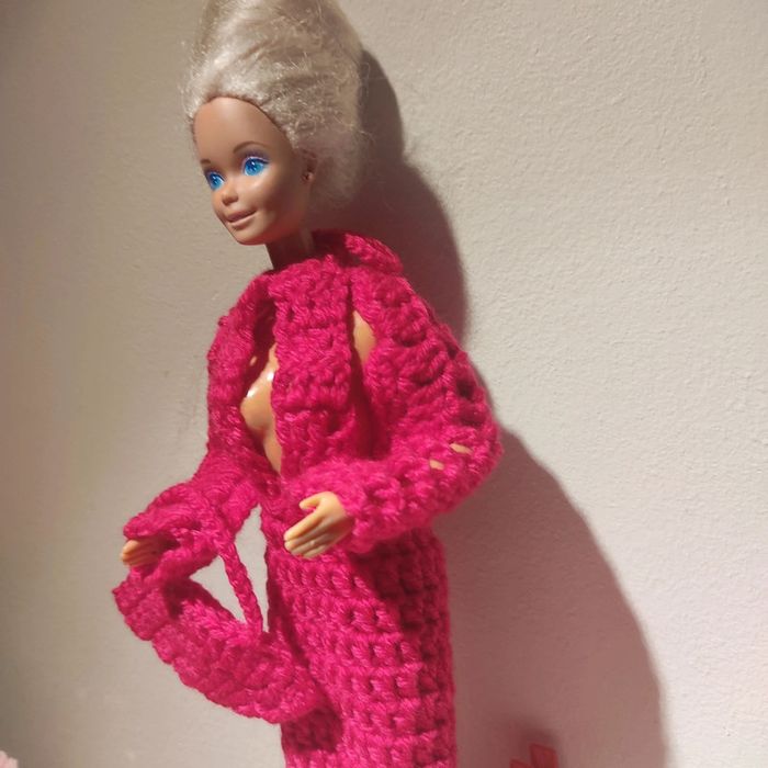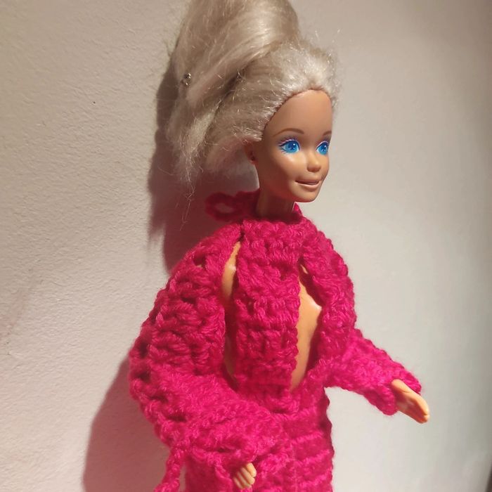Barbie habillé : robe longue décolleté, boléro, chapeau, sac à main. Fait main par moi cette Barbie n'est pas à vendre.couleur fushia.