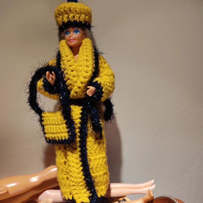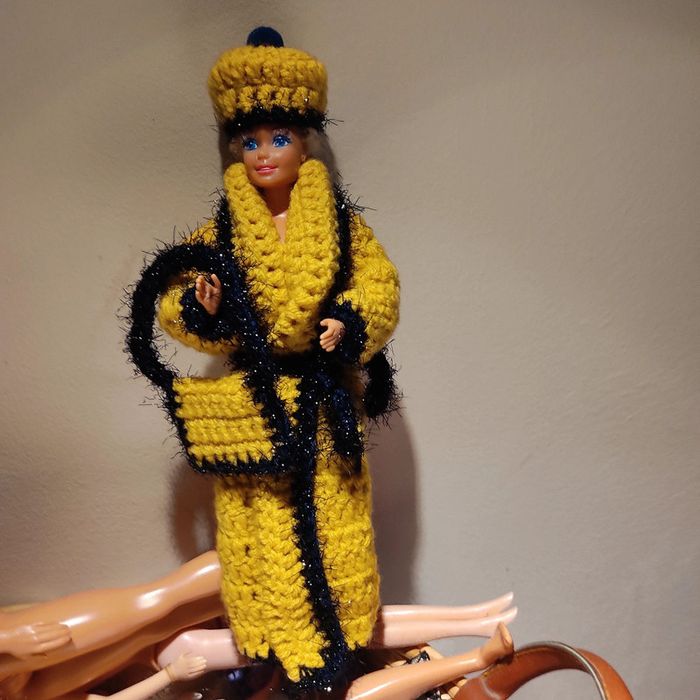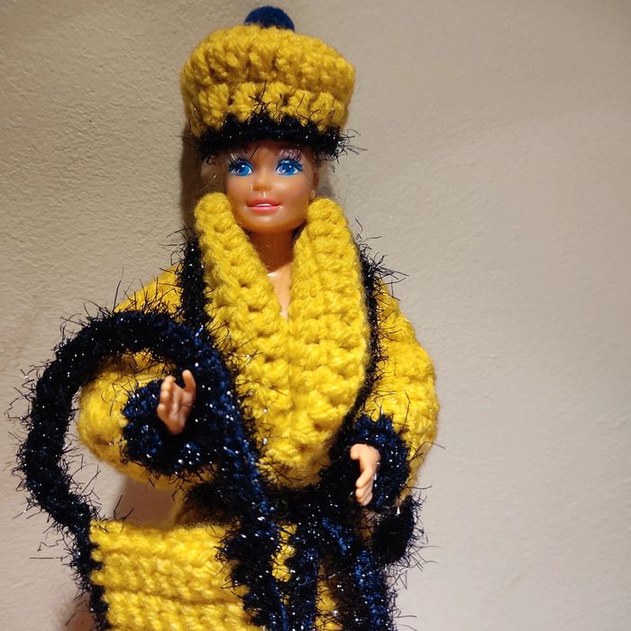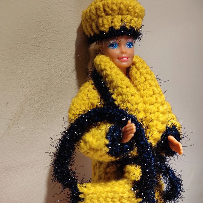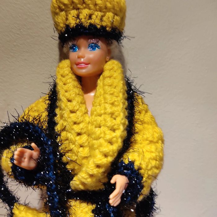 Barbie habillé : manteau long col châle avec une ceinture, chapeau pompon, sac à main. Fait main par moi cette Barbie n'est pas à vendre.