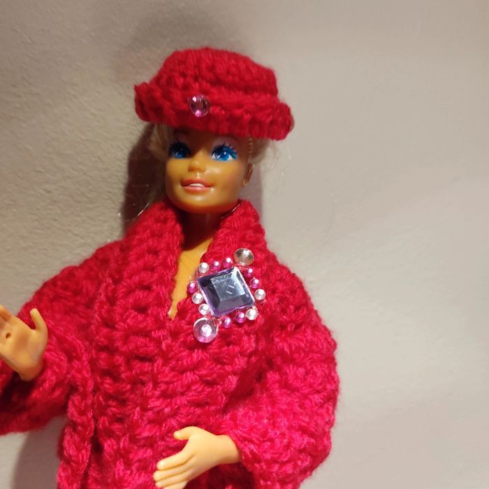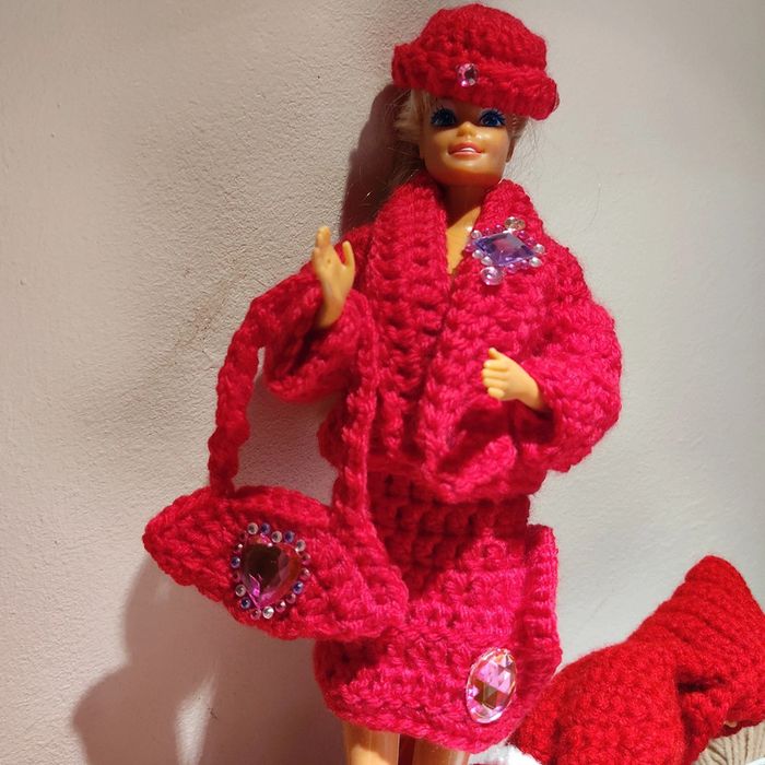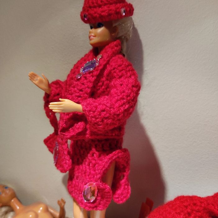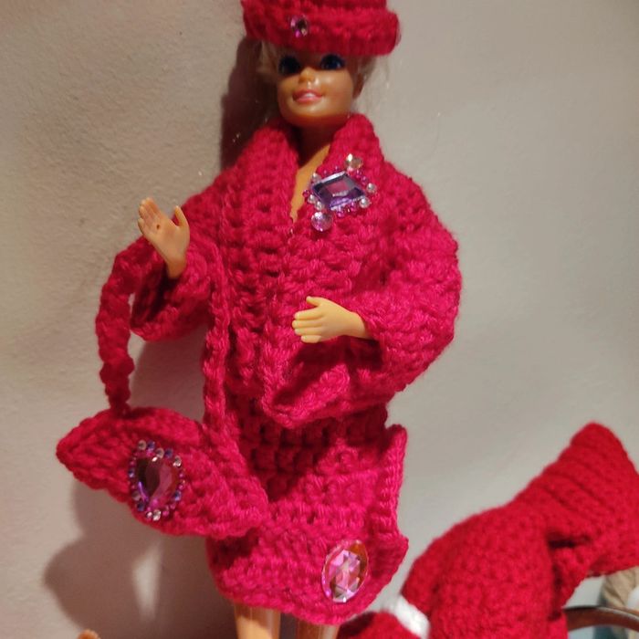 Barbie habillé : veste col châle,jupe fendue sur un côté, chapeau, sac à main. Fait main par moi cette Barbie n'est pas à vendre.rose fushia.
