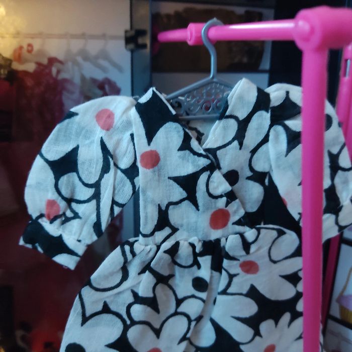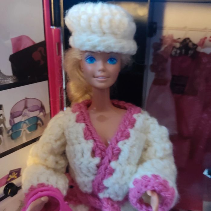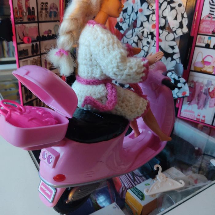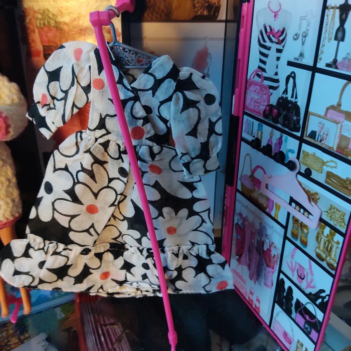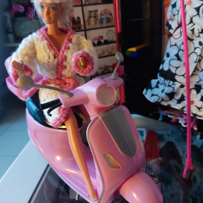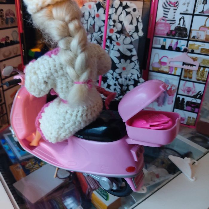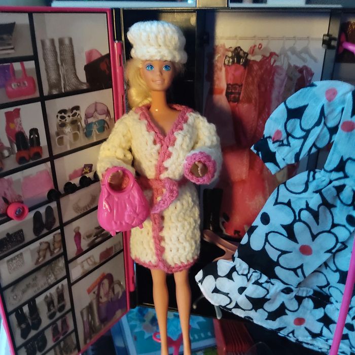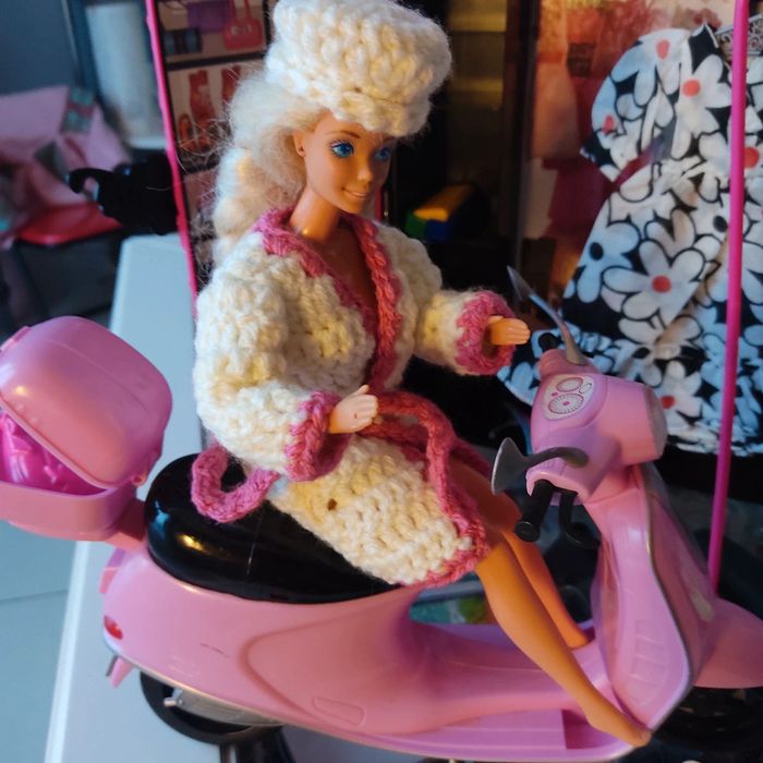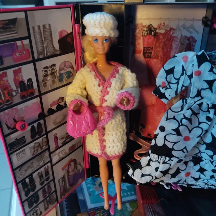 Barbie habillé : manteau, chapeau, ceinture.fait main par moi sac à main.cette Barbie n'est pas à vendre.robe avec cintre 2€.petite moto.5€.dressing 6€.tout peut être vendu séparément.