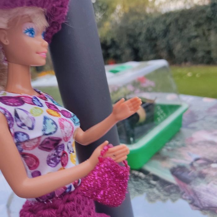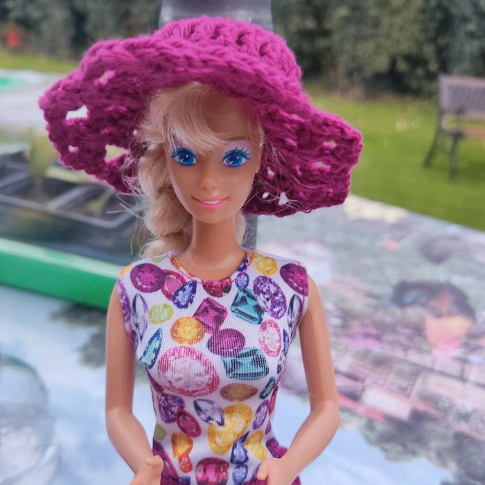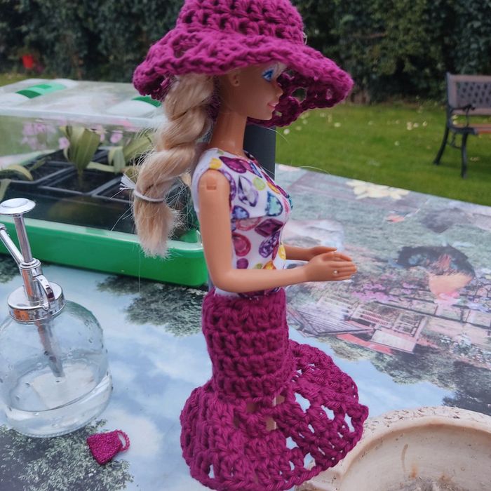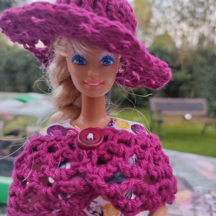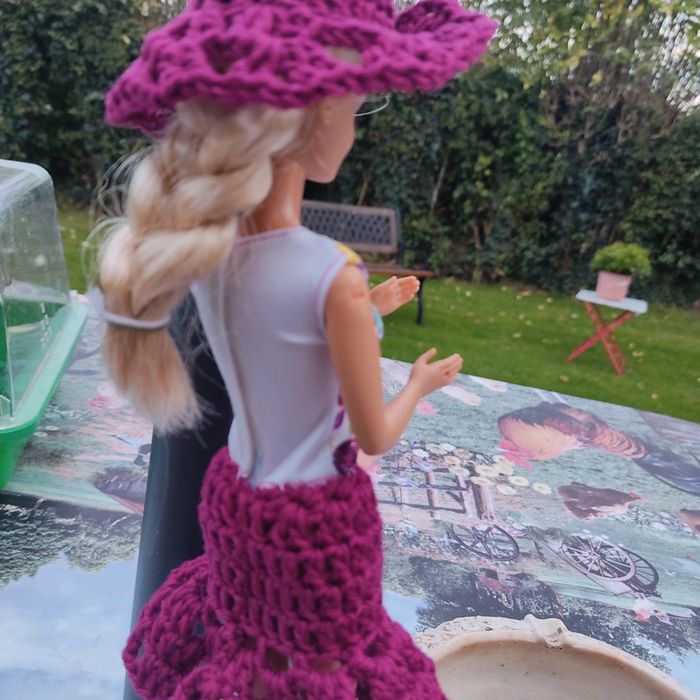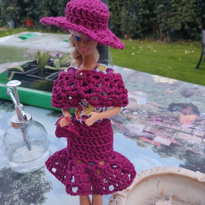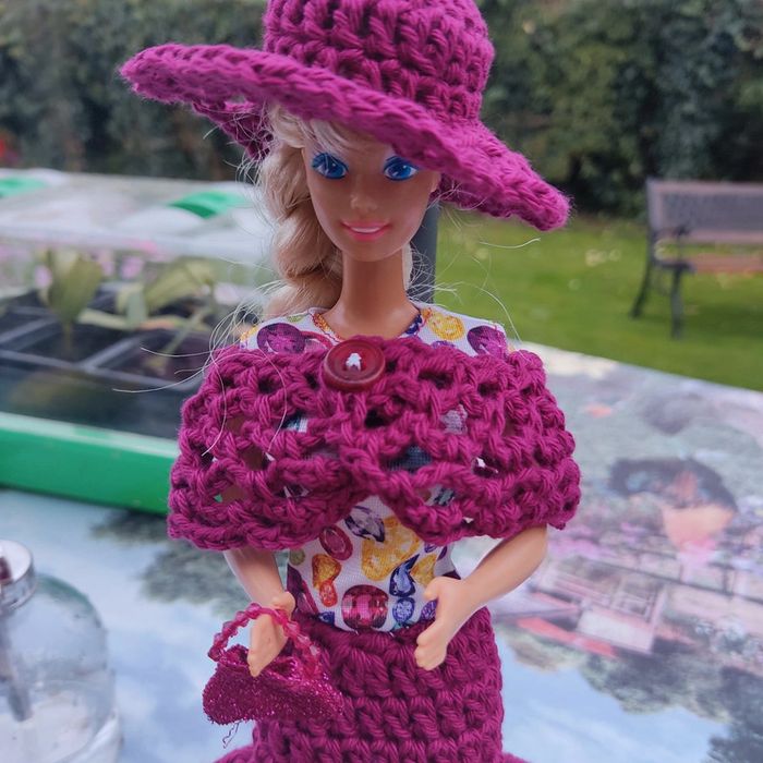Barbie habillé :robe, châle, chapeau, fait main par moi.sac à main cette Barbie n'est pas à vendre.