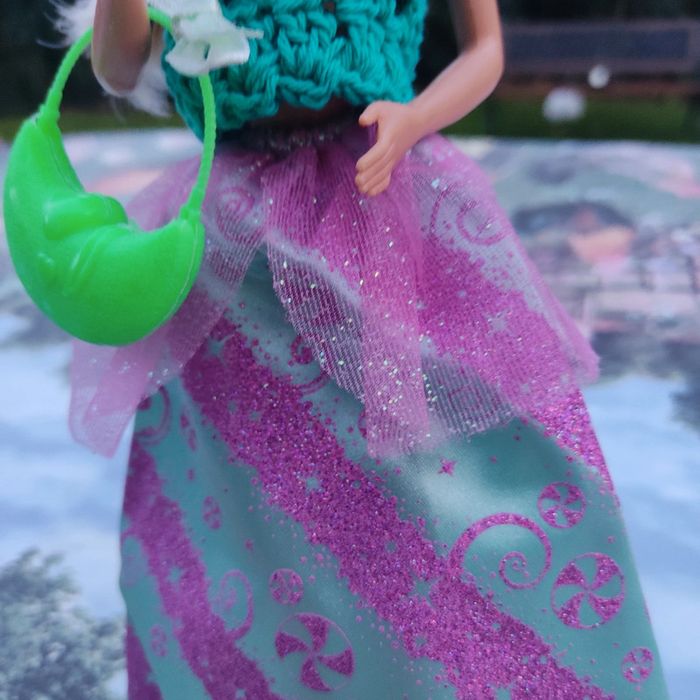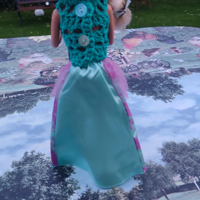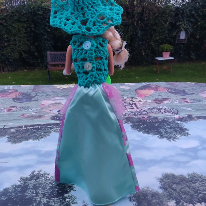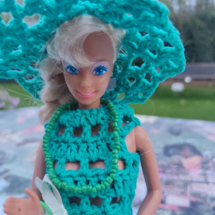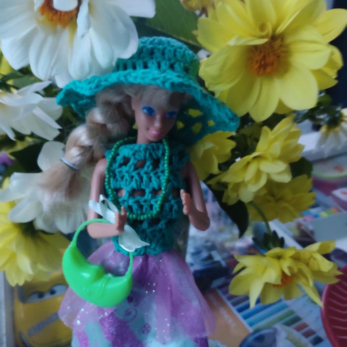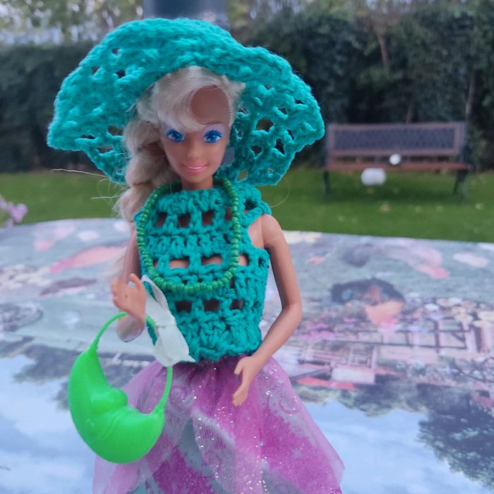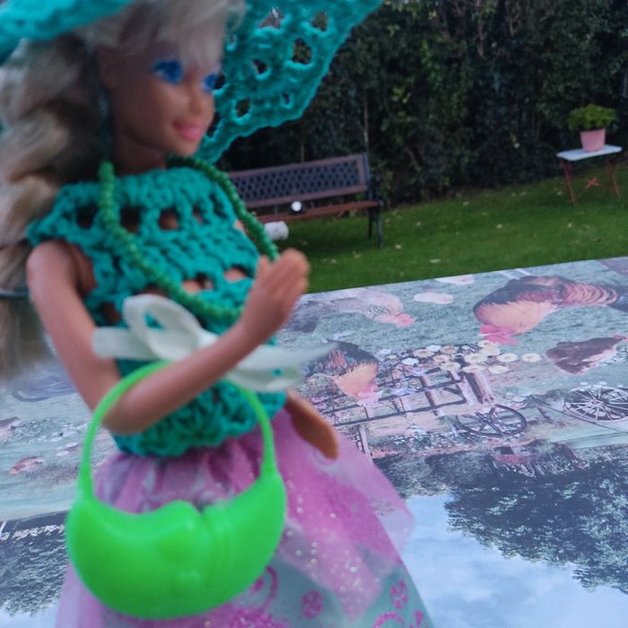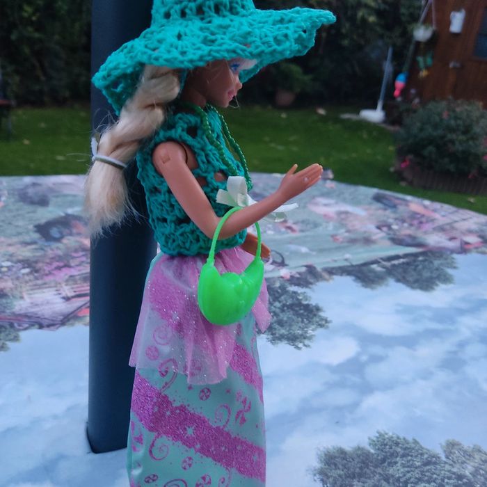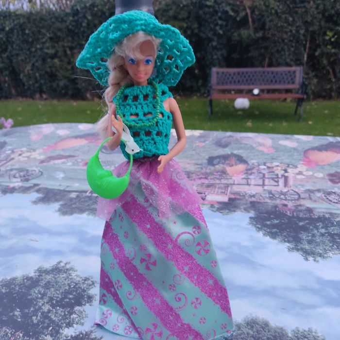 Barbie habillé : jupe longue, haut, chapeau, sac à main. Fait main par moi cette Barbie n'est pas à vendre.