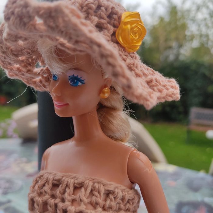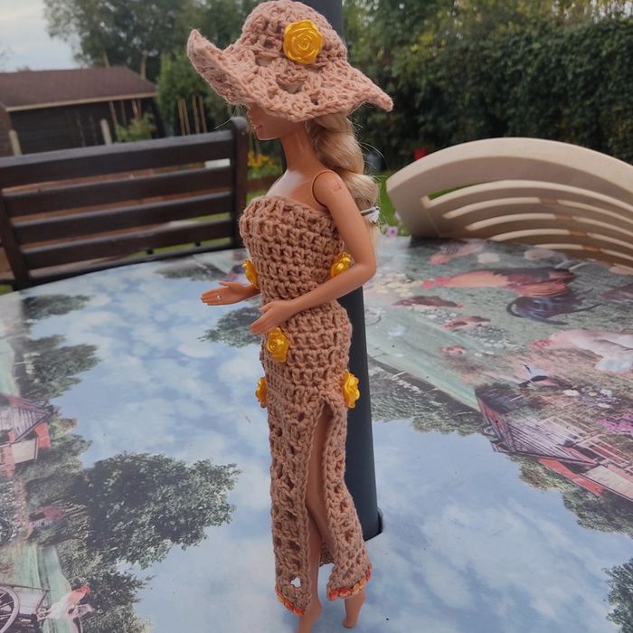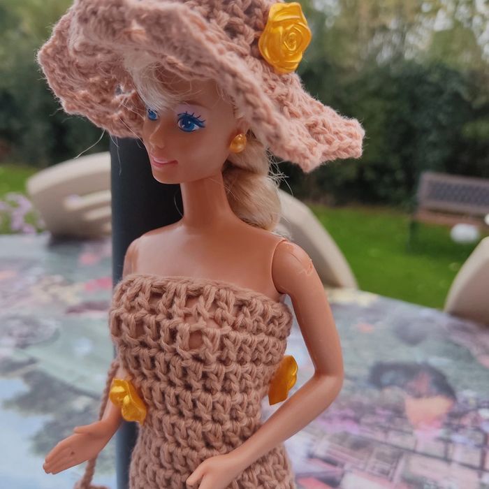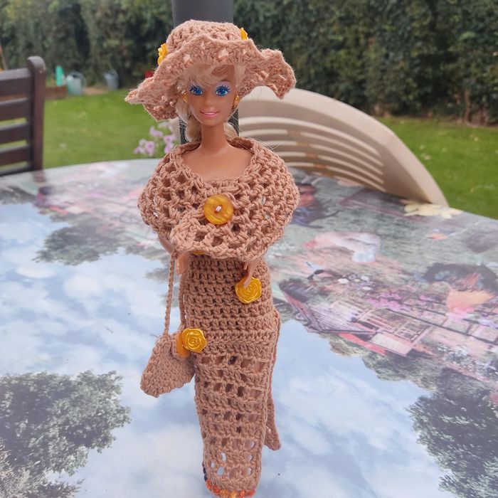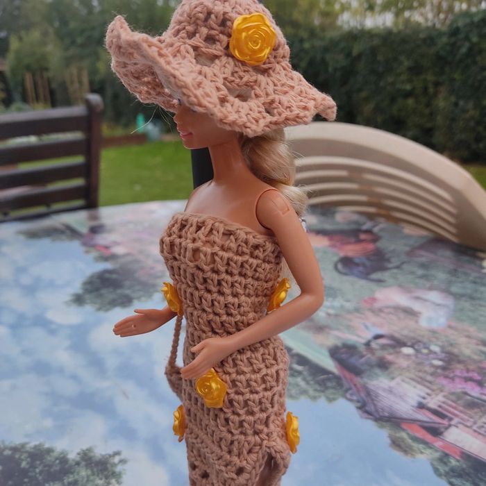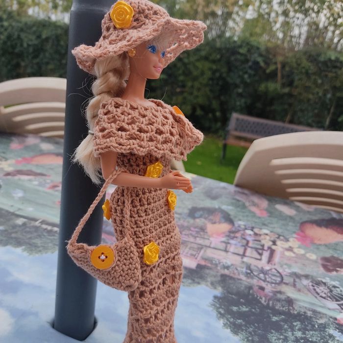 Barbie habillé : robe longue fendu et fleuri, châle, chapeau fleuri,sac à main, fait main par moi cette Barbie n'est pas à vendre.plus petite boucle d'oreille qui ce colle .