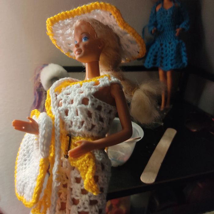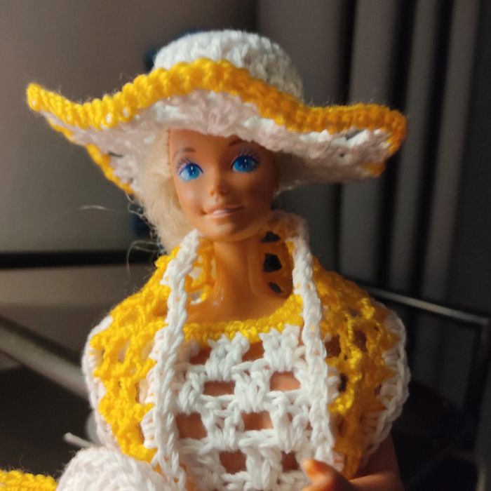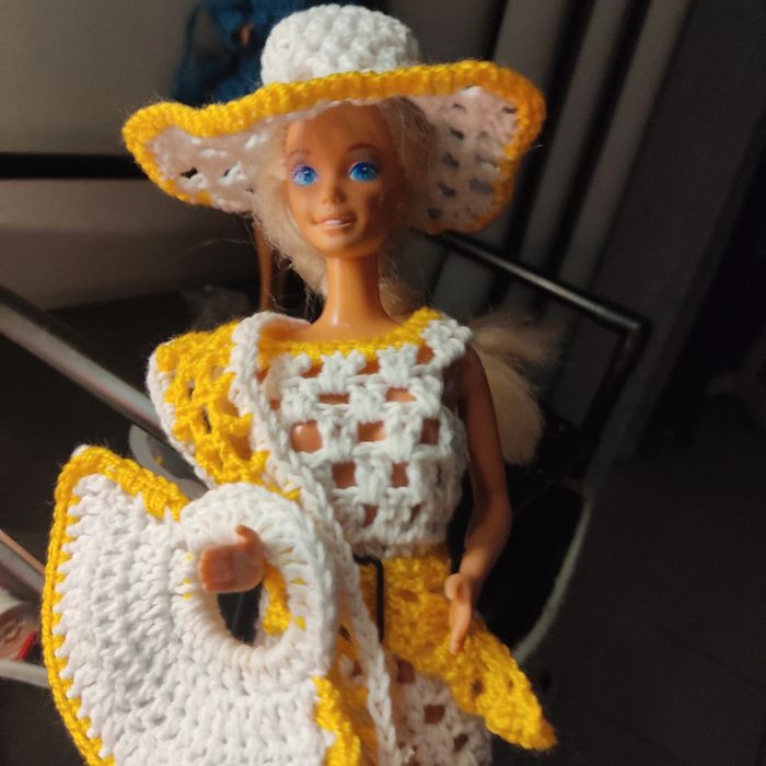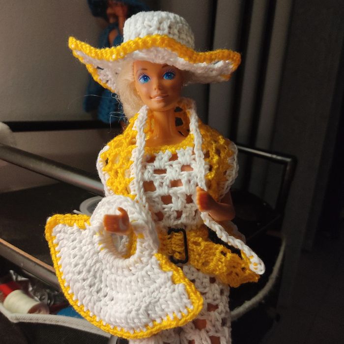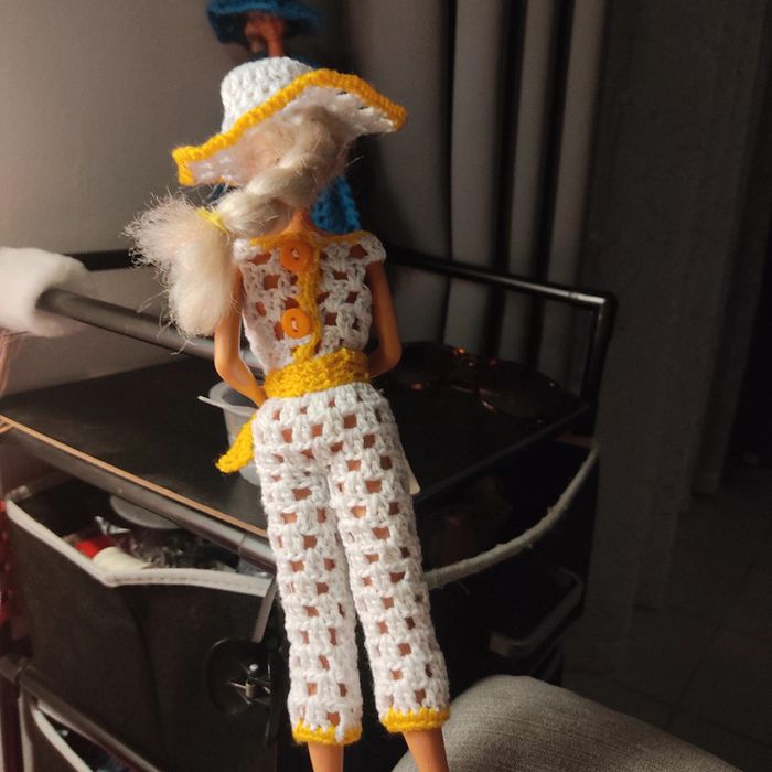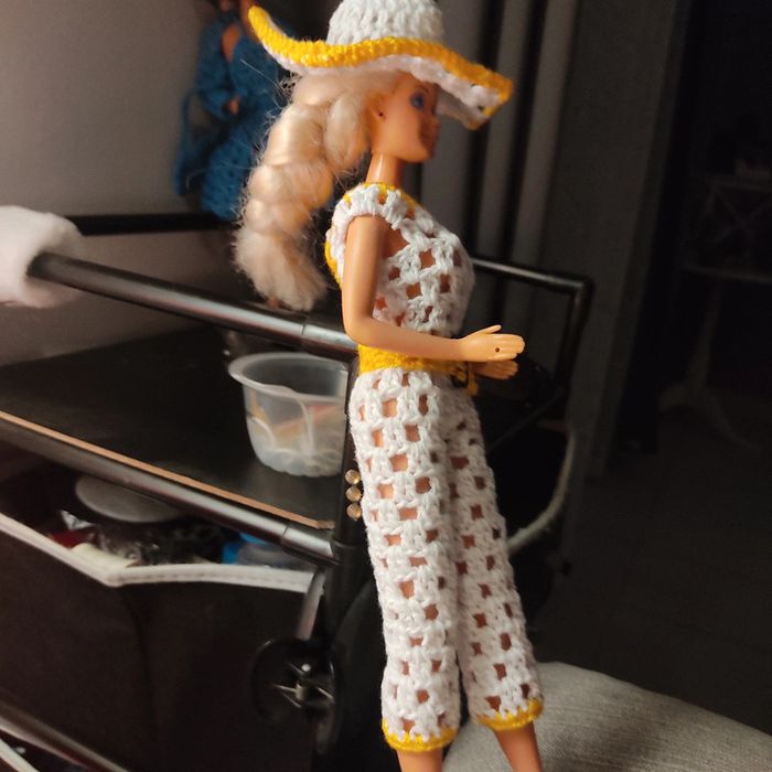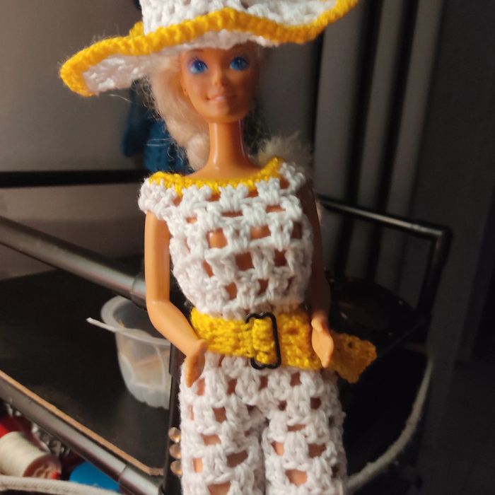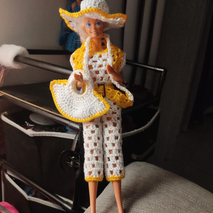 Barbie habillé : combi-pantacourt, ceinture, châle, chapeau, sac à main. Fait main par moi cette Barbie n'est pas à vendre.