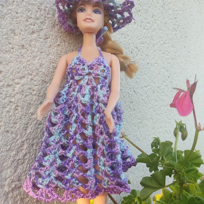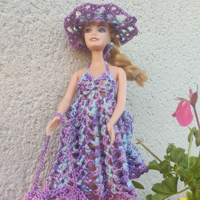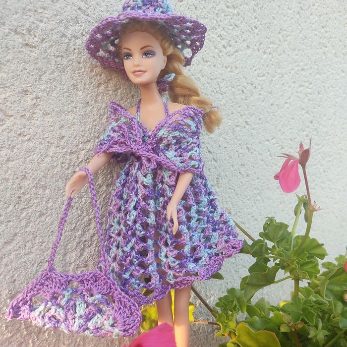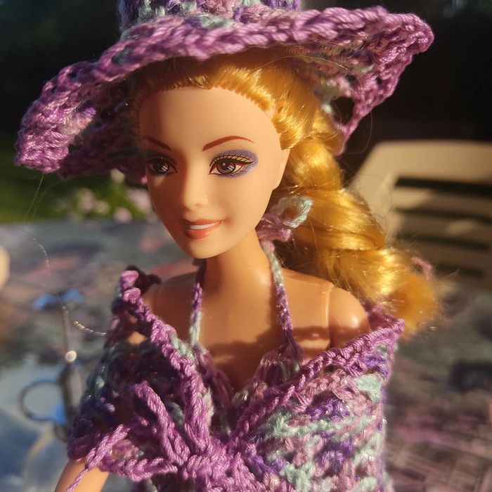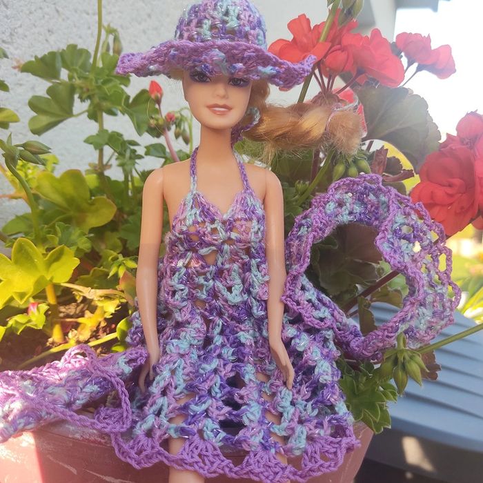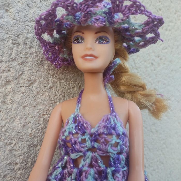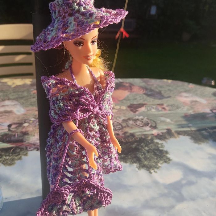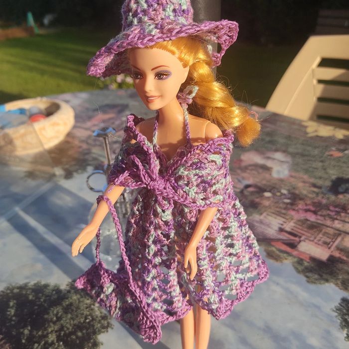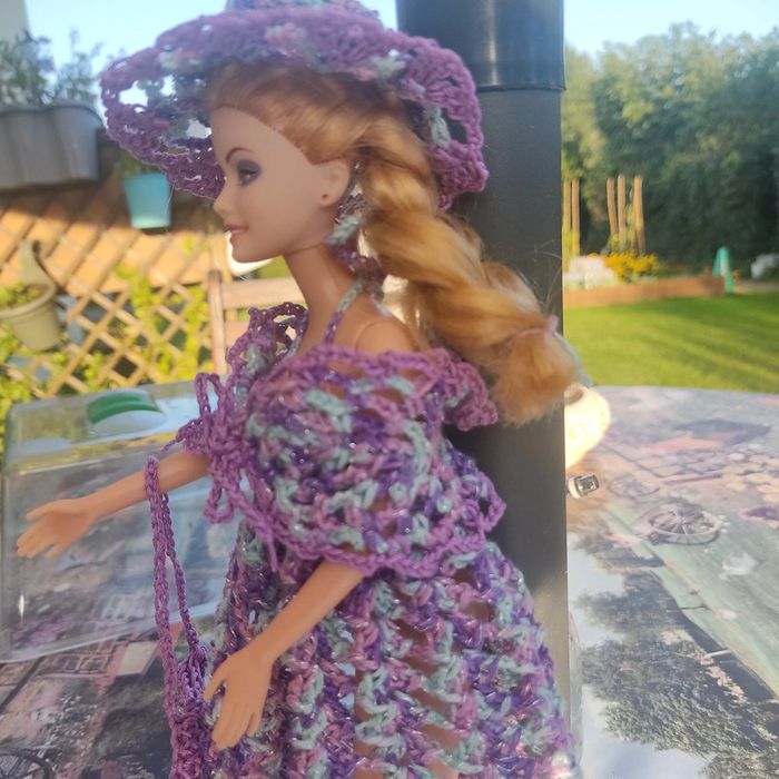 Barbie habillé : robe dos nue, châle, chapeau, sac à main. Fait main par moi. Mannequin pas à vendre.
