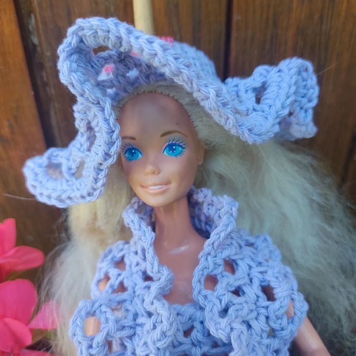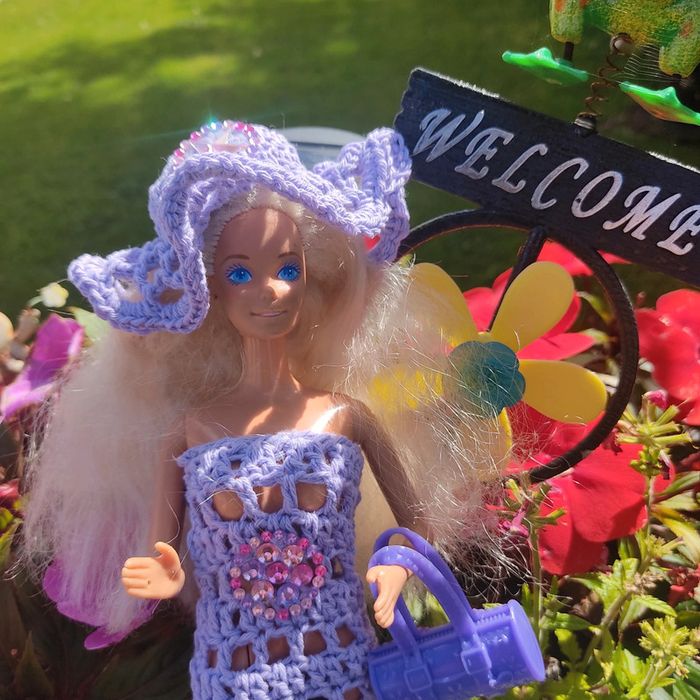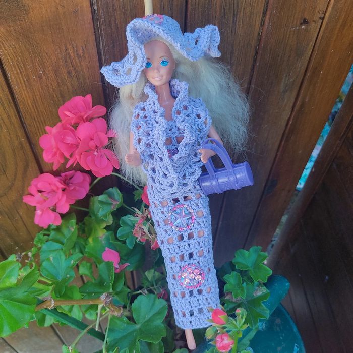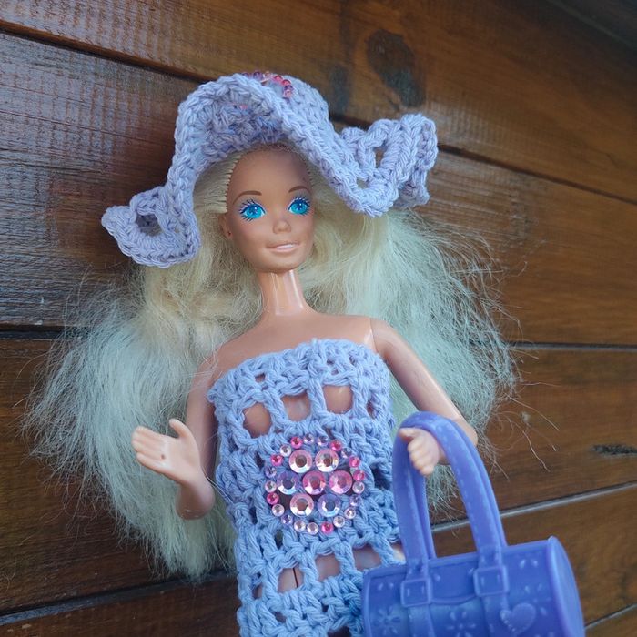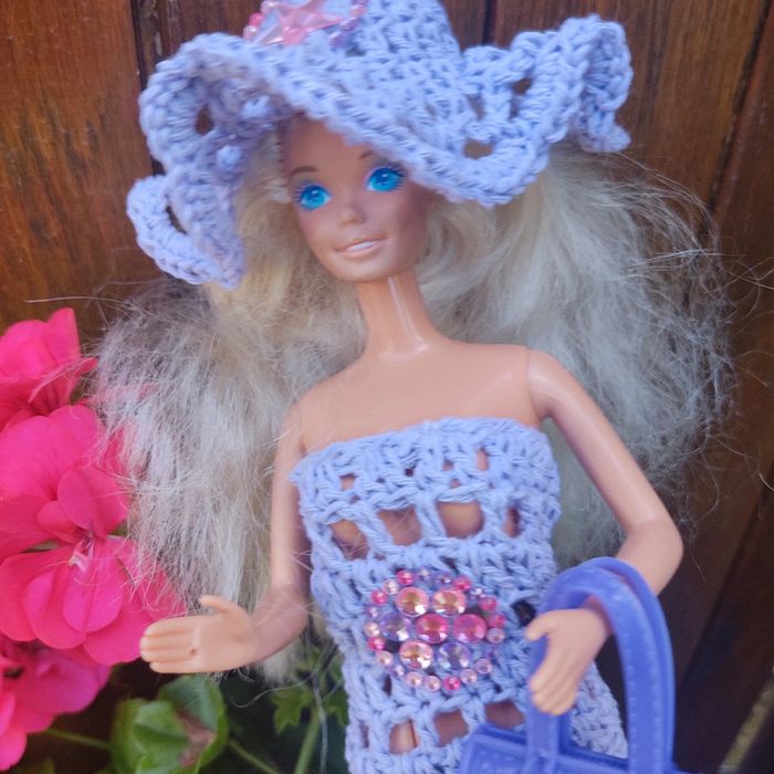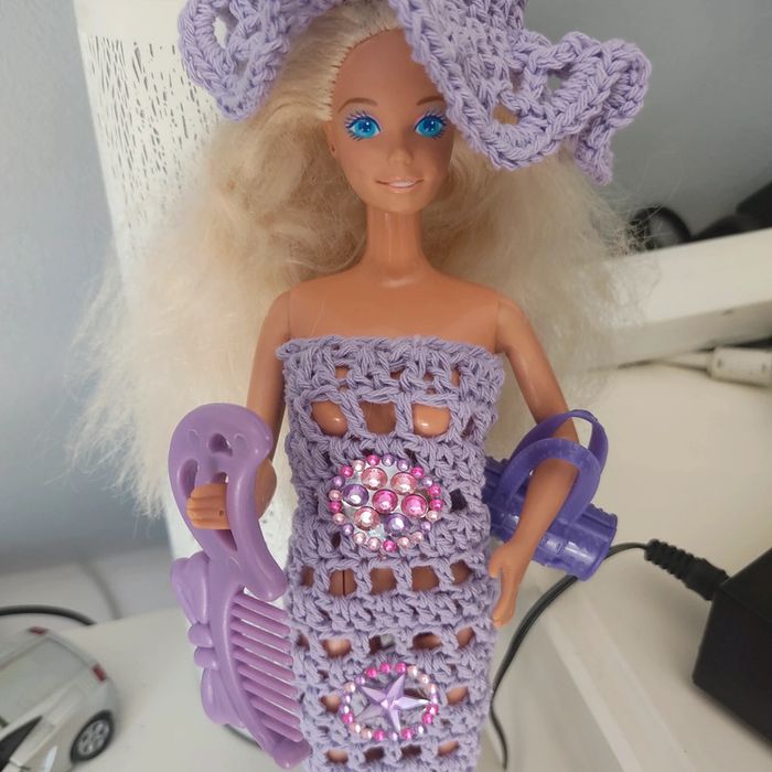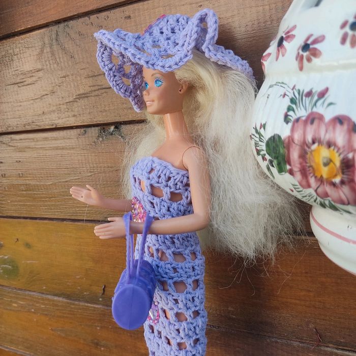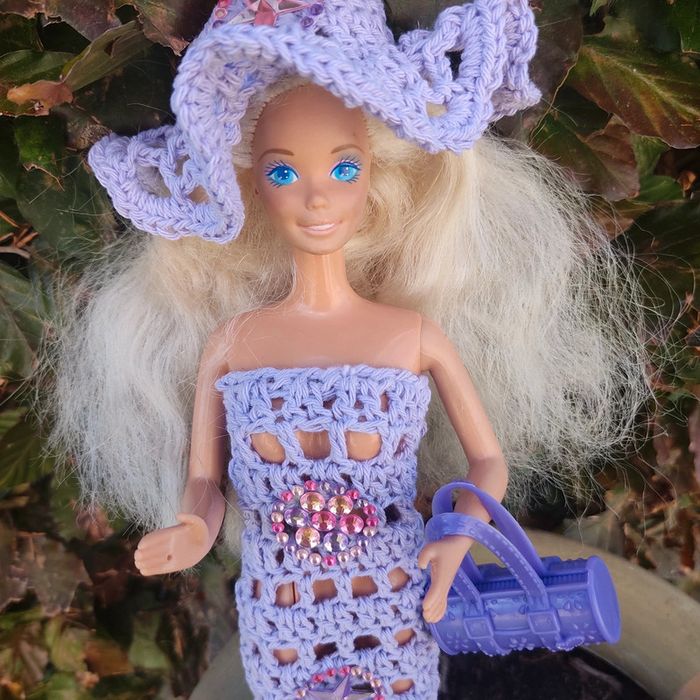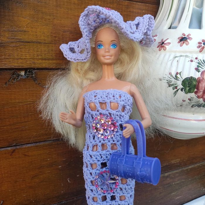 Barbie habillé : robe longue mauve avec des strass,châle, chapeau strass ,fait main par moi.sac à main.cette Barbie n'est pas à vendre.