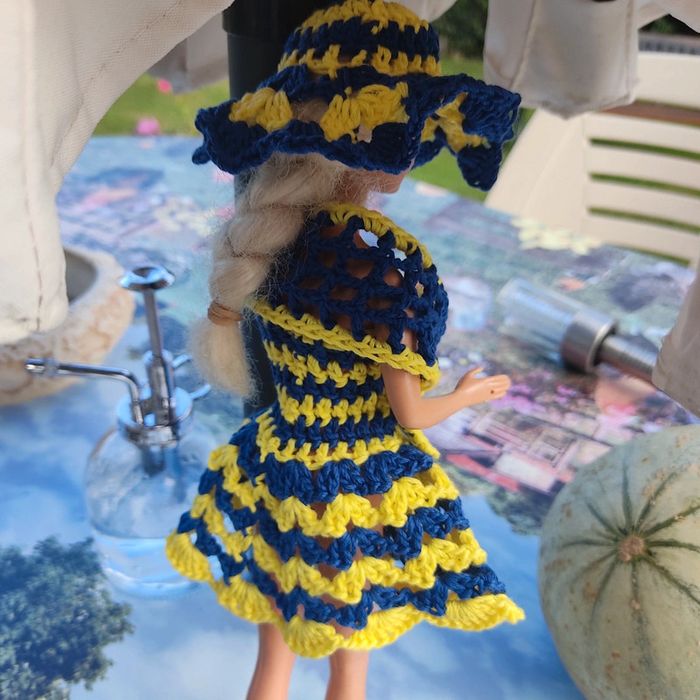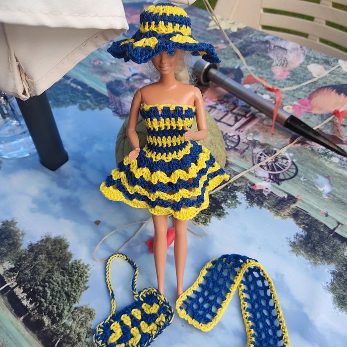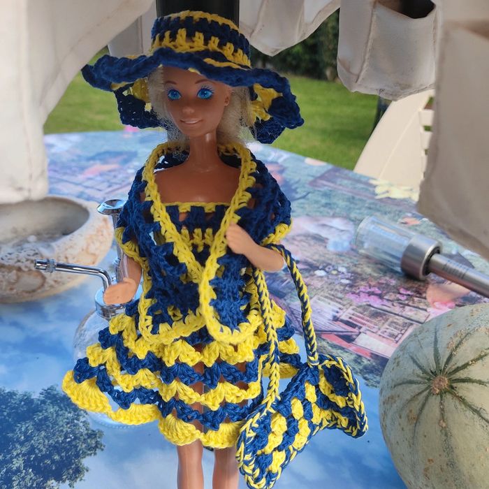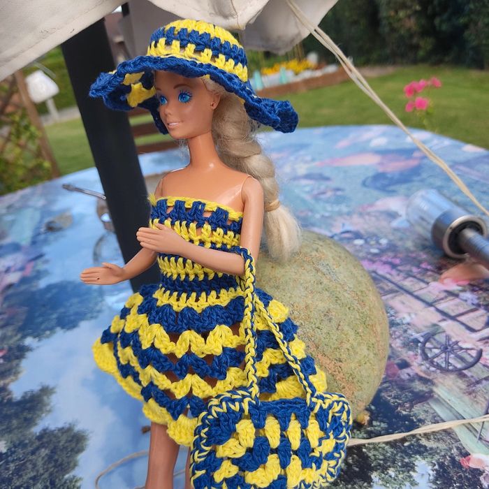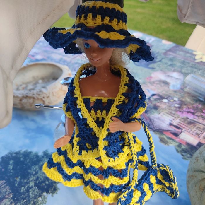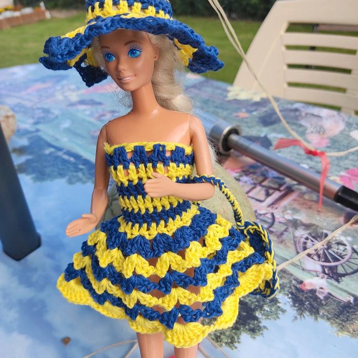 Barbie habillé :robe jaune et bleu, châle, chapeau, sac à main. Fait main par moi cette Barbie n'est pas à vendre.