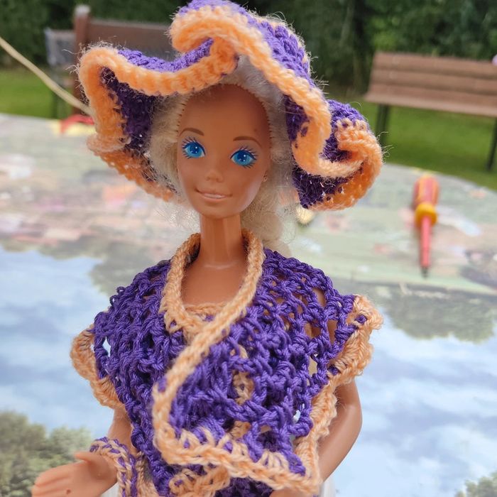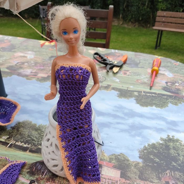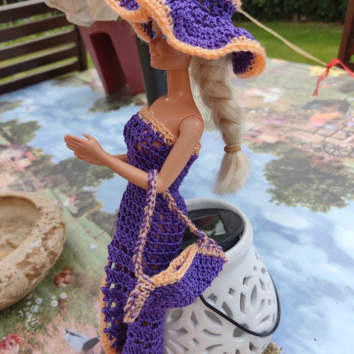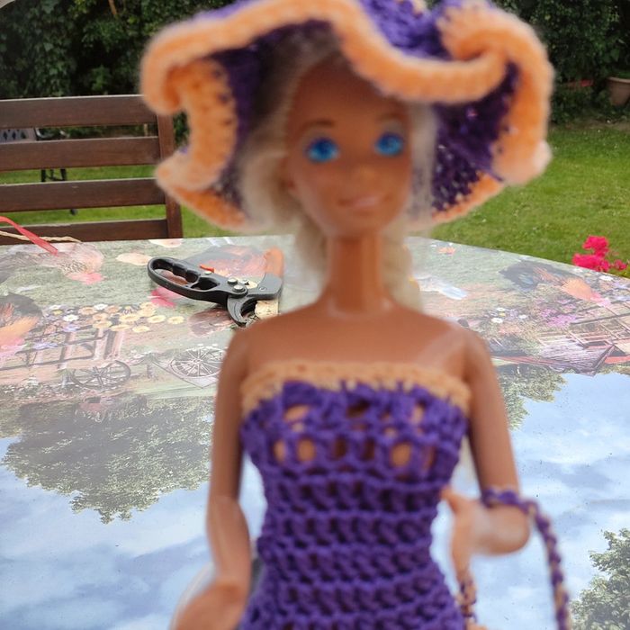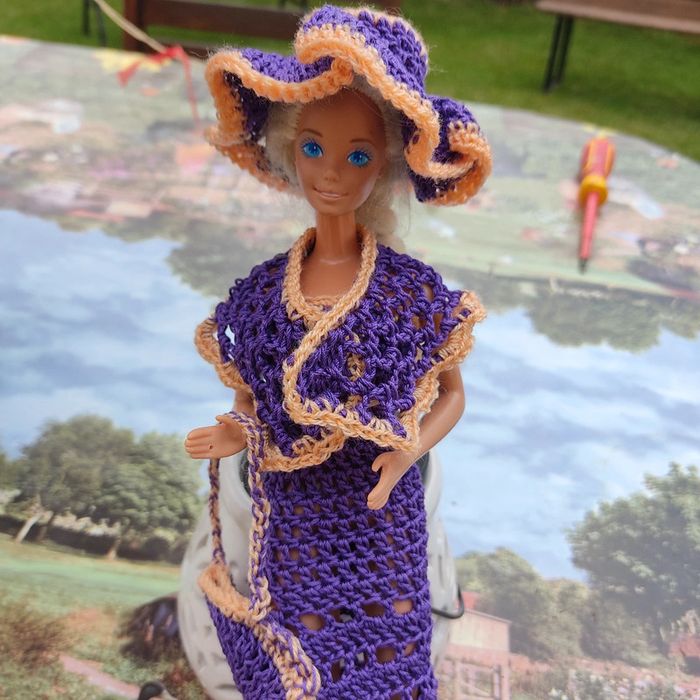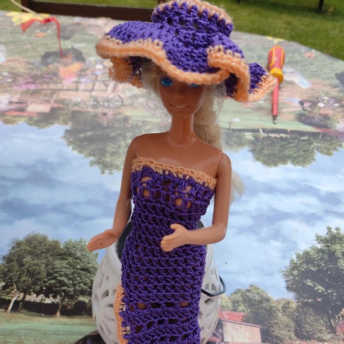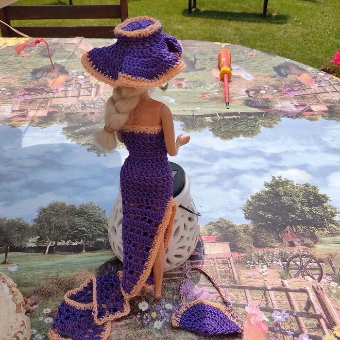 Barbie habillé : robe longue fendu sur un côté, châle, chapeau, sac à main, collier. Fait main par moi cette Barbie n'est pas à vendre .