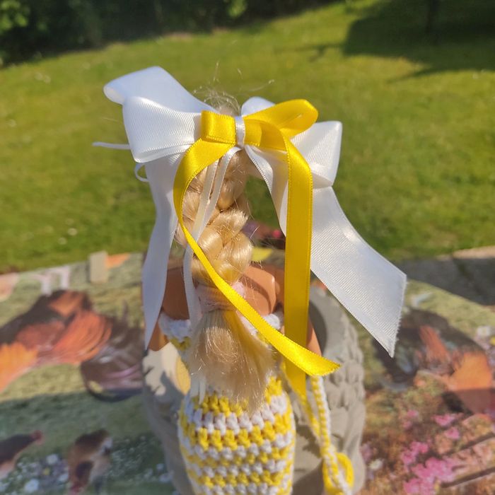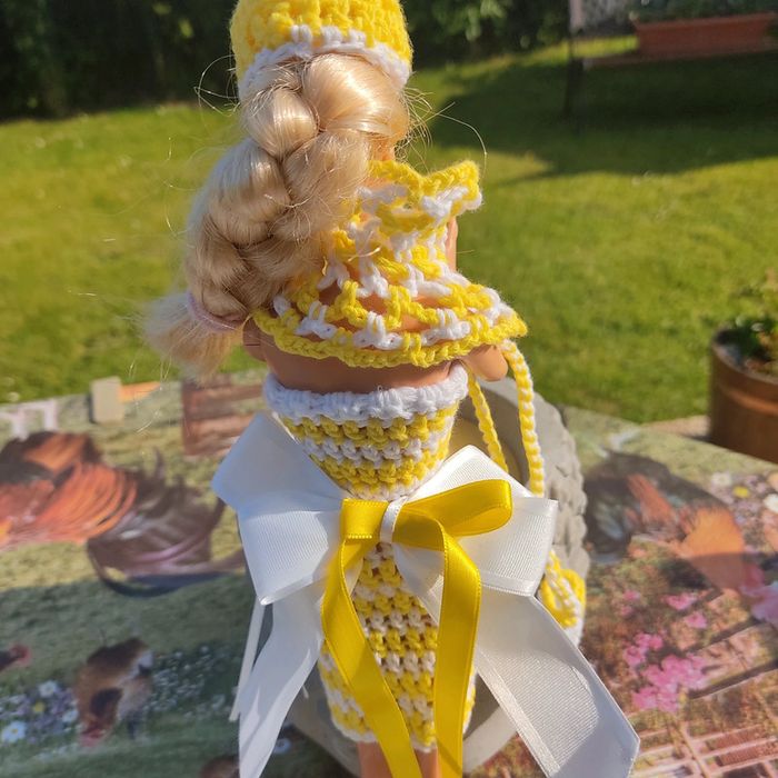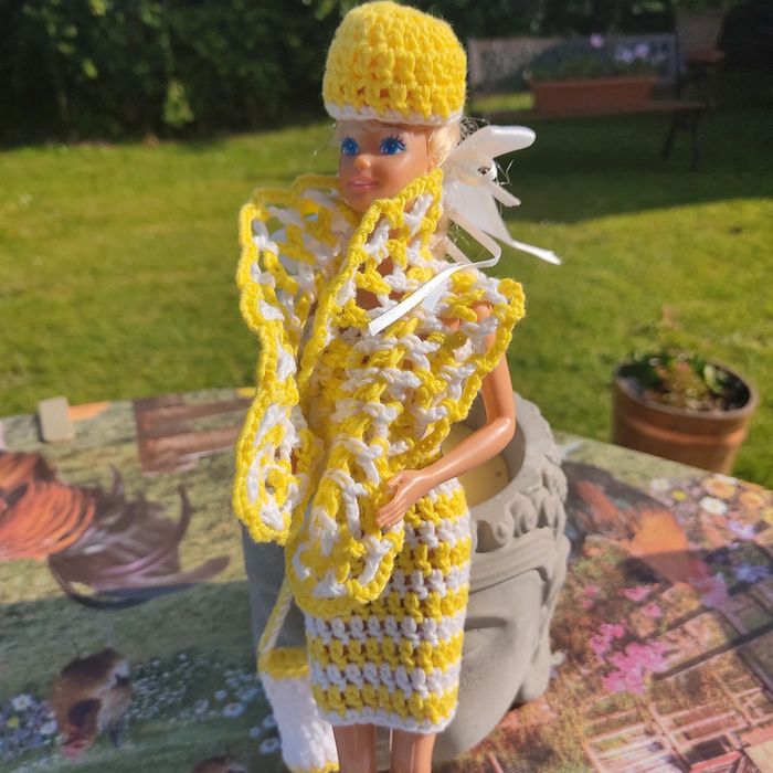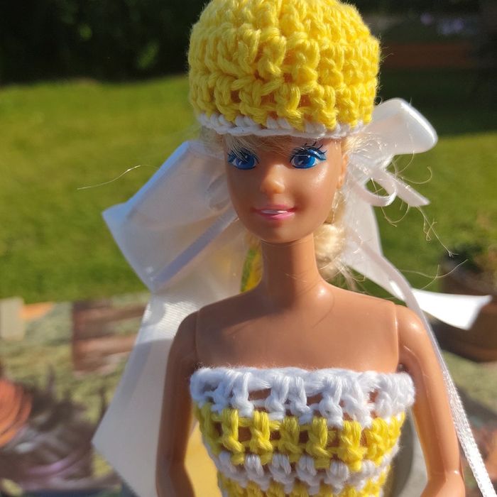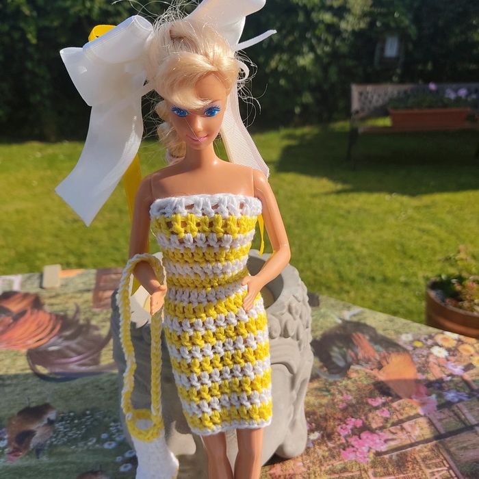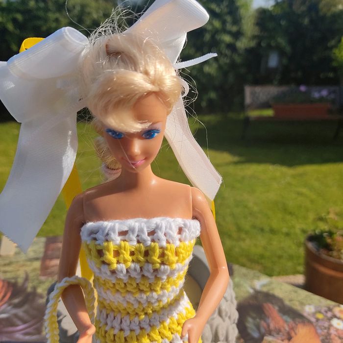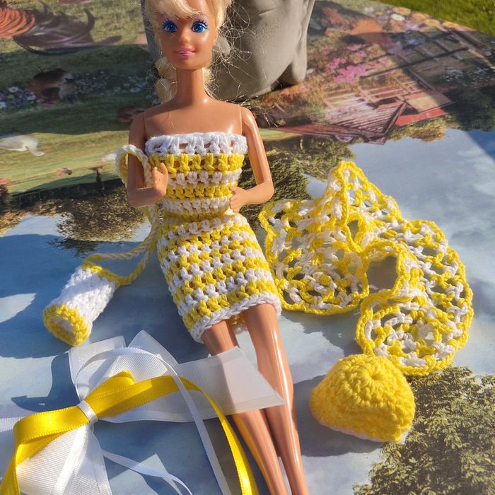 Barbie habillé : robe avec noeud, châle,bibi, sac à main . Le noeud peu ce porté en ceinture.ou dans les cheveux. Fait main par moi cette Barbie n'est pas à vendre.