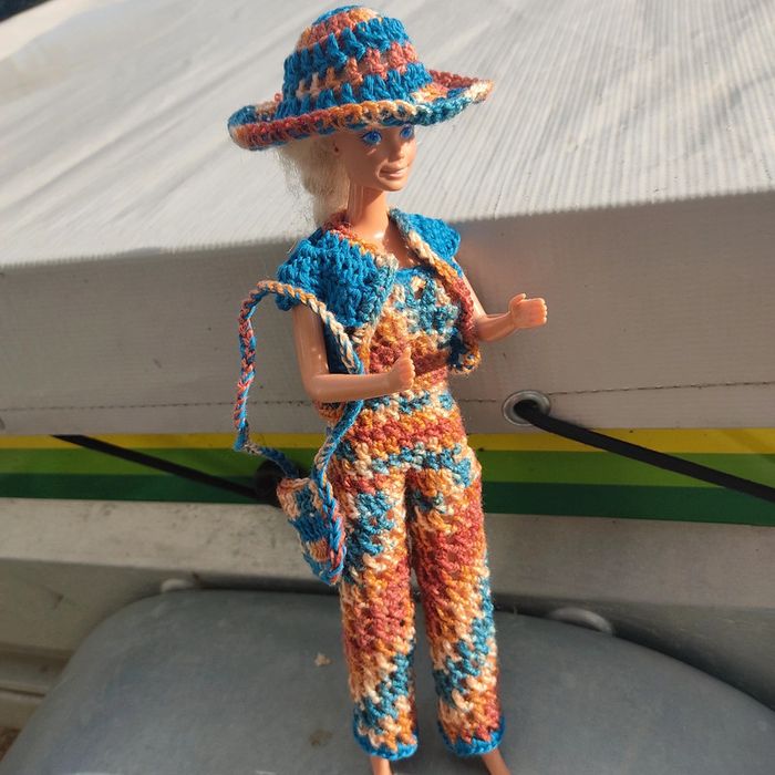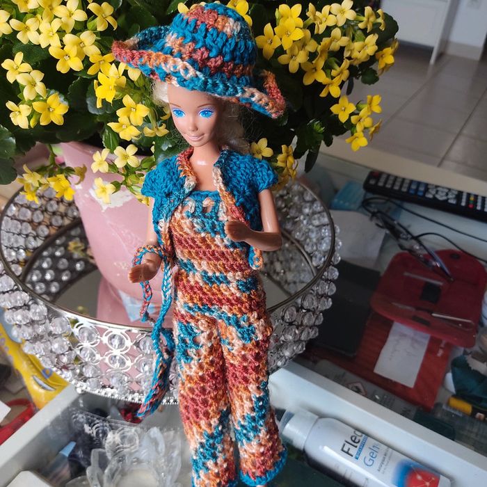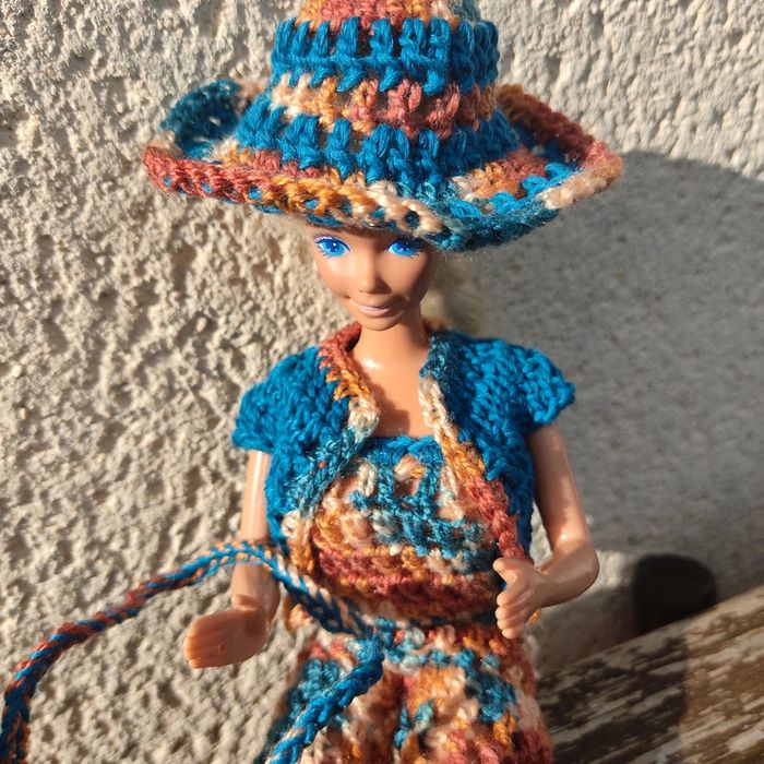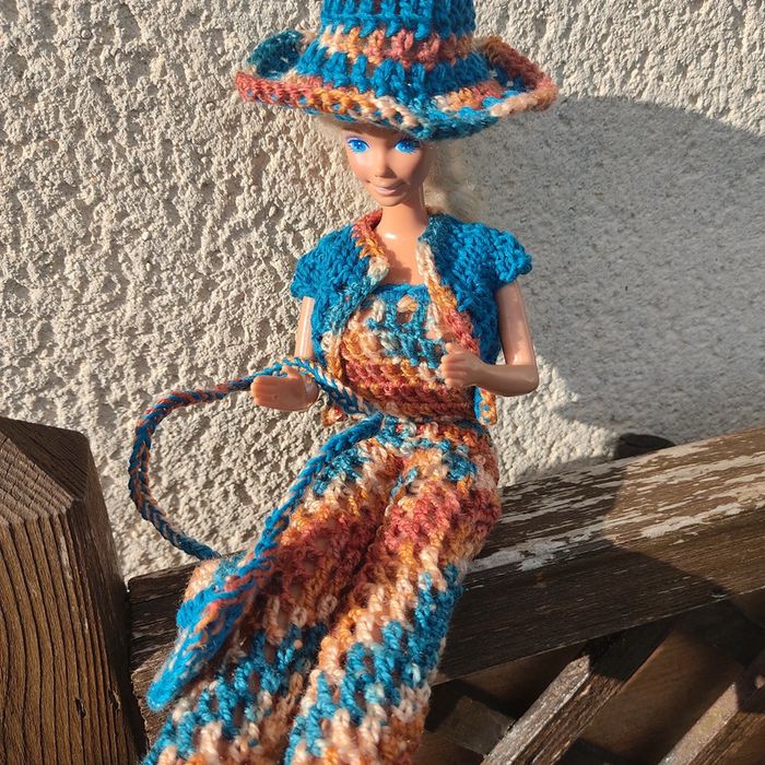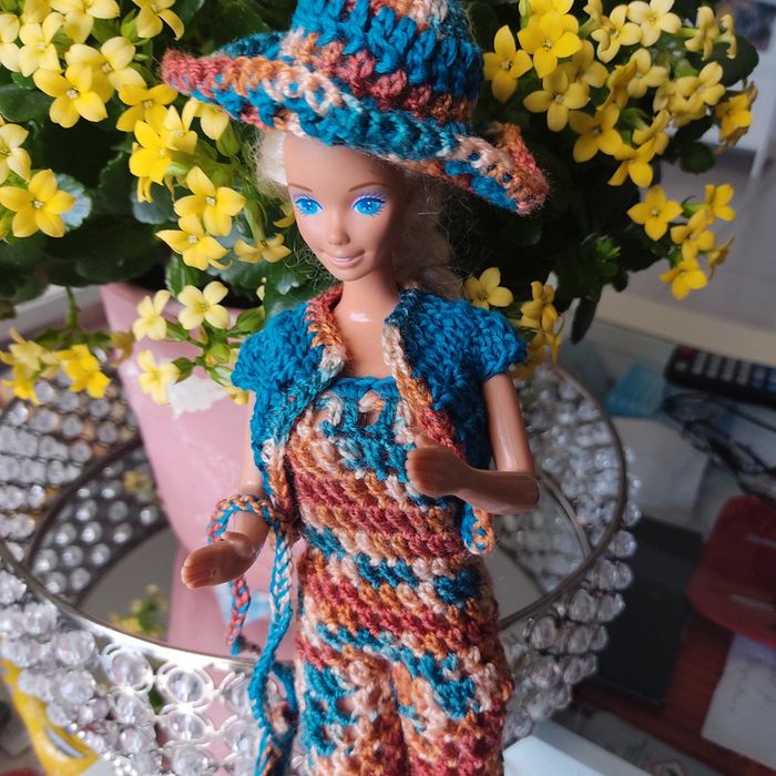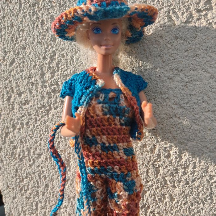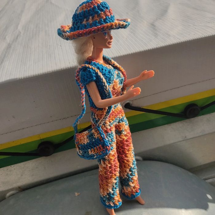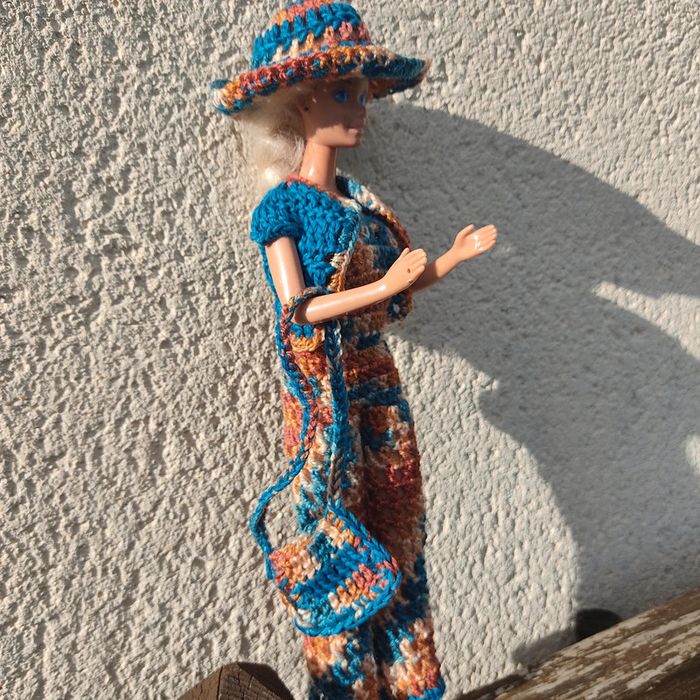 Barbie habillé : salopette ( combinaison). boléro, chapeau, sac à main.fait main par moi cette n'est pas à vendre.