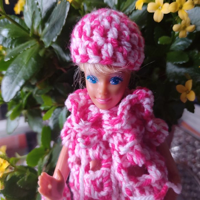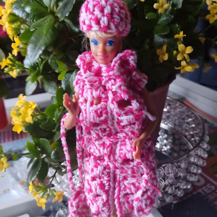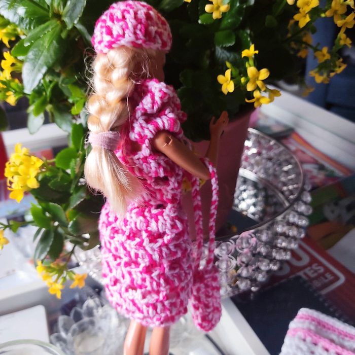 Manteau court sans manches, jupe, chapeau, sac à main. fait main par moi cette Barbie n'est pas à vendre.