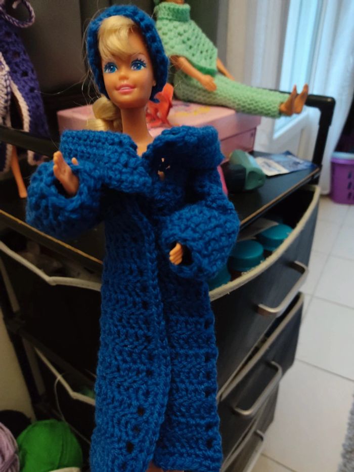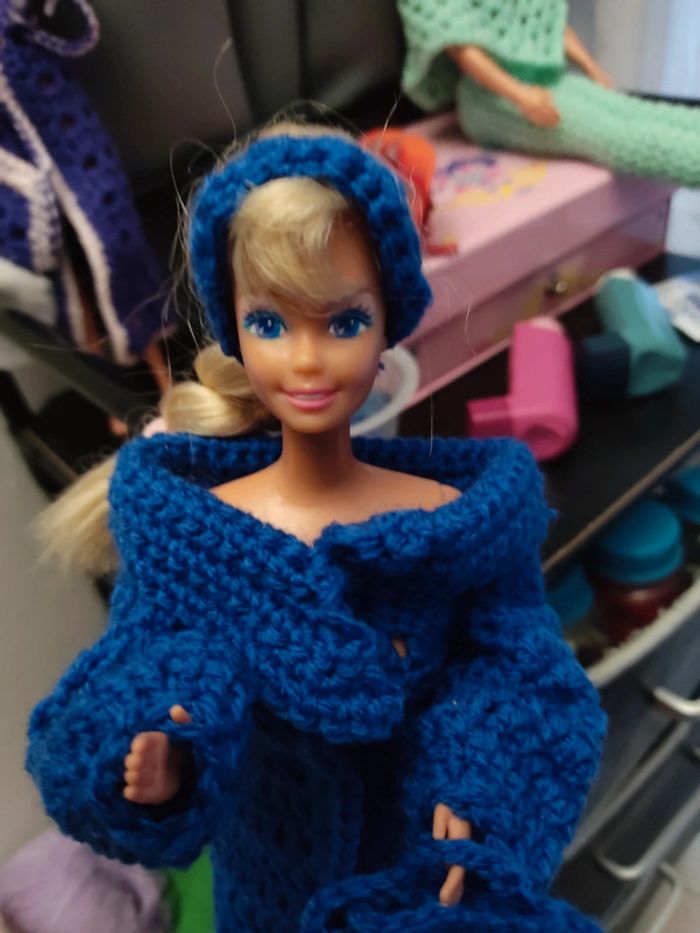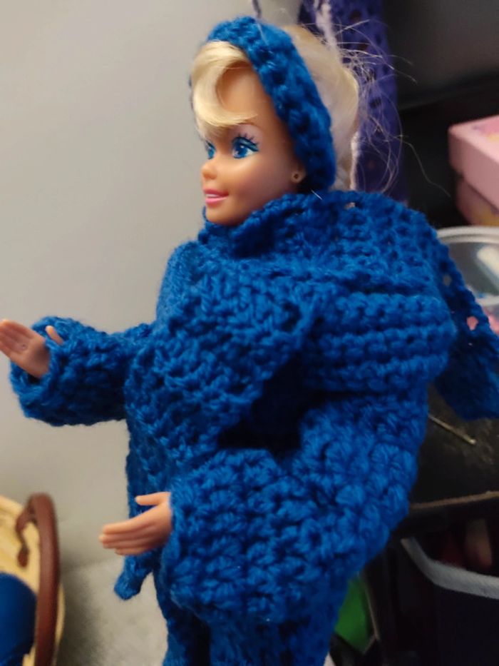 Barbie habillé : manteau ceinture, bandeau, écharpe, sac à main. Fait main par moi cette Barbie n'est pas à vendre.