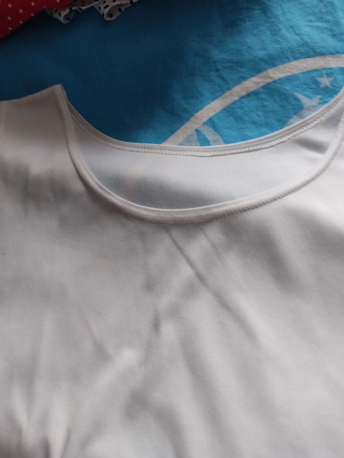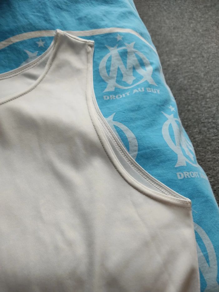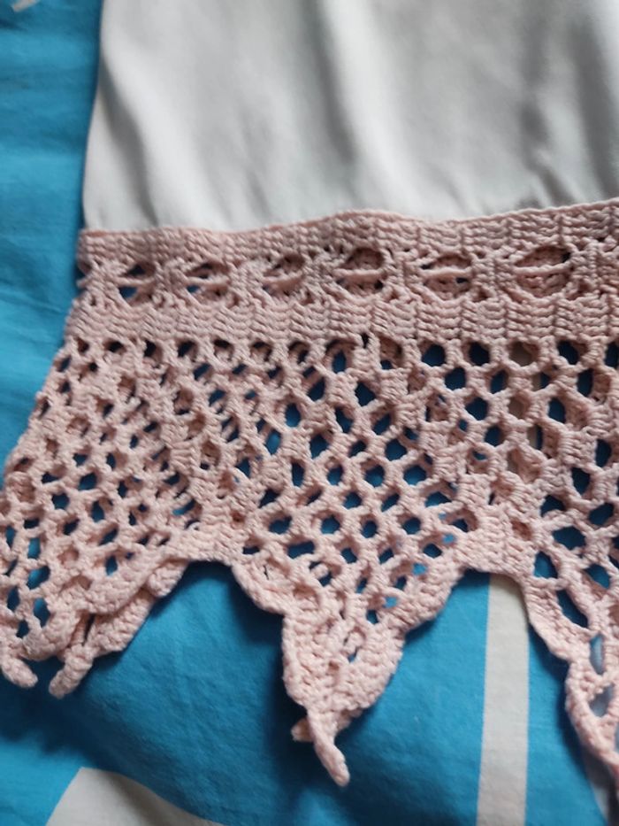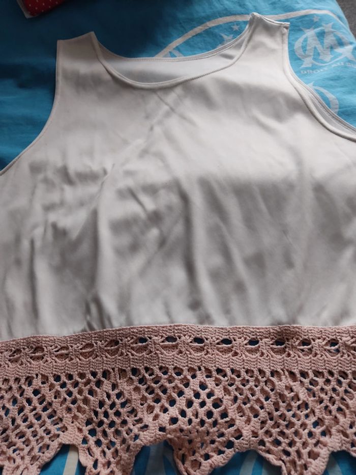 Haut d'été blanc et rose. Hauteur 62 cm. Aiselles à aisselles 52 cm.