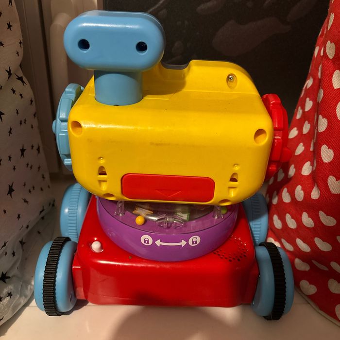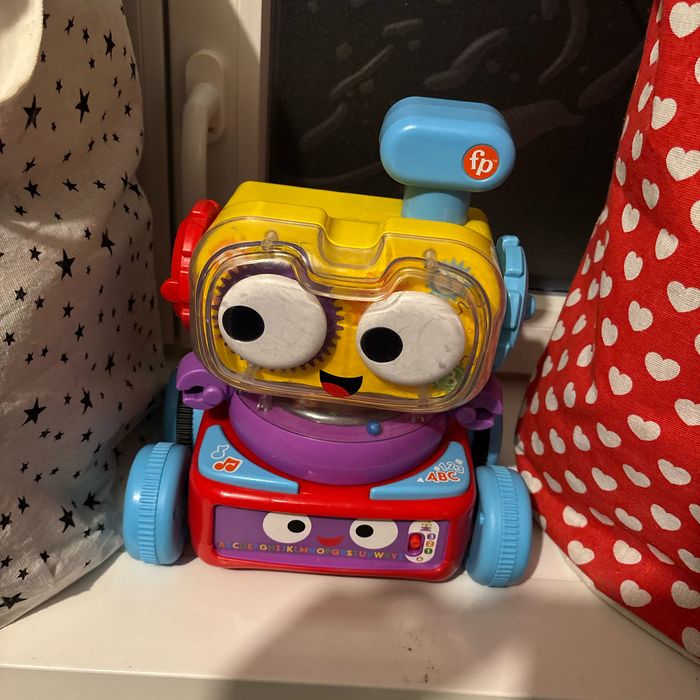 Jo le petit robot 4 en 1 de Fisher Price est le compagnon d'éveil idéal pour bébé. Le petit robot est composé de 3 parties qui s'assemblent pour former JO le robot. Bébé peut jouer avec les différentes parties, s'amuser à les assembler et jouer avec le robot entier. Chaque partie du robot a ses particularités. Appuyez sur n’importe quel bouton du robot motorisé pour le voir partir en jouant des mélodies et en s’éclairant pour encourager bébé à le suivre à quatre pattes. Il comprend également une multitude d’activités pour le jeu assis dont une antenne sur laquelle on peut appuyer, des oreilles qui tournent et une base culbuto avec des perles qui font du bruit en tourbillonnant. Equipé du programme d’Éveil Progressif Fisher Price, JO le robot permet d'avoir un contenu éducatif adapté à l'âge de l'enfant. Il contient plus de 120 chansons, sons et phrases pour apprendre à bébé les chiffres, les lettres, les formes, les couleurs et même à compter ! De nombreuses heures d'éveil et de jeu attendent bébé en compagnie de JO le robot d'éveil 4 en 1 Fisher Price. Encore vendu au prix de 54euros chez King jouets