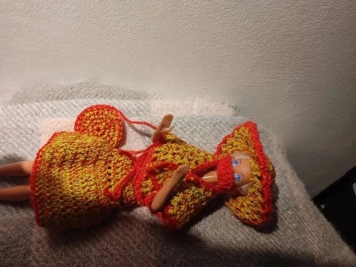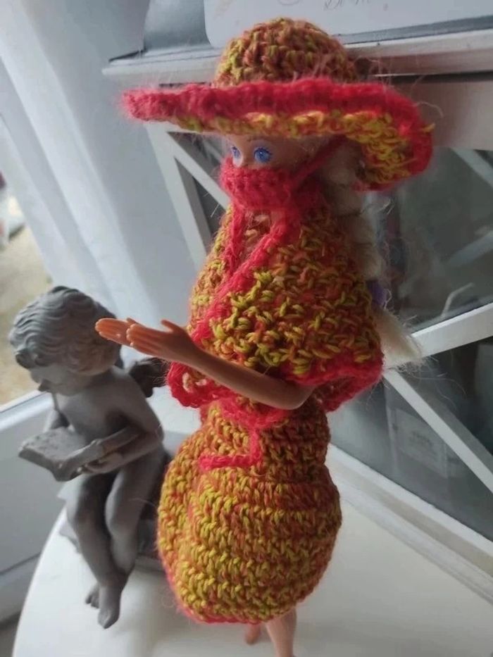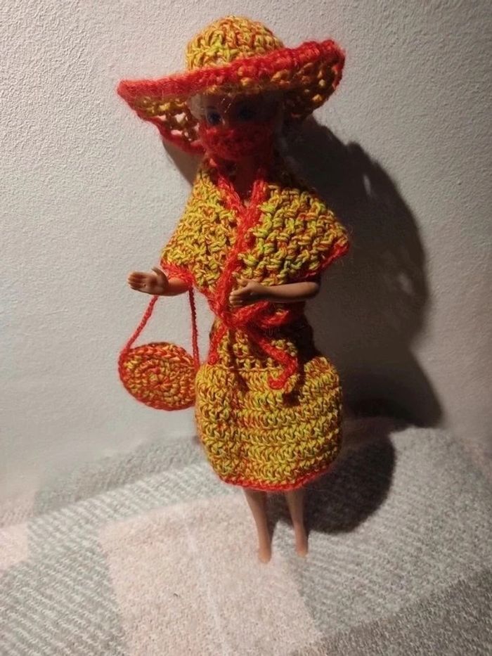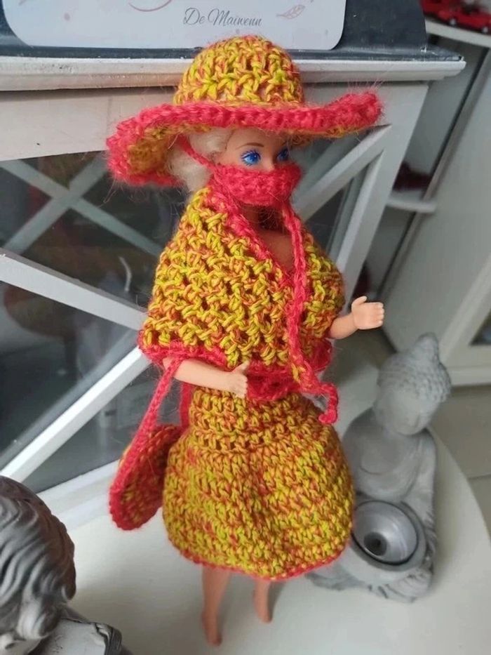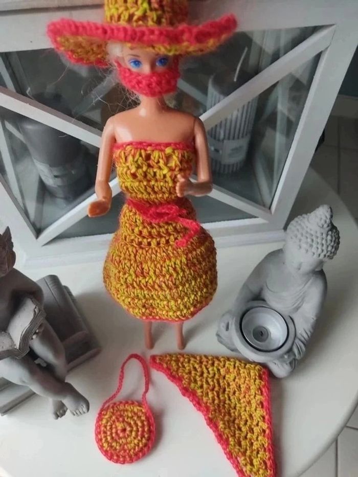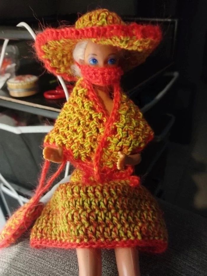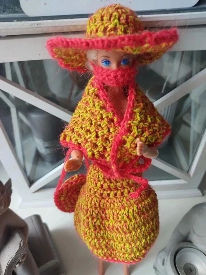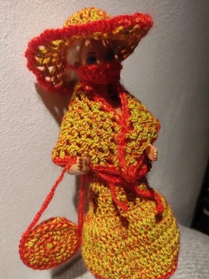Barbie habillé : robe ceinture , châle, sac à ✋, chapeau, masque.fait main par moi.cette Barbie n'est pas à vendre