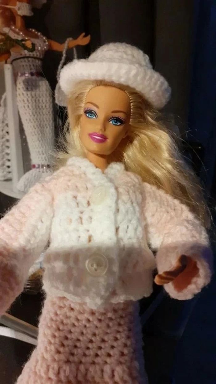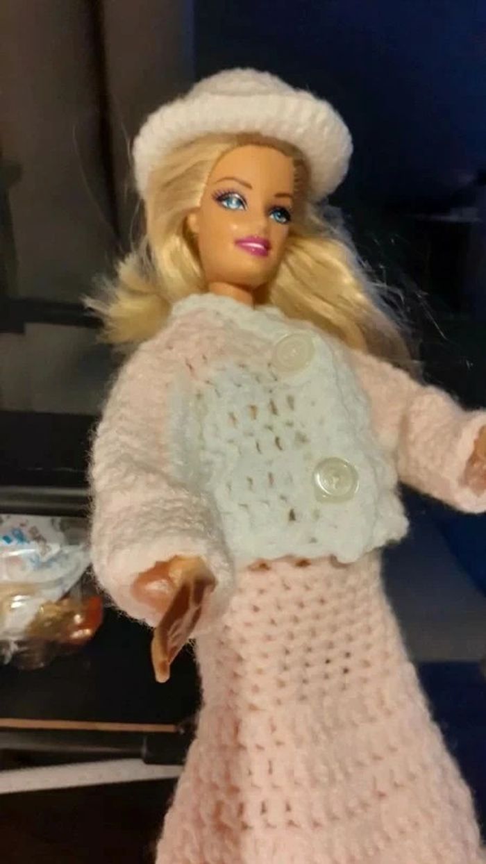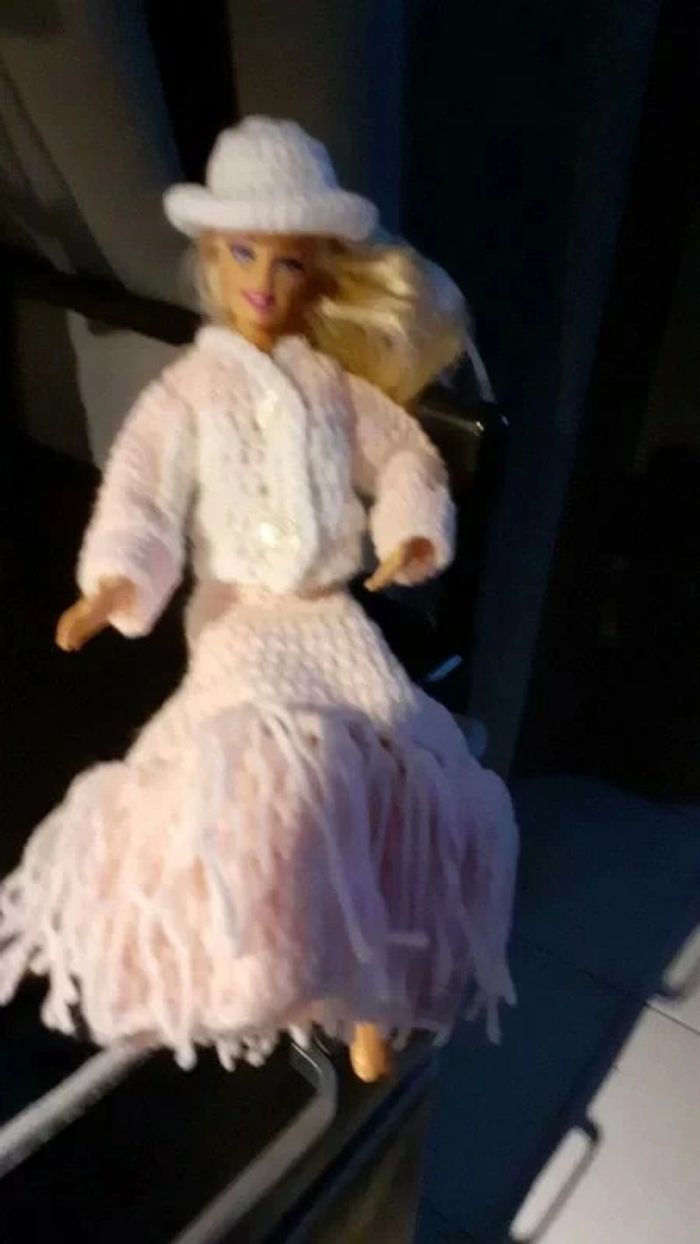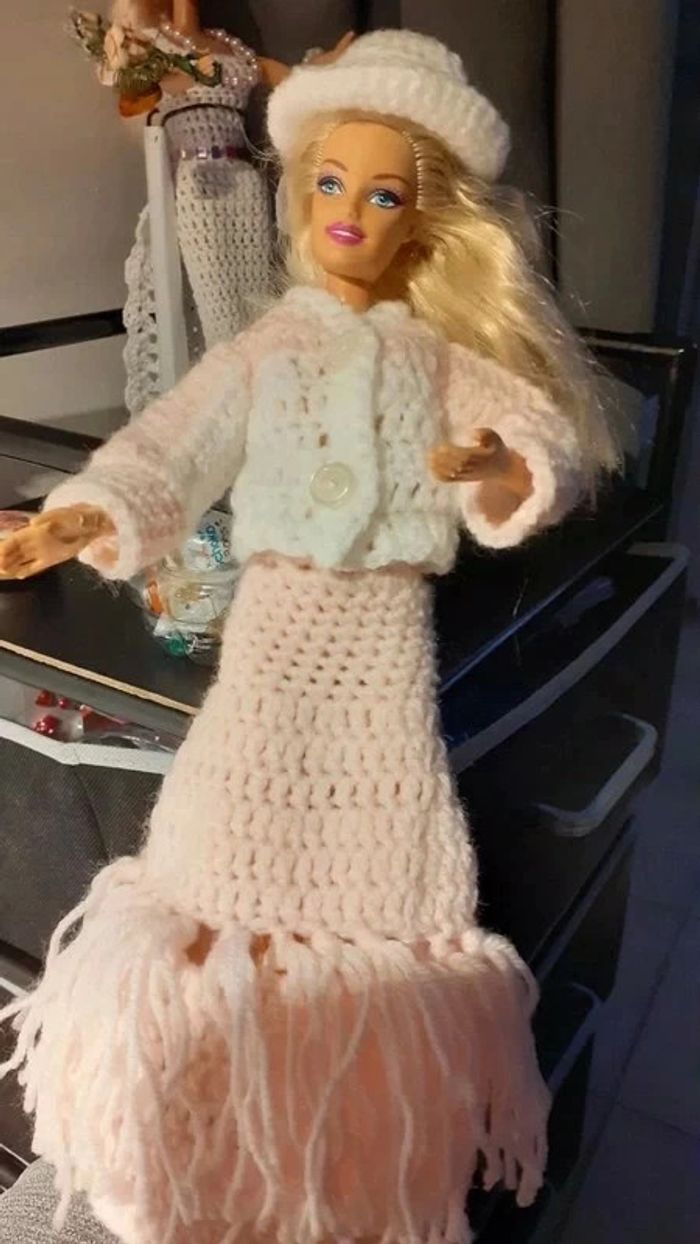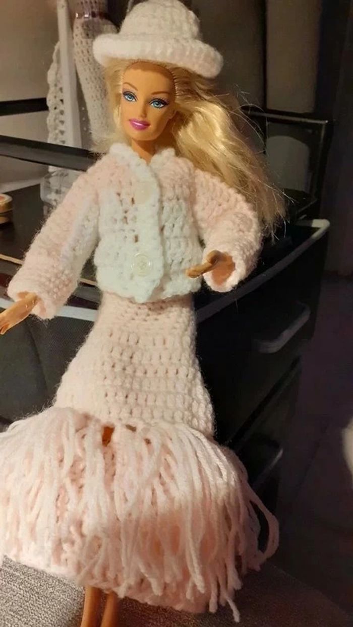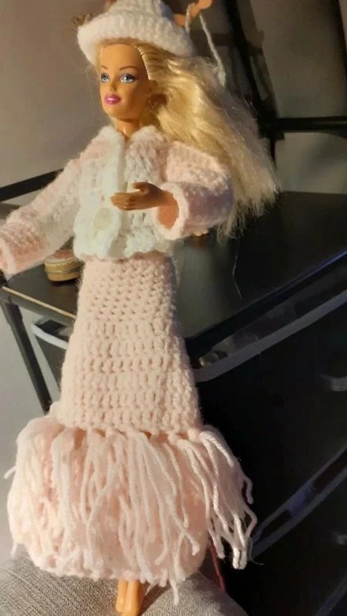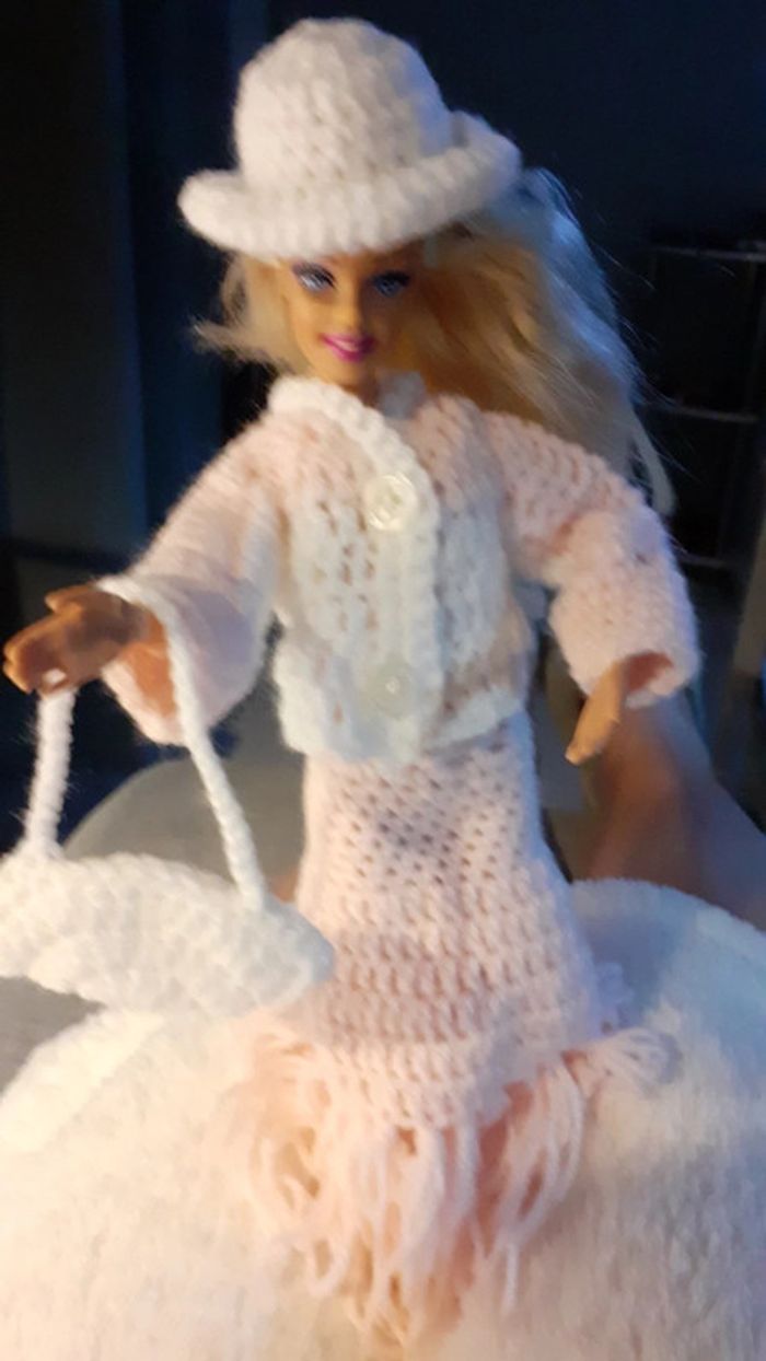Poupée habillée :jupe longue à franges ,veste,chapeau ,plus le petit sac à main. rose et blanc fait main par moi la barbie pour 1€ de plus