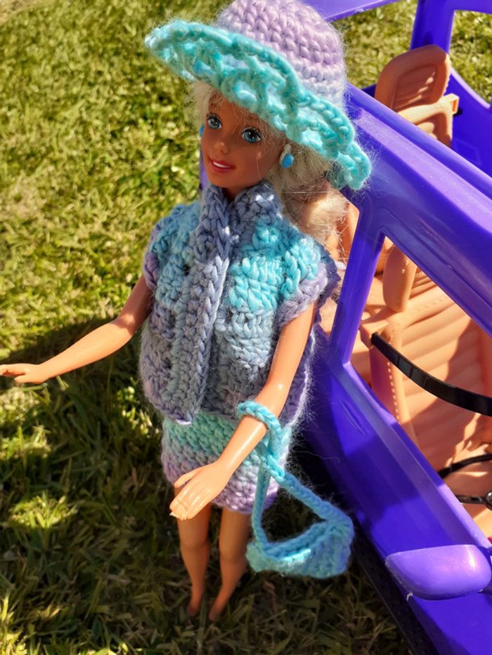 Poupée vêtements :jupe, boléro, chapeau, petit sac. Fait main par moi cette barbie n'est pas à vendre