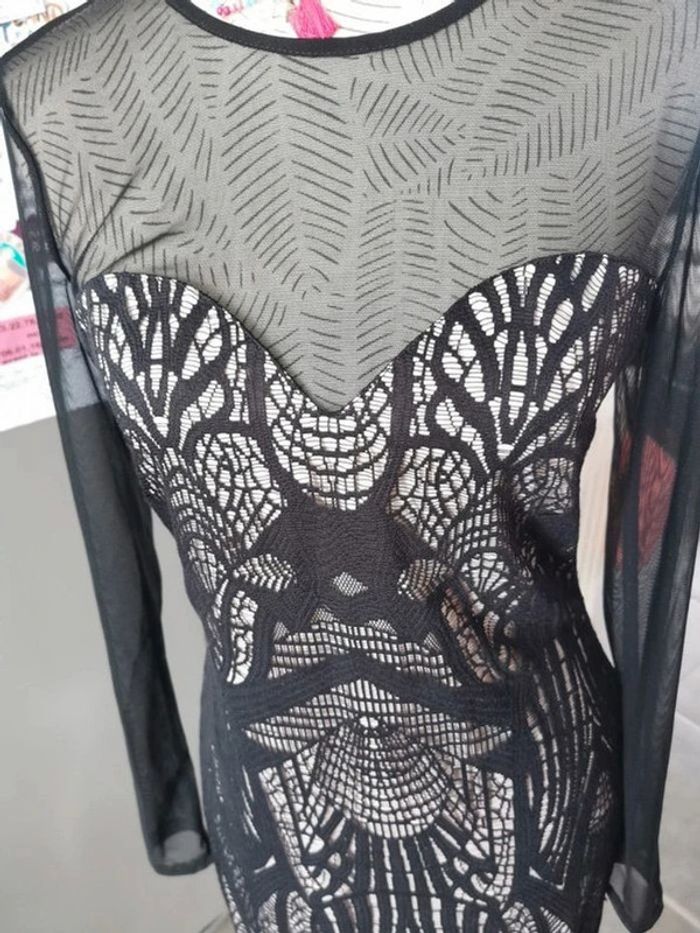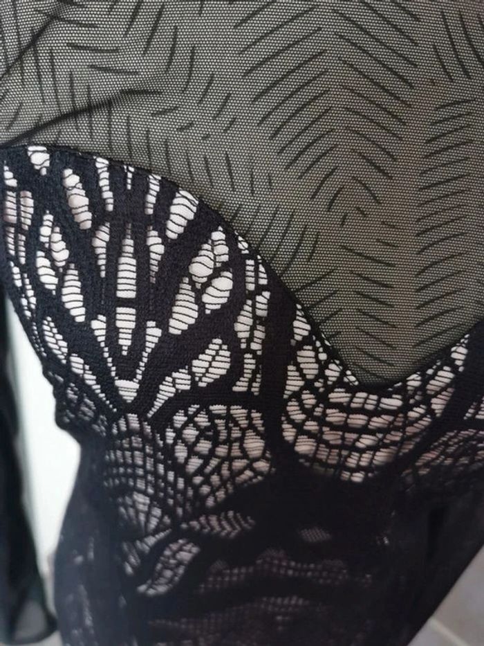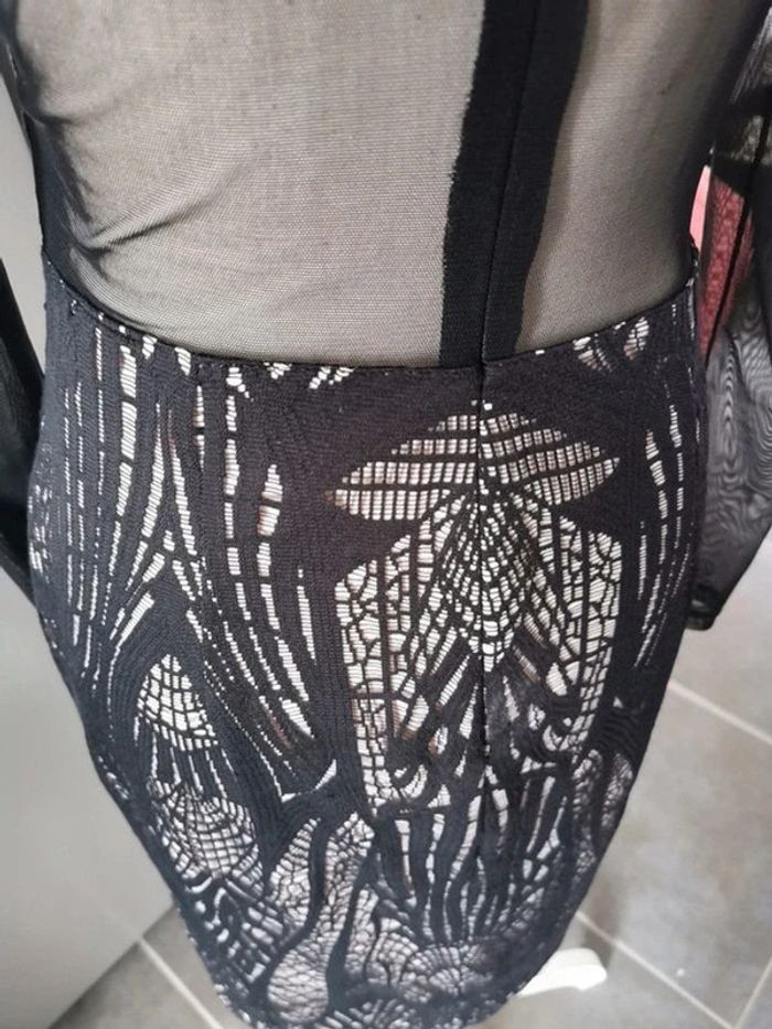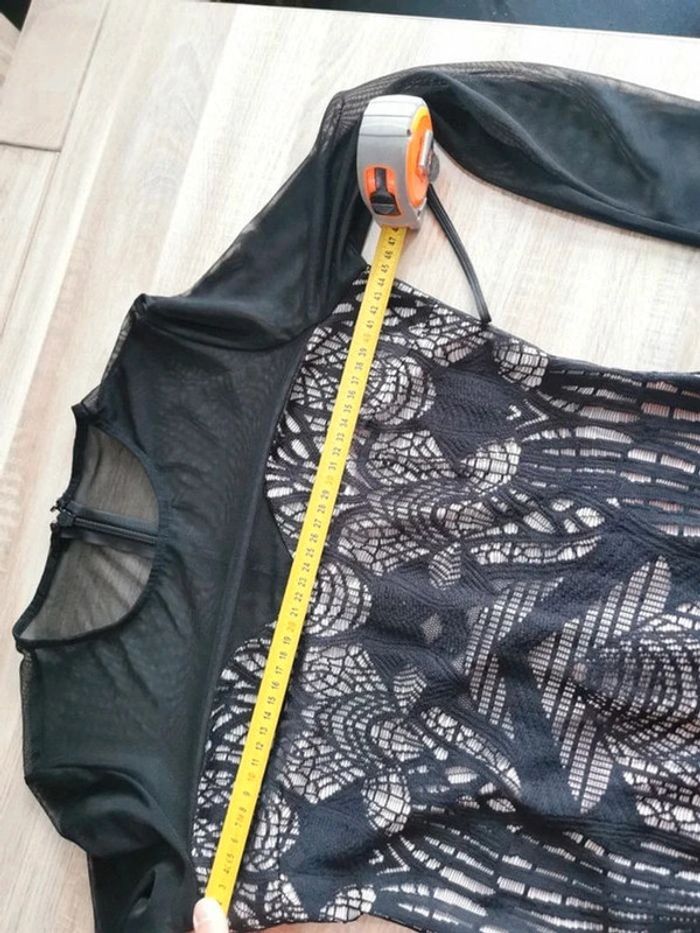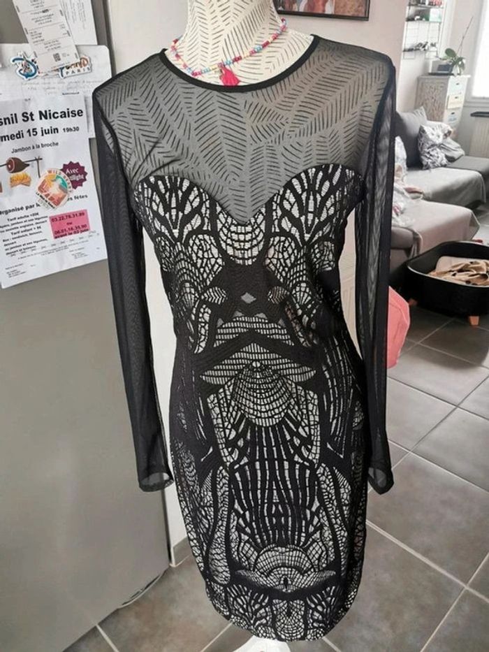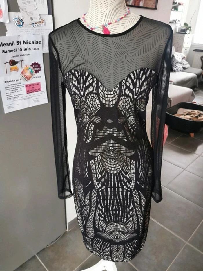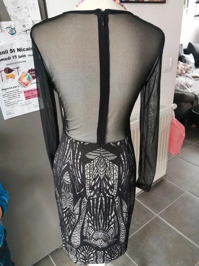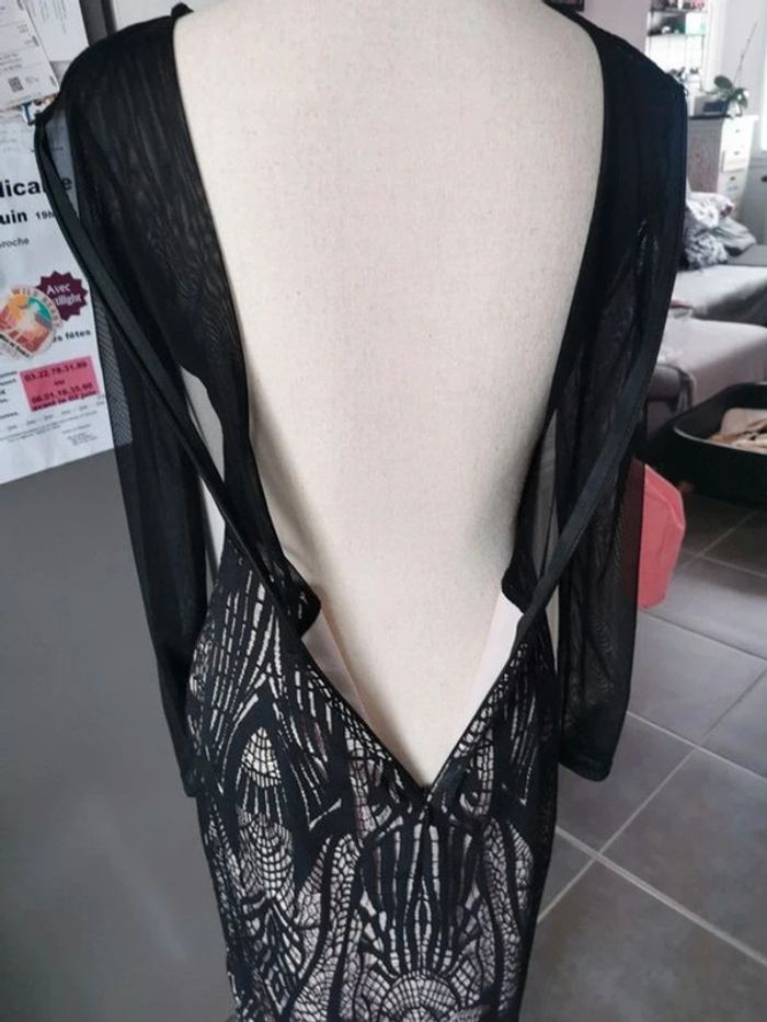 Magnifique robe parfait pour une soirée Les bras, le haut du décolté et tout le dos sont en transparence Fermeture éclaire dans le dos Couleur beige /vieux rose et noir Légèrement stretch Aisselle à aisselle 45 cm Au niveau de la taille 37 cm Plus bas 45 cm