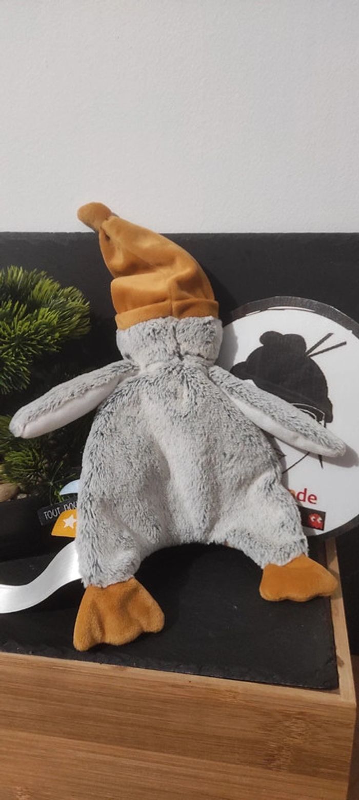 Doudou plat Pingouin blanc gris Orange jaune tape à l'oeil tao zig zag bonnet - photo numéro 1