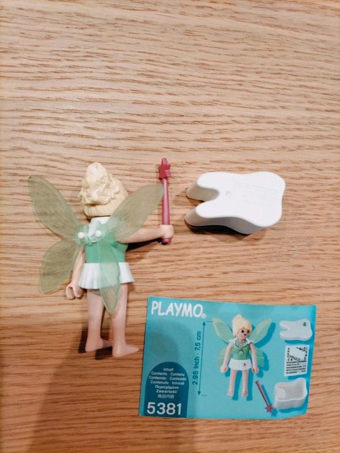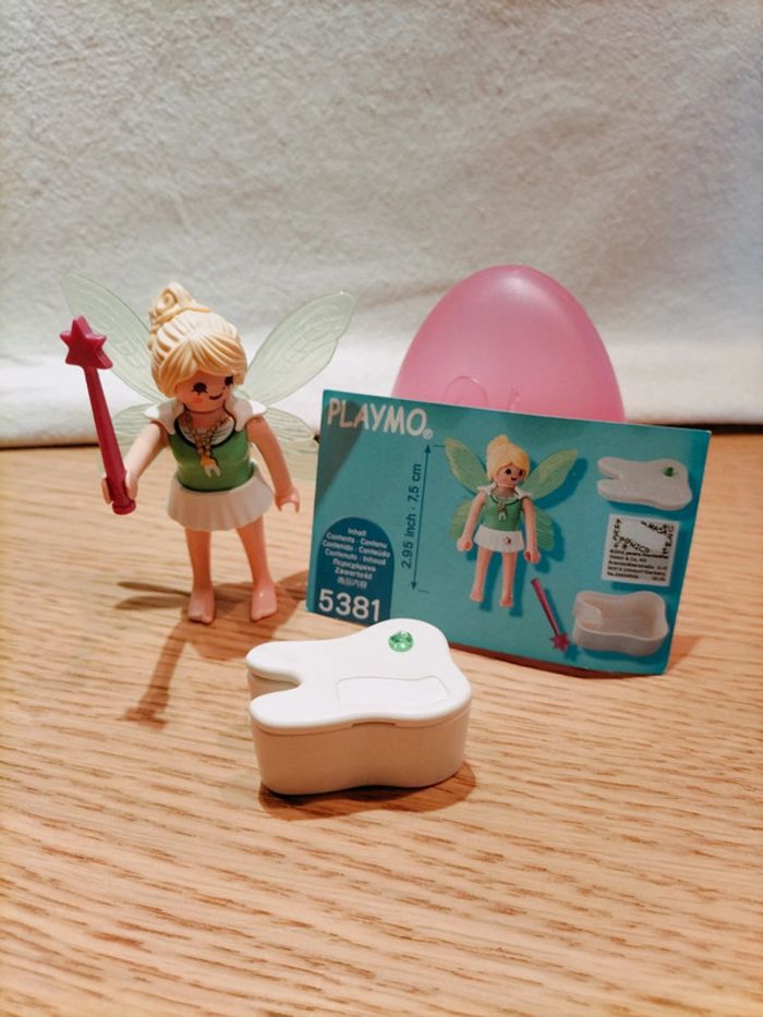 Playmobil numéro 5381 la fée des dents. Fée avec ses ailes, sa baguette magique, et surtout sa boîte pour y placer sa dent, afin d'attendre le passage de la fée des dents ou de la petite souris pour la version française, c'est selon... 😉 À partir de 4 ans. En parfait état, complet.