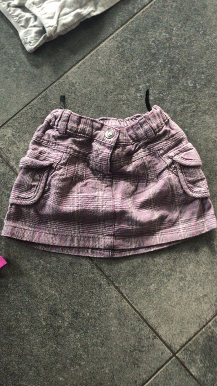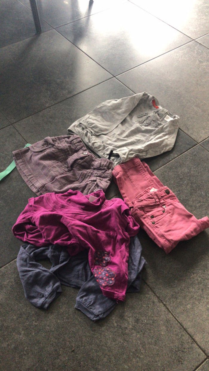 un pantalon rose shiny de gemo2 ans une jupe taille 86 rose violet un pull gris la redoute taille 86 un pull col roulé fuschia la redoute 86 un boléro bleu violet shiny de gemo